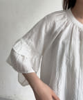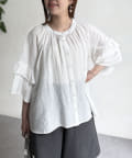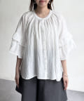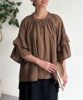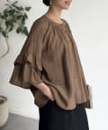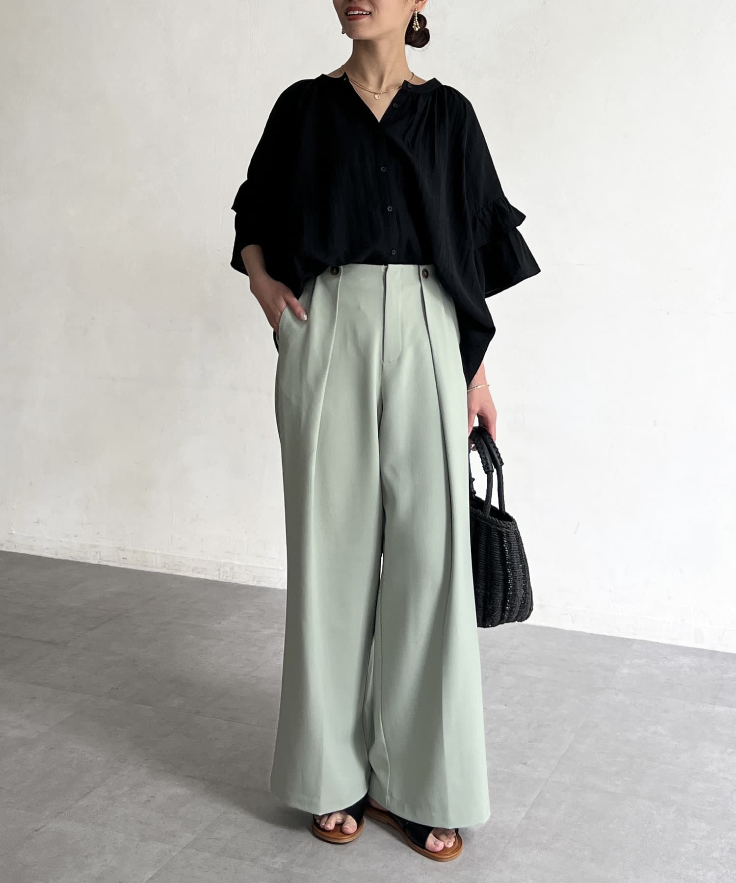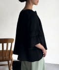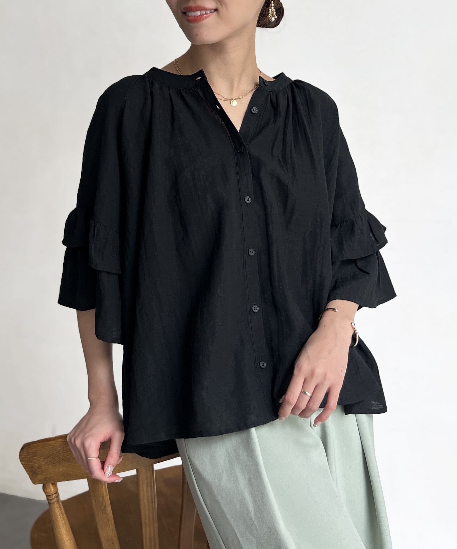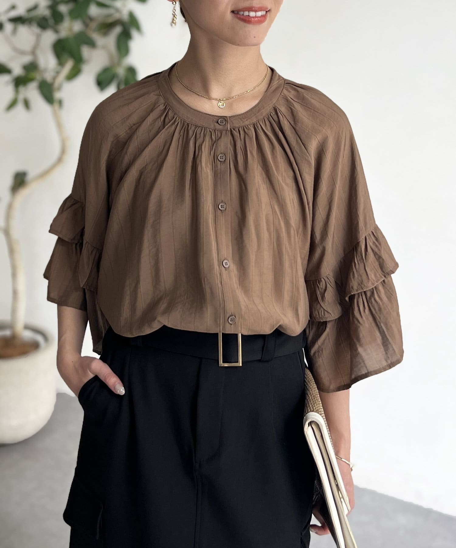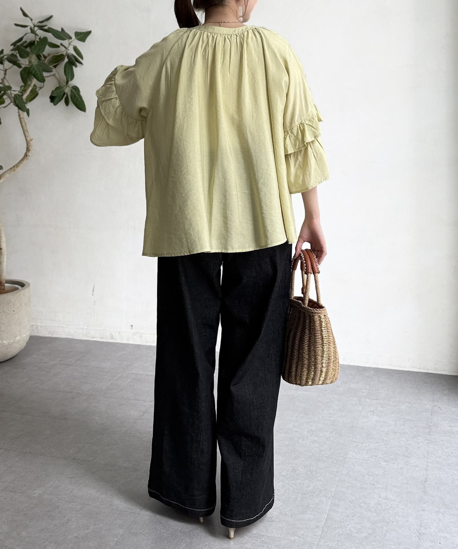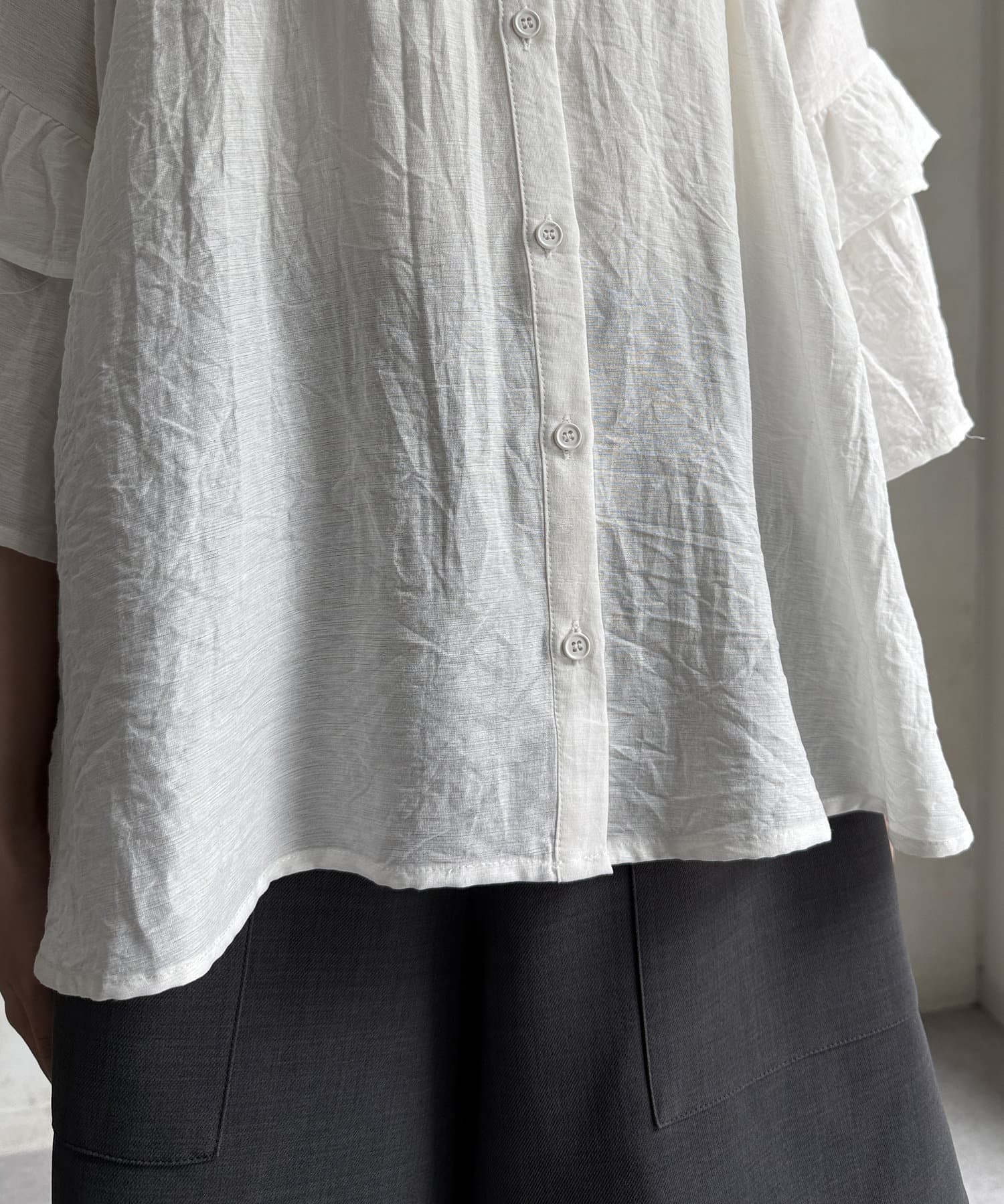 袖口のフレアデザインが女性らしく華やかな雰囲気のブラウス。