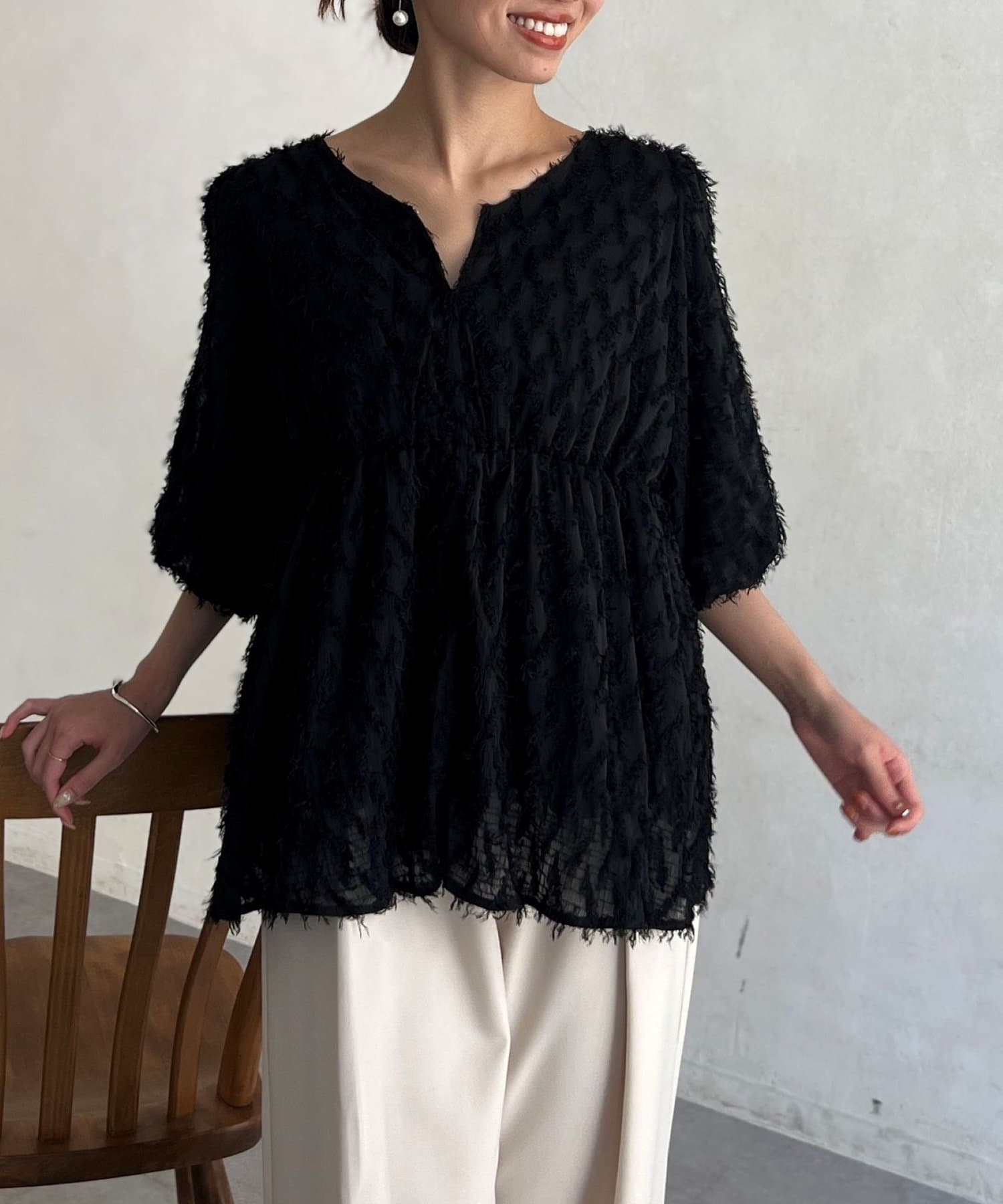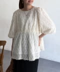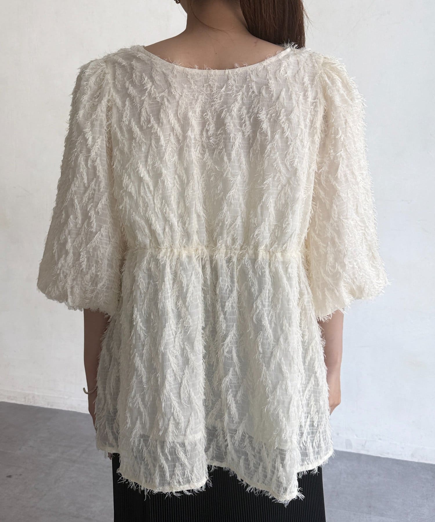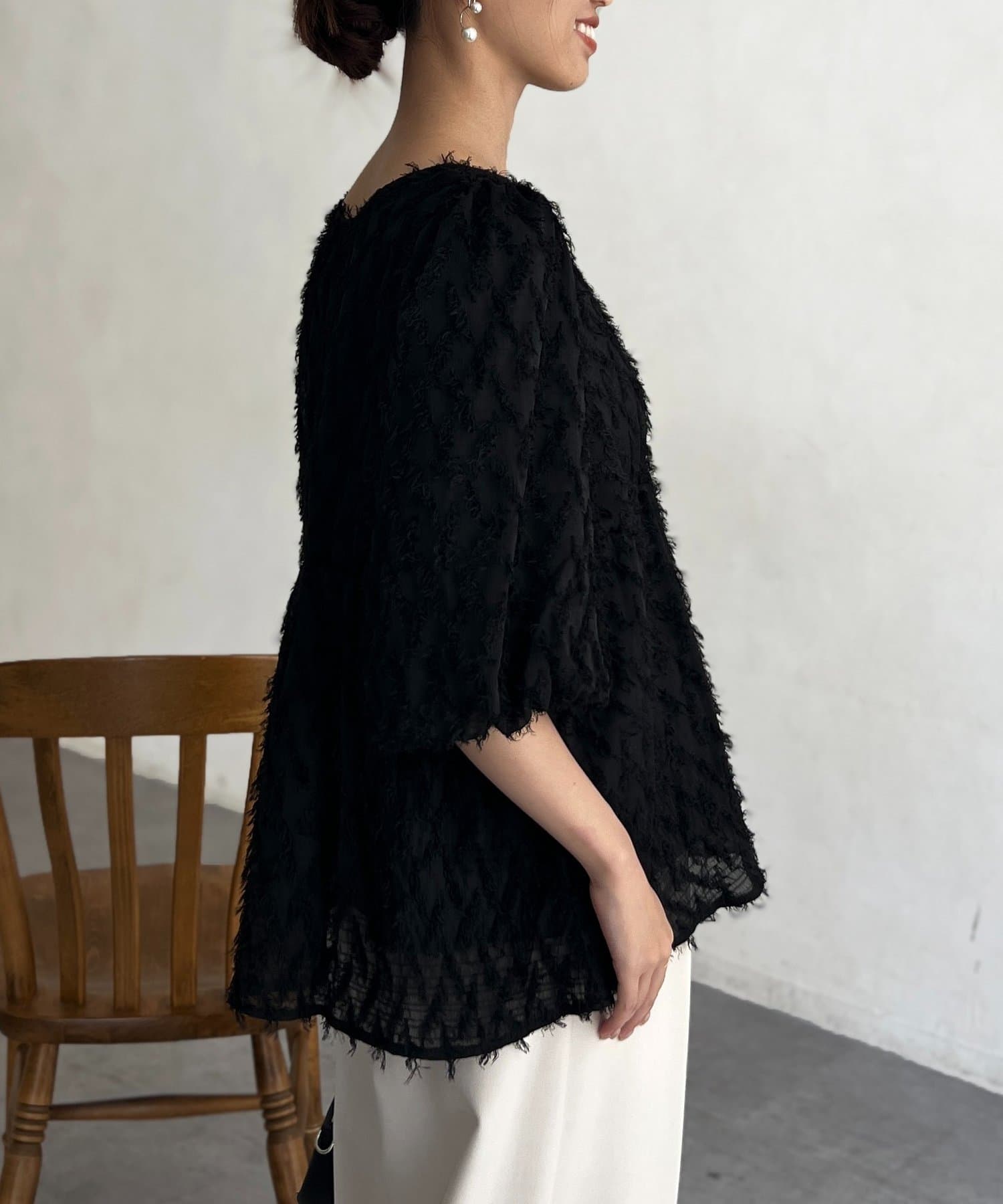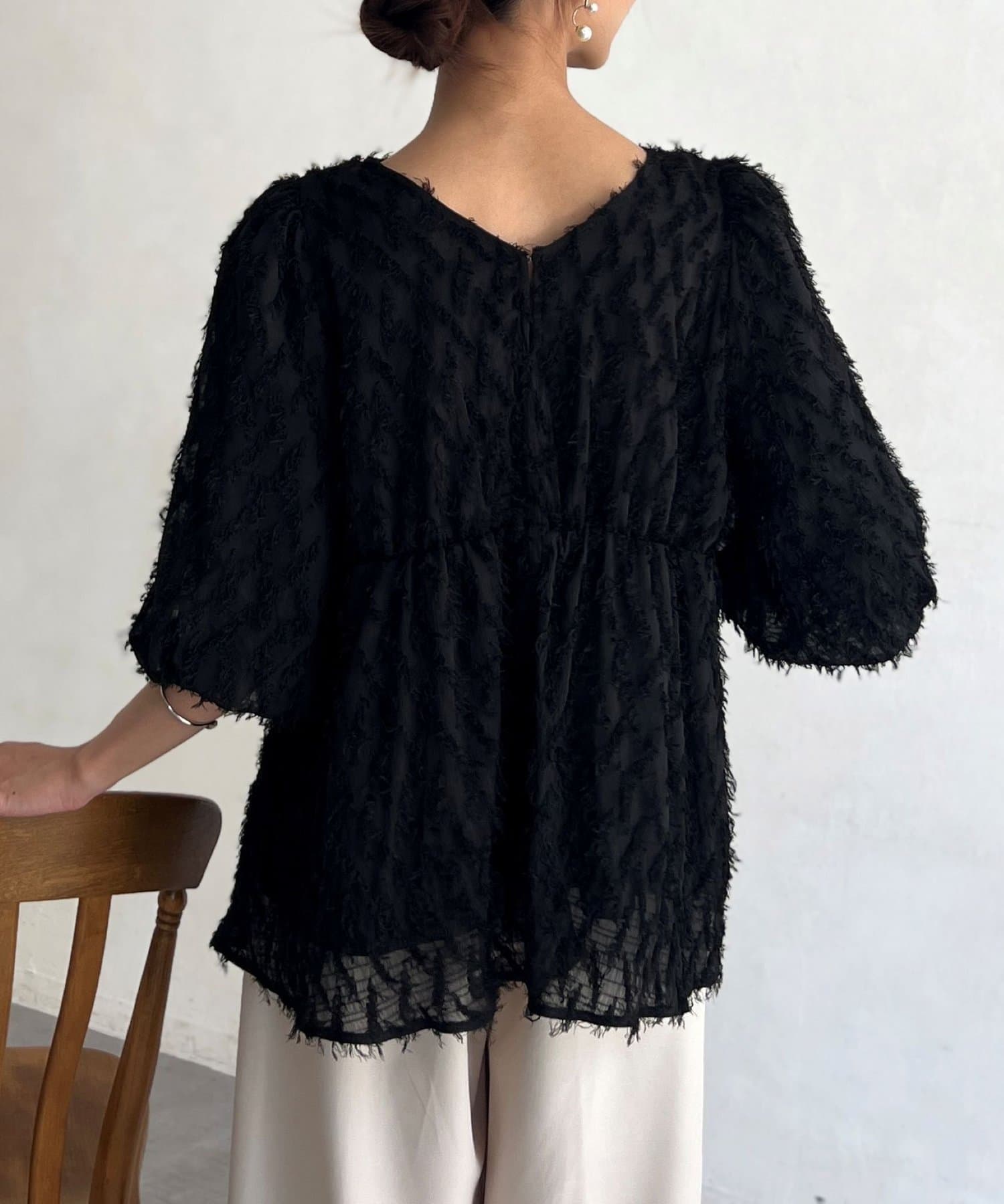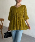 ジャカードがたっぷりと施されたペプラムブラウス。