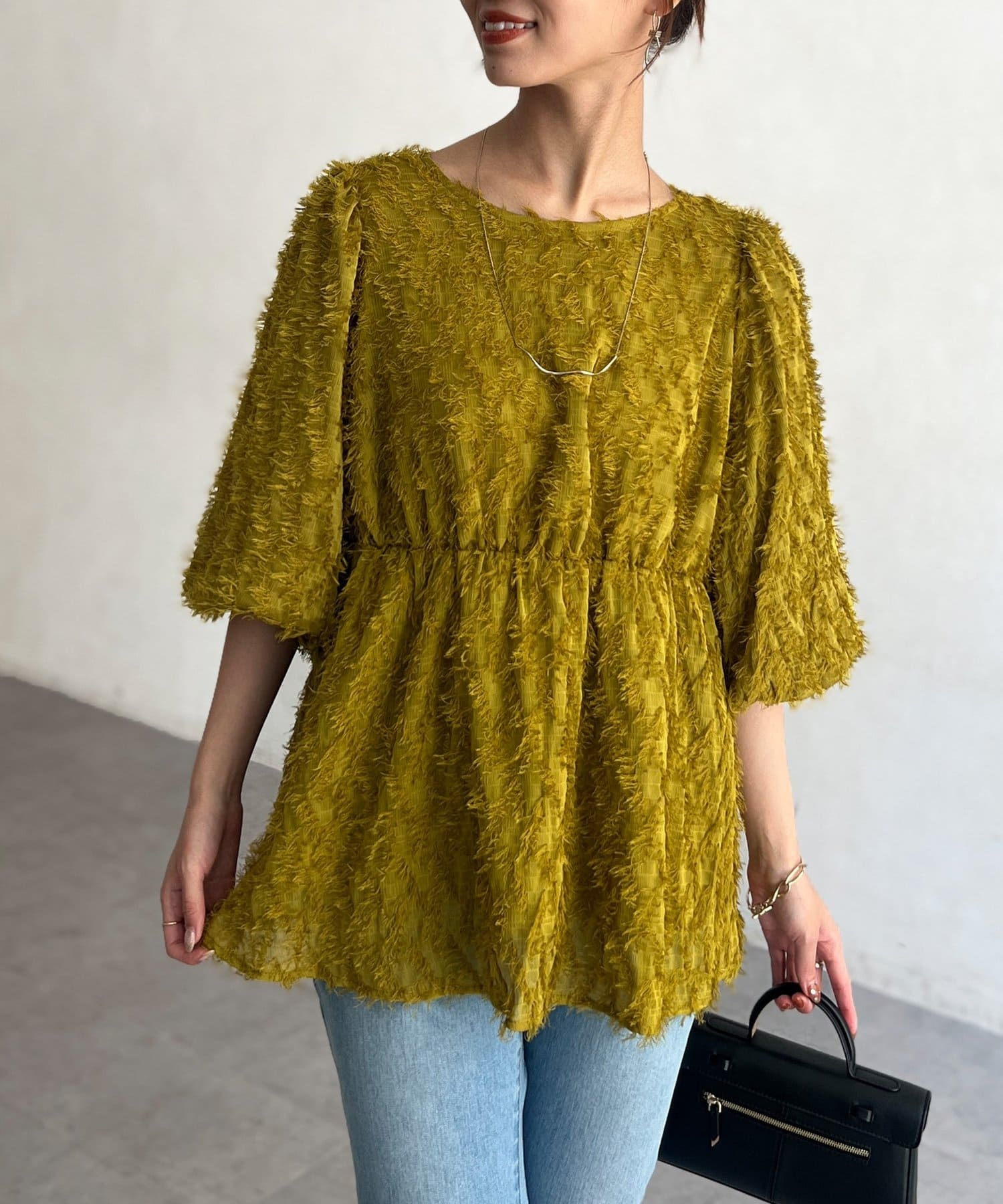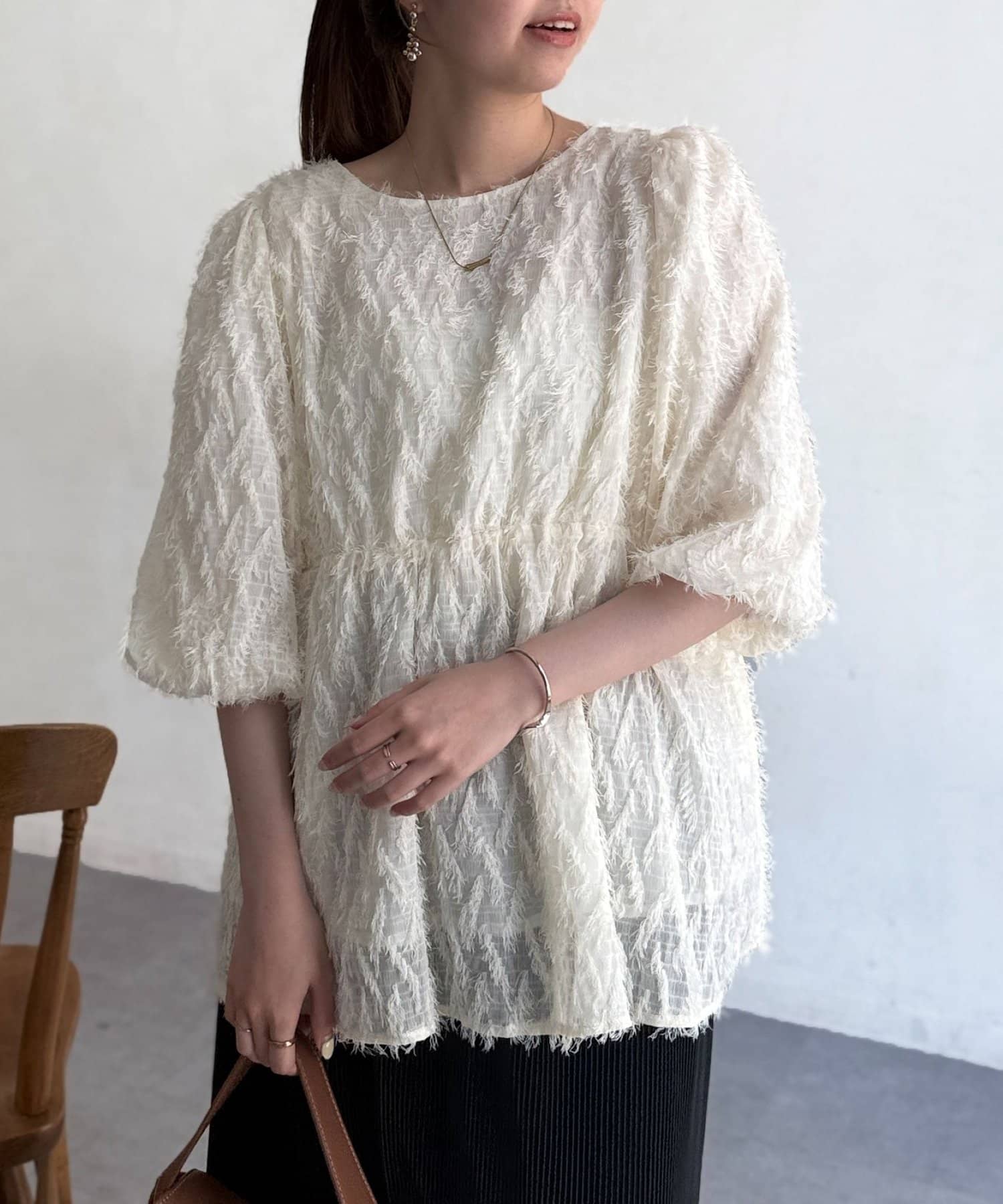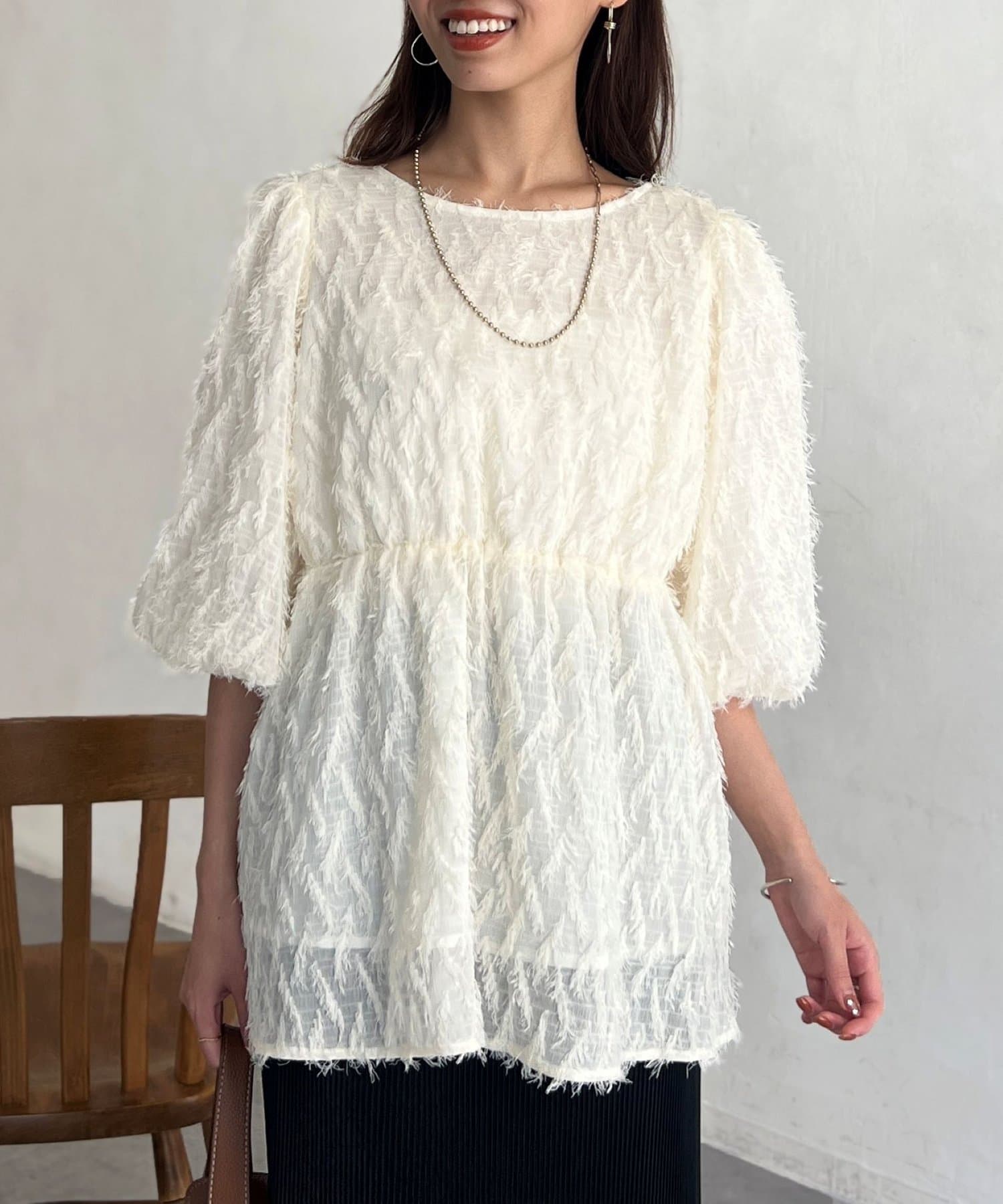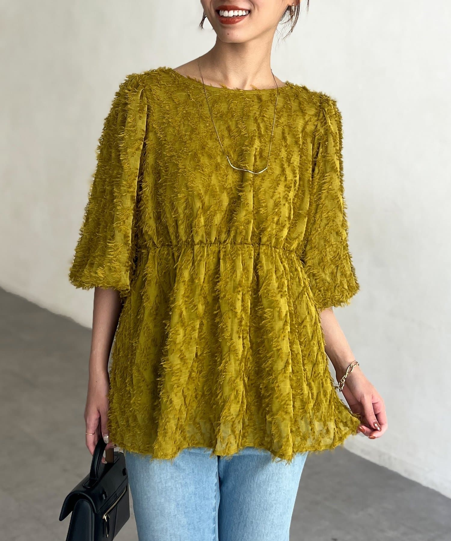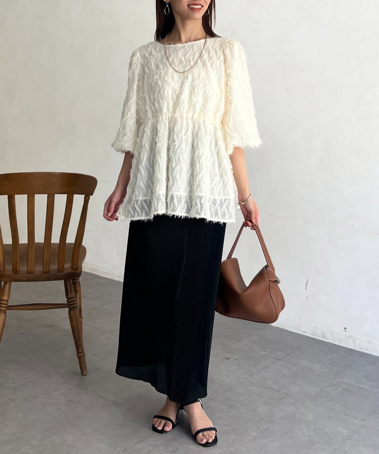 ほんのりシアー感があり、ペプラムデザインでスタイルアップ効果も◎