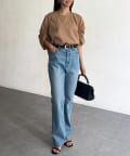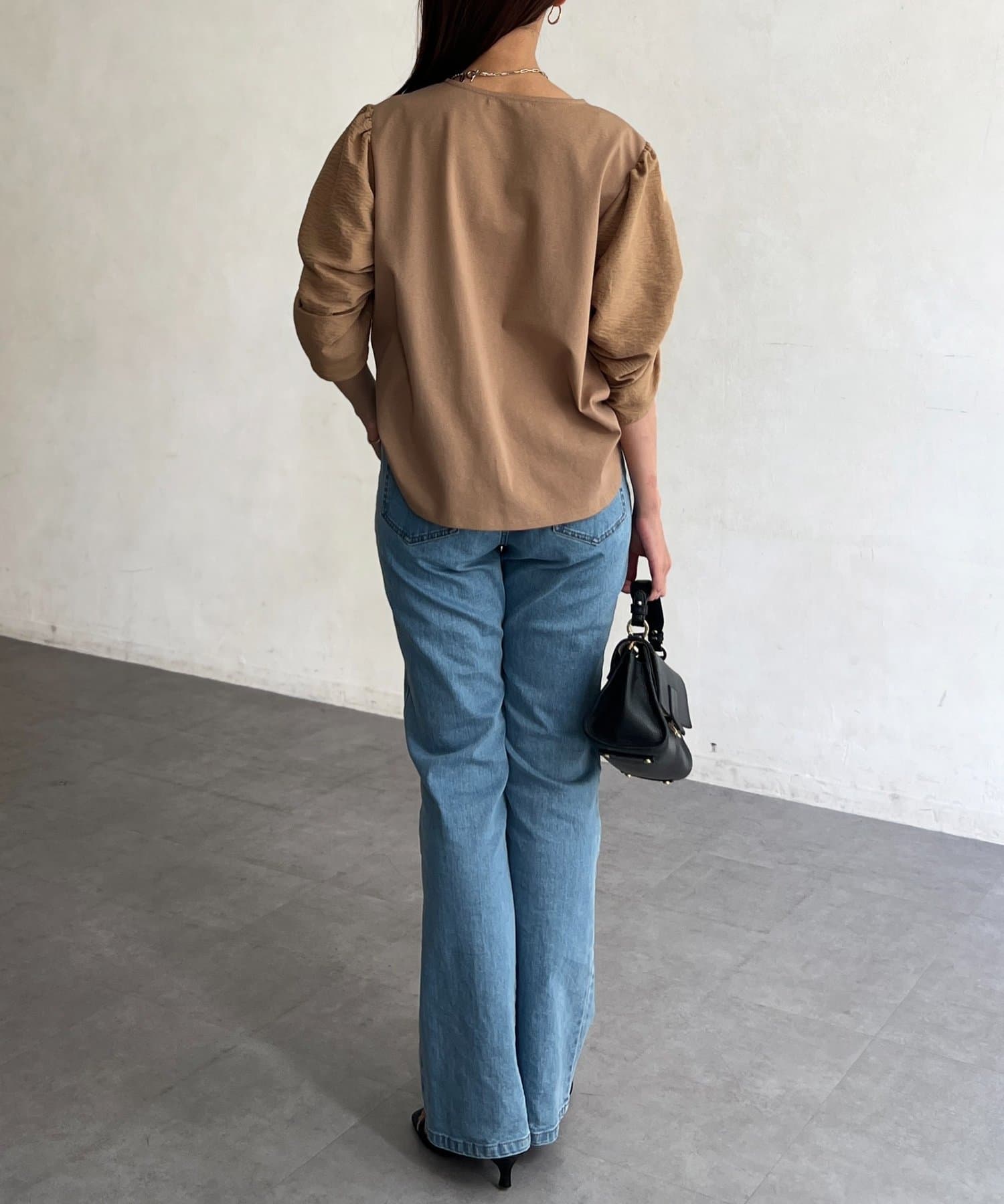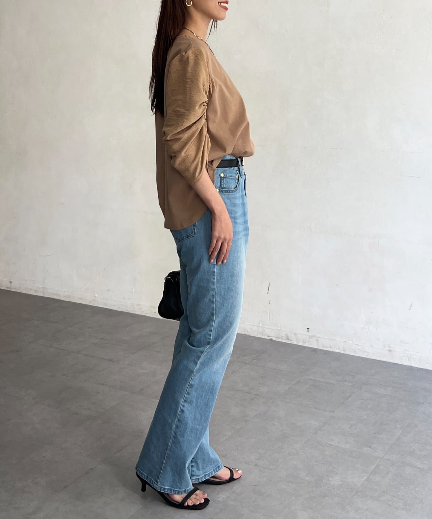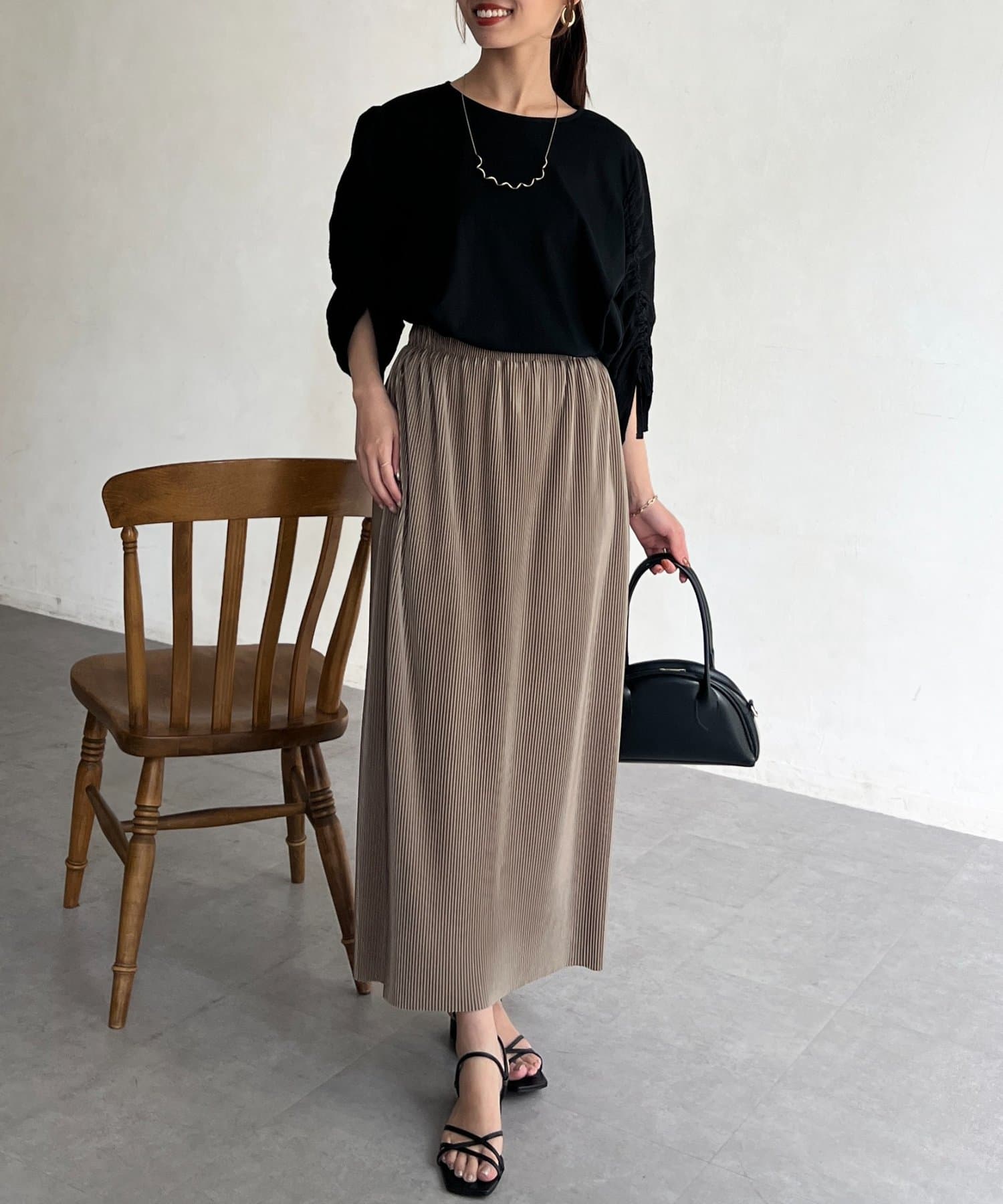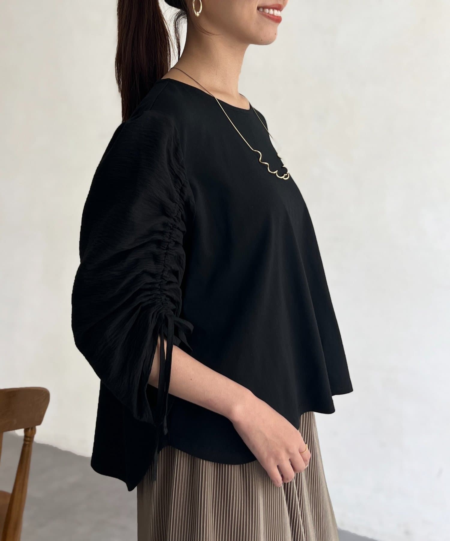 袖のギャザーがフェミニンな印象をプラスしてくれ、柔らかく清涼感ある生地感が着心地抜群◎