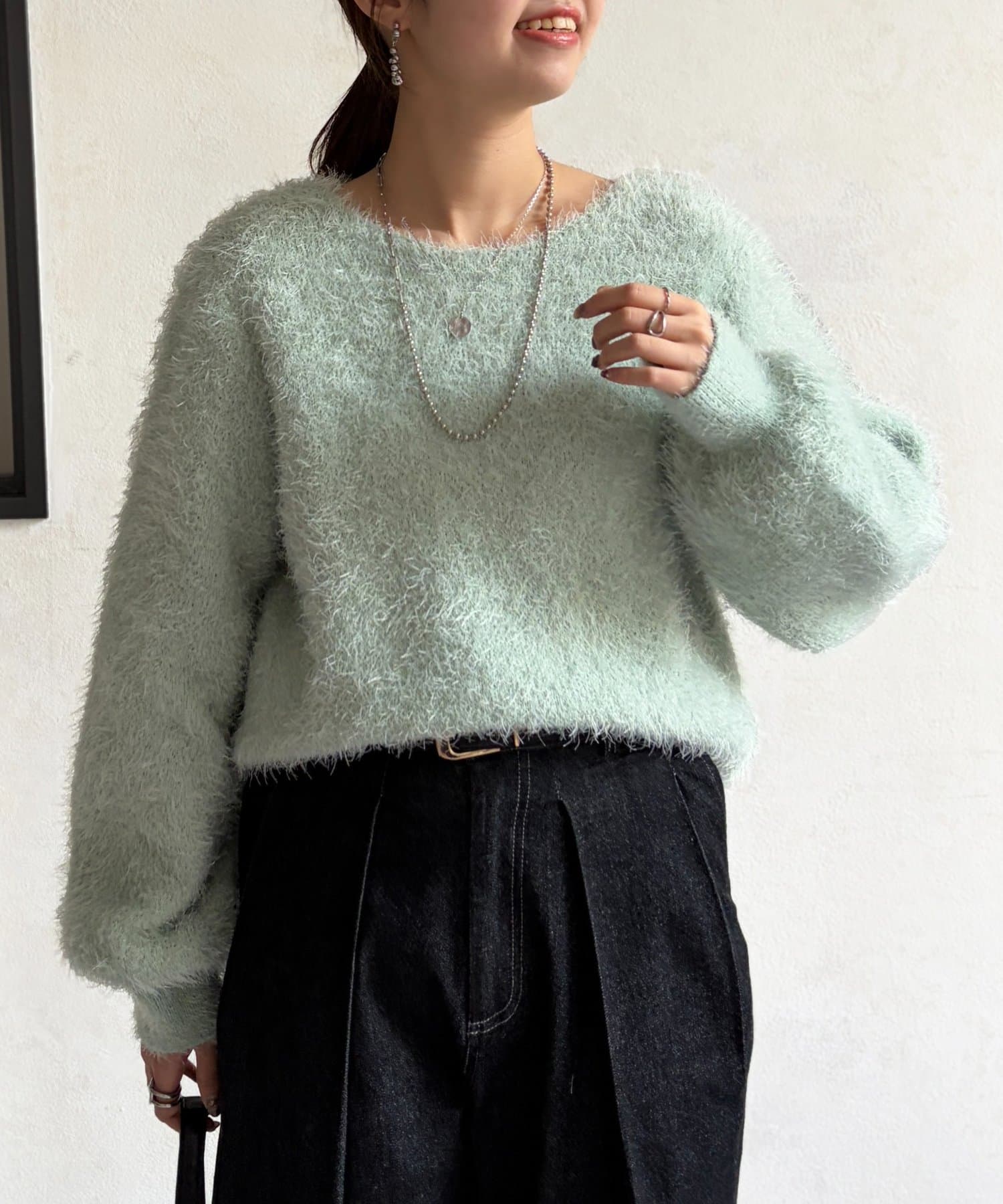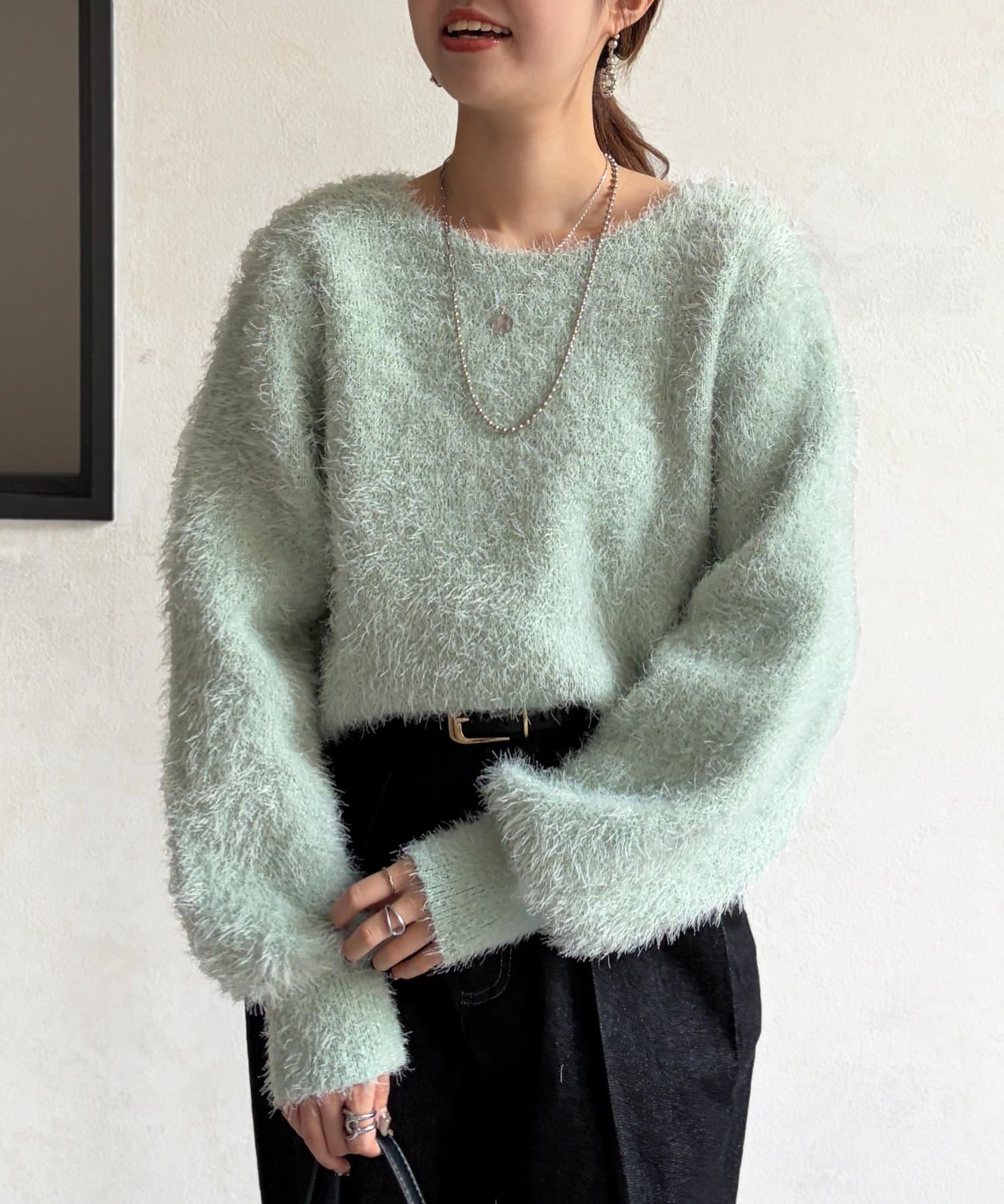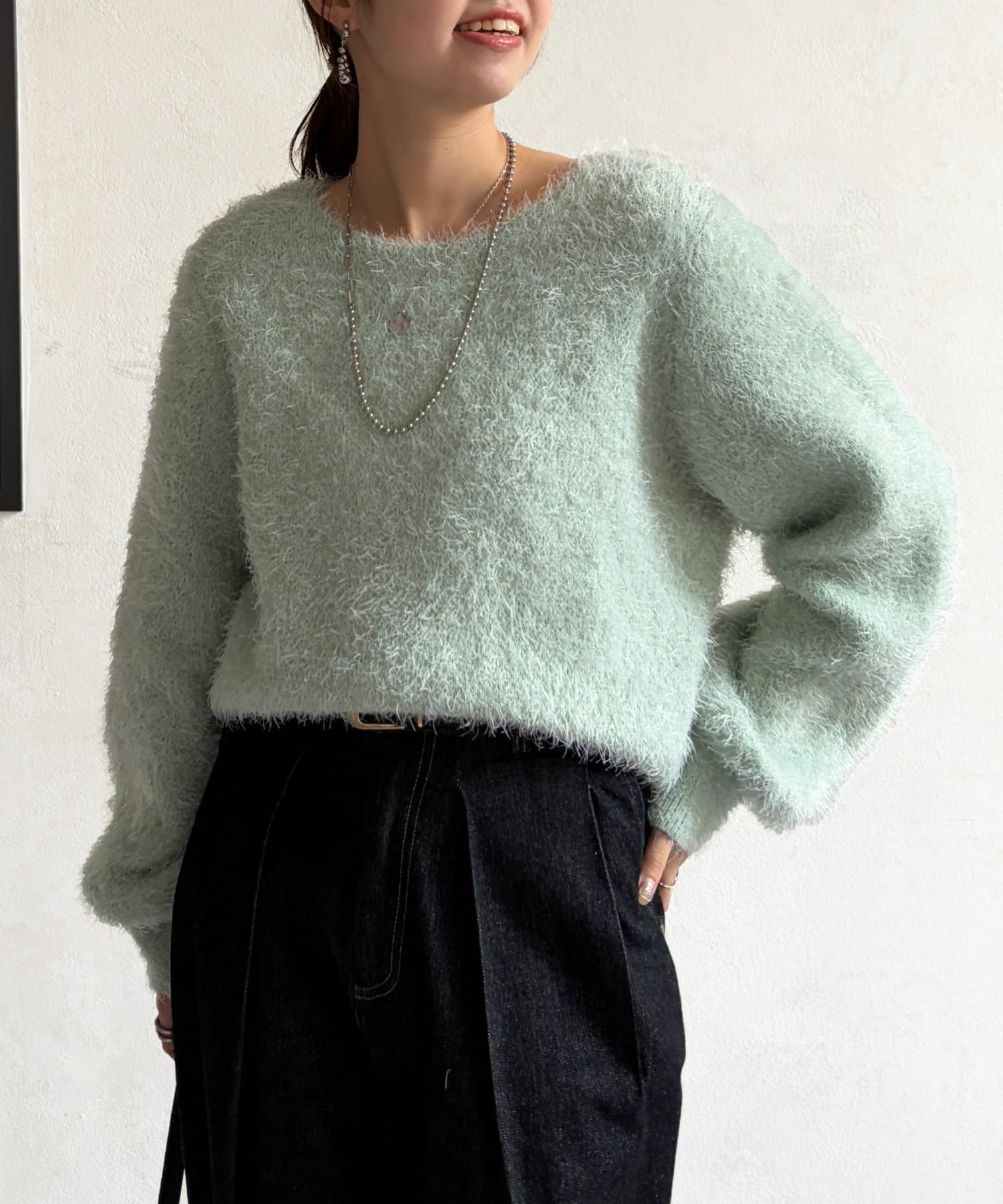 毛足の長いシャギーニットは抑えておきたい注目のアイテム。