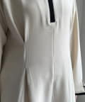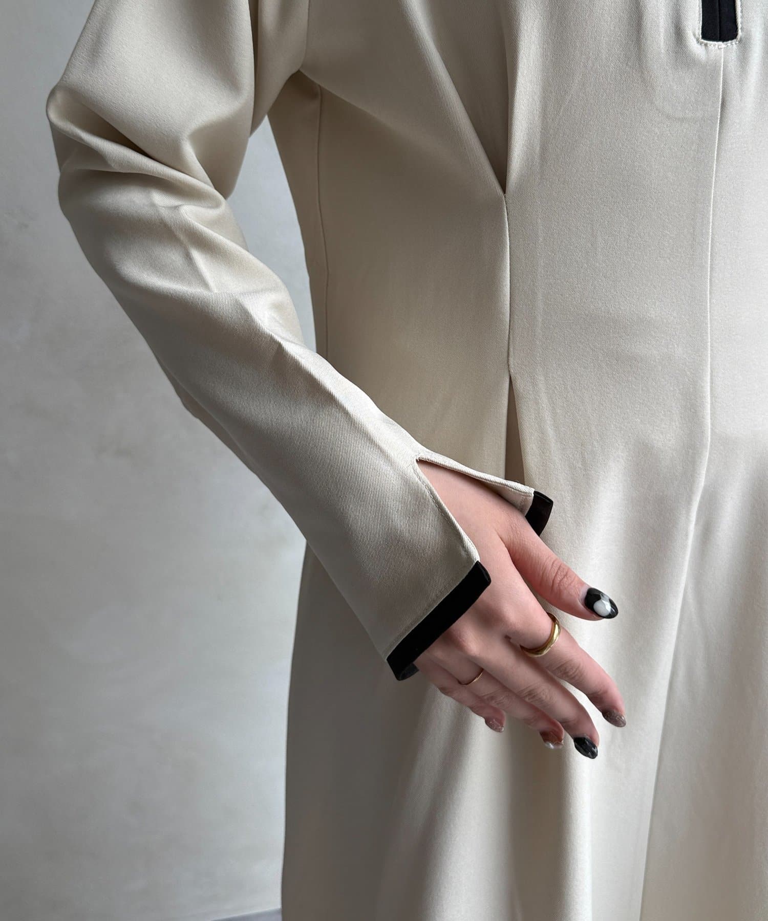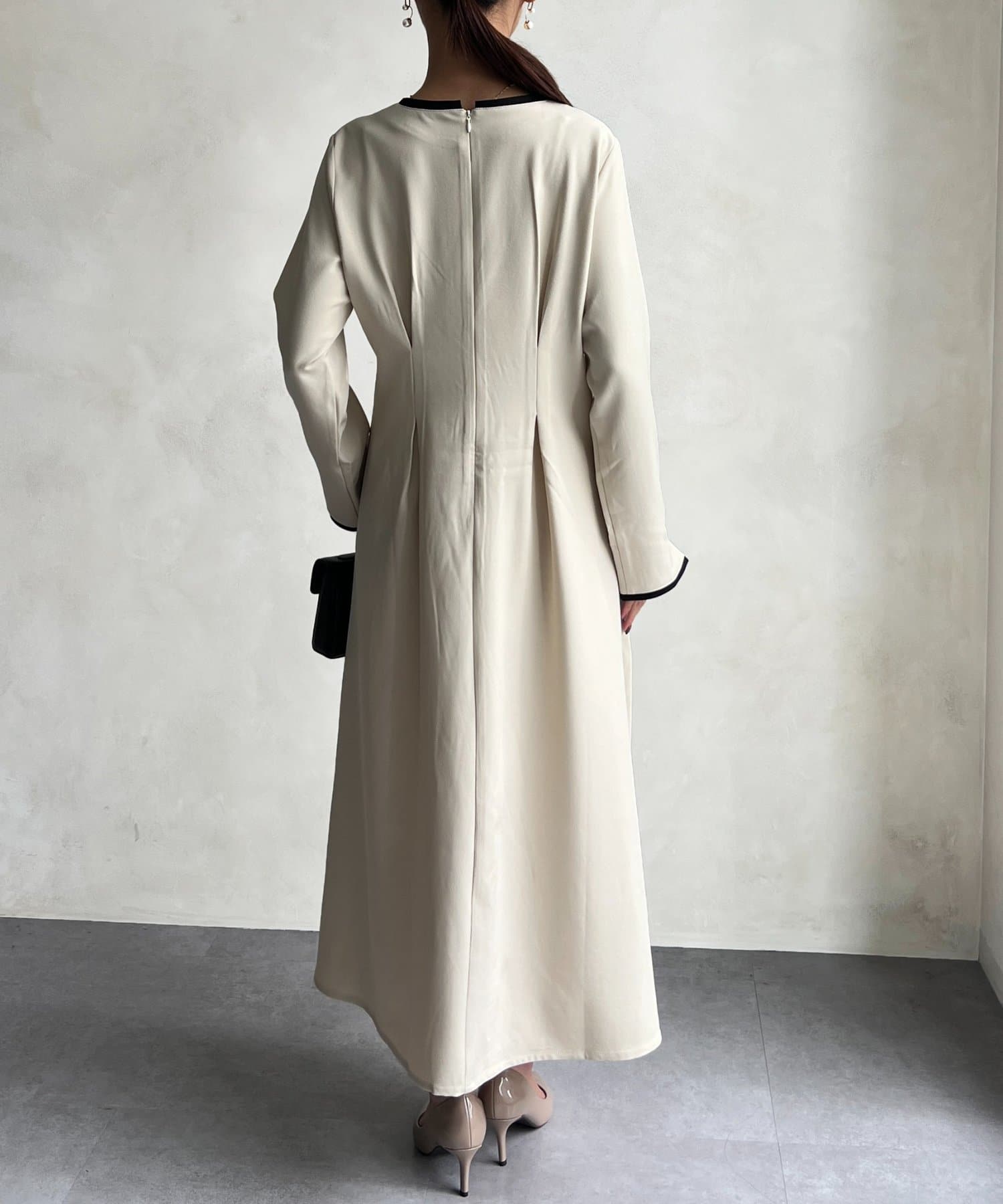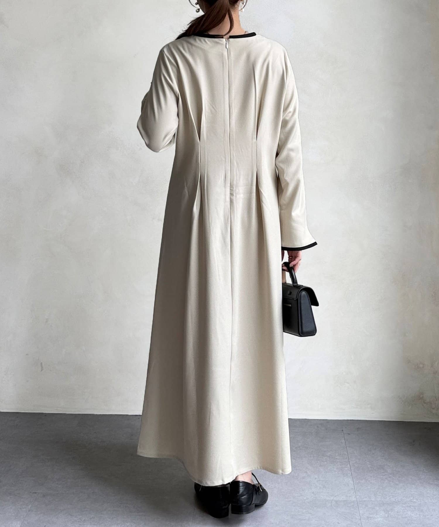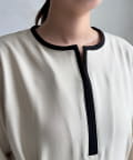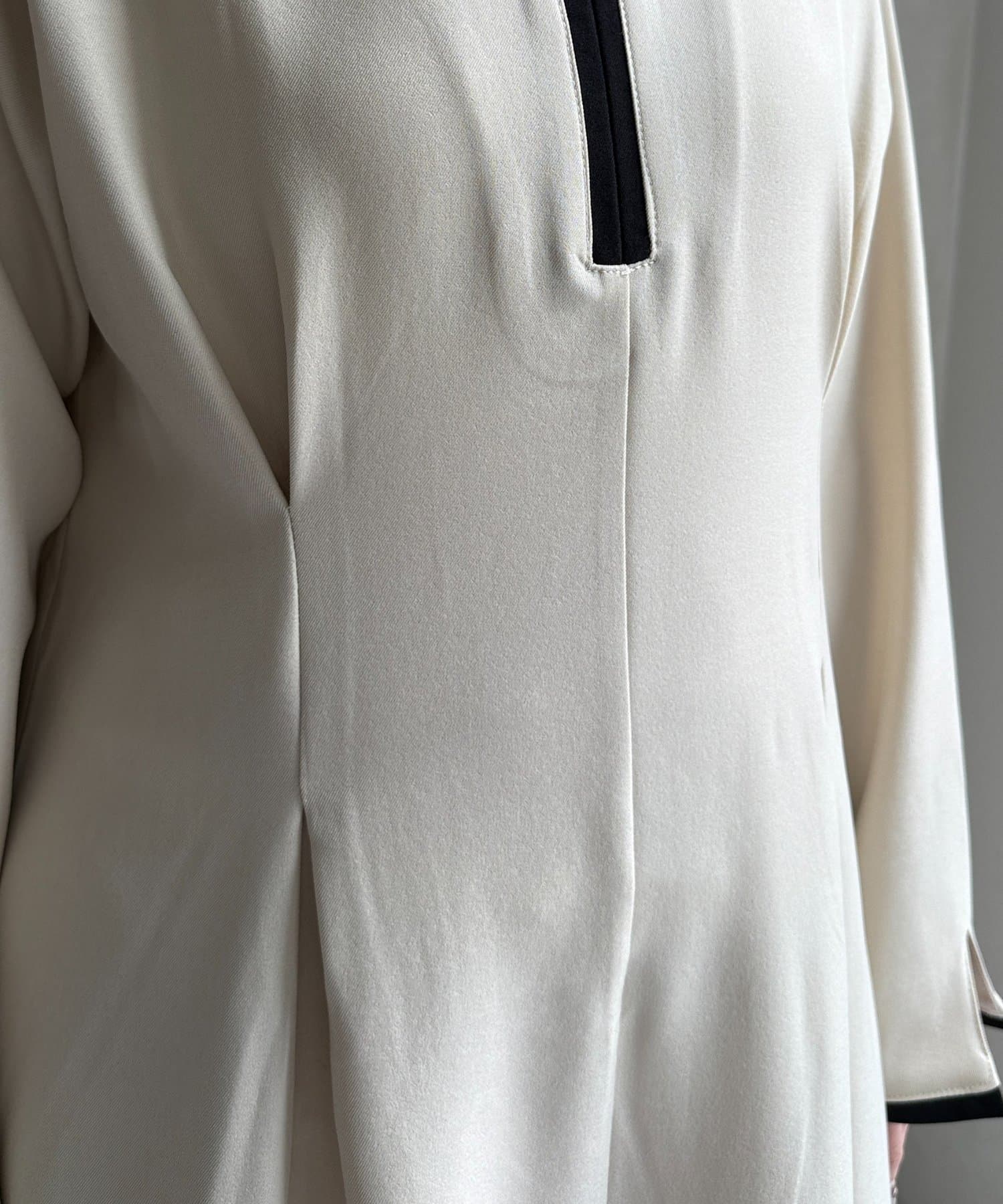 首回りや袖口、切り替え部分に施されたパイピングがコーディネートに華やかな印象を与えてくれます。
