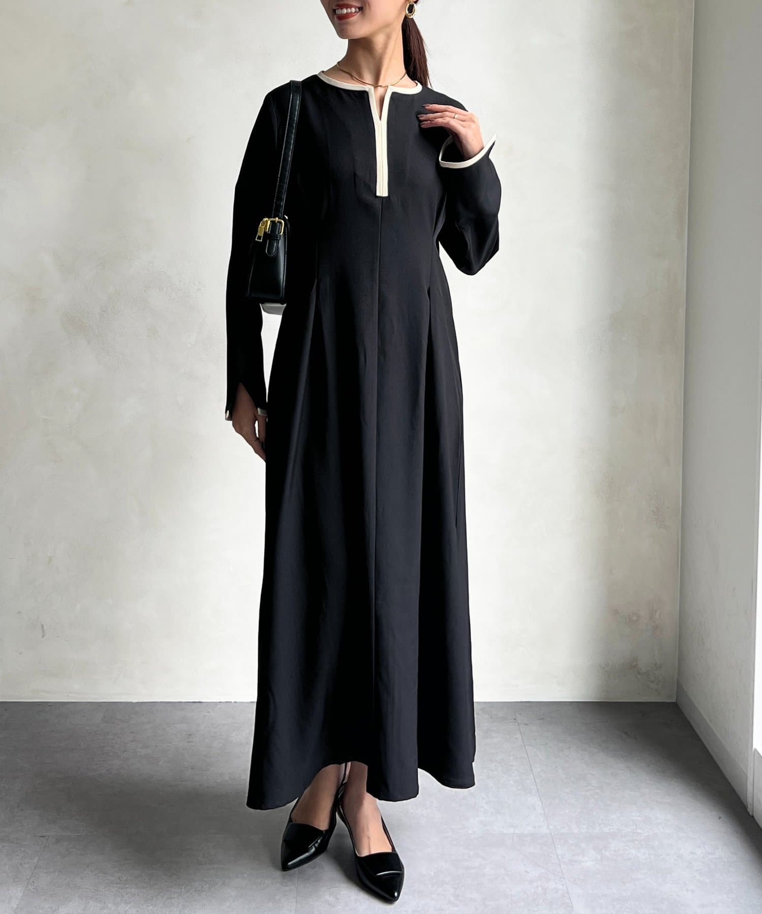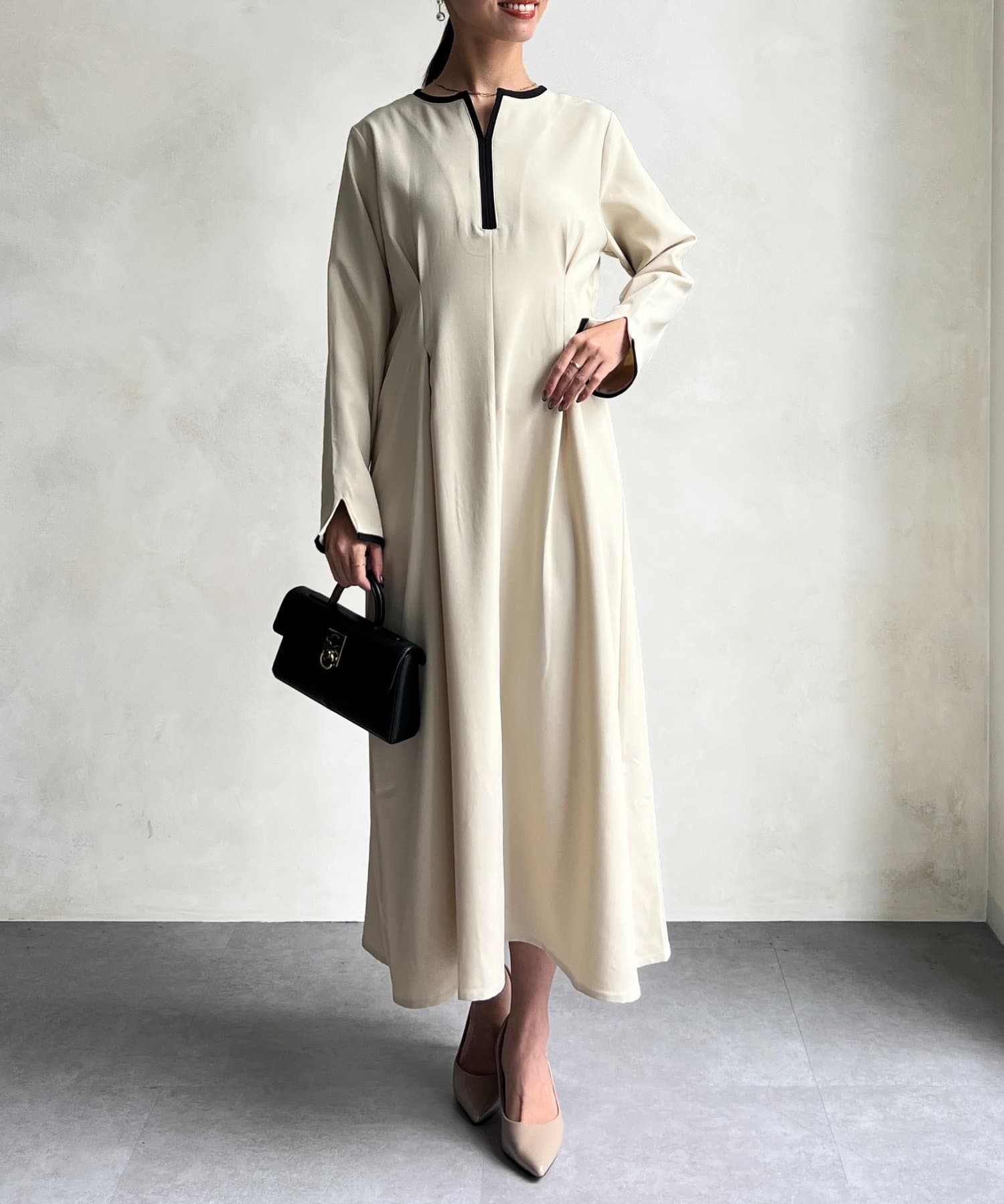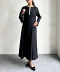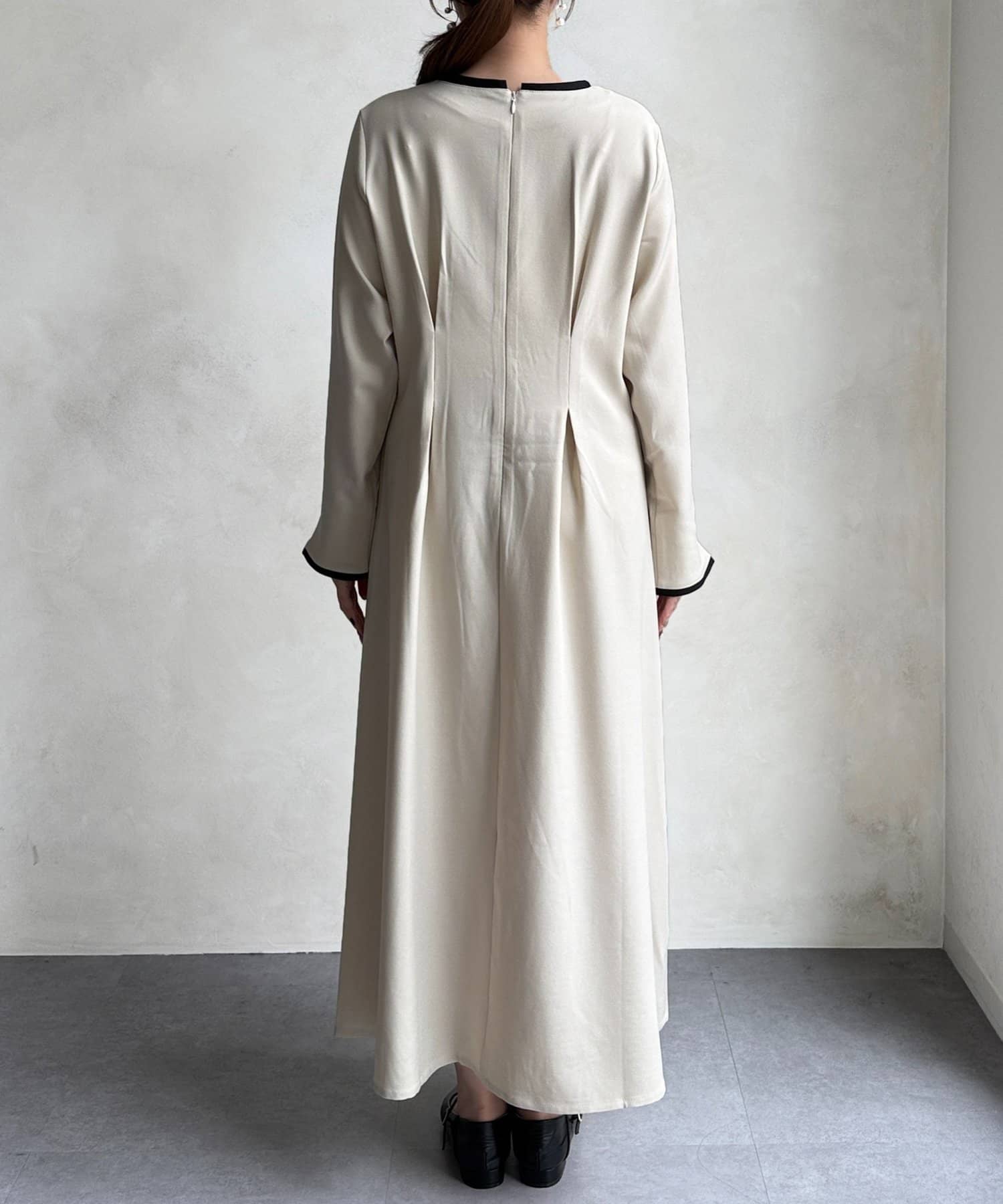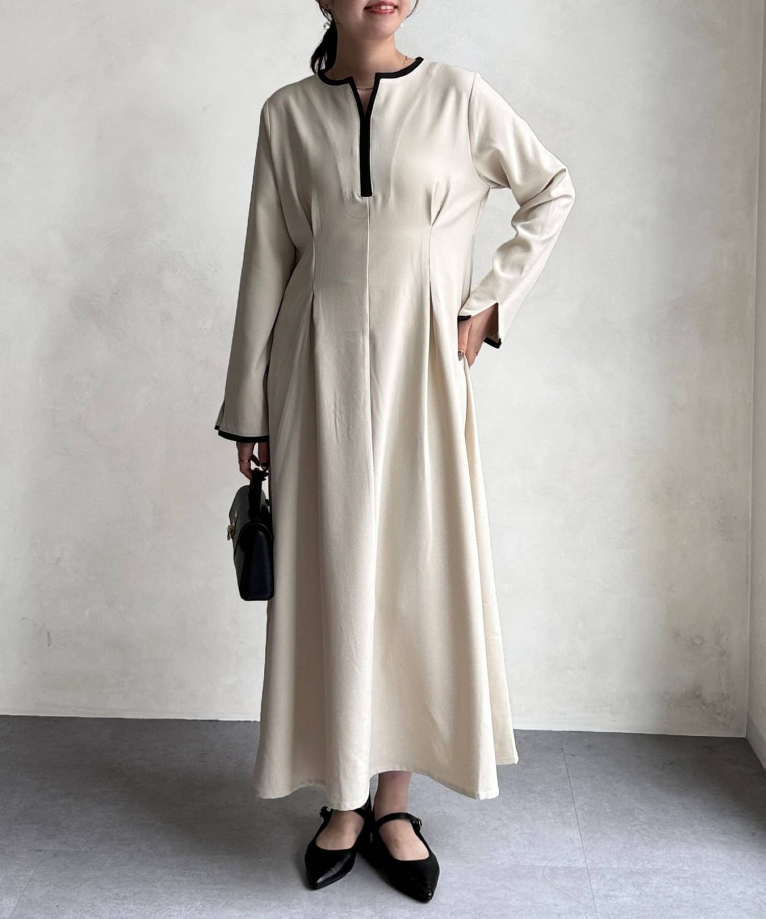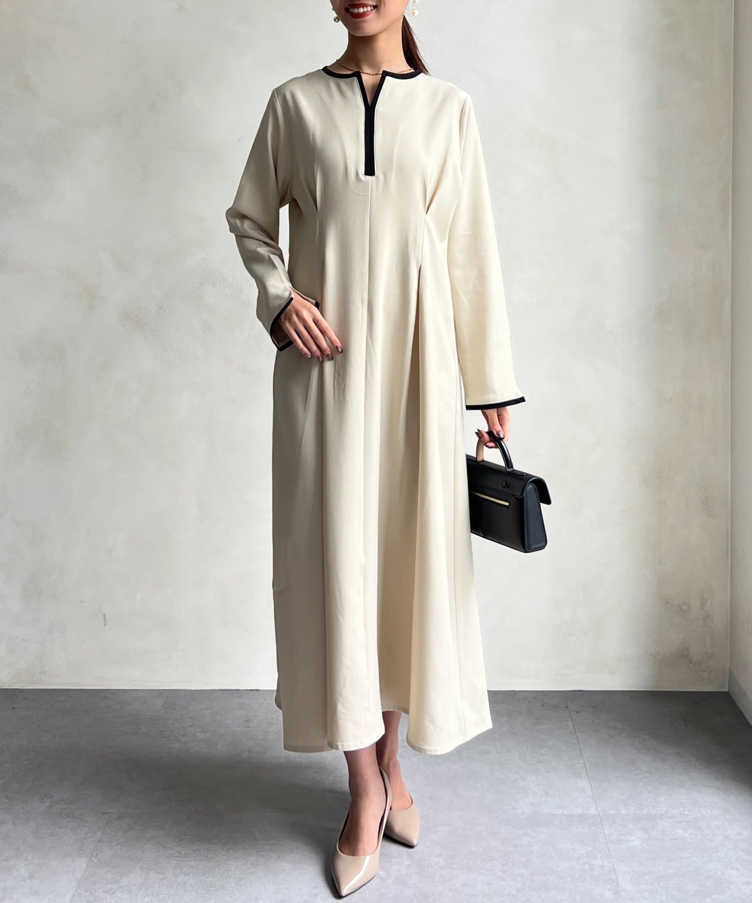 首回りや袖口、切り替え部分に施されたパイピングがコーディネートに華やかな印象を与えてくれます。