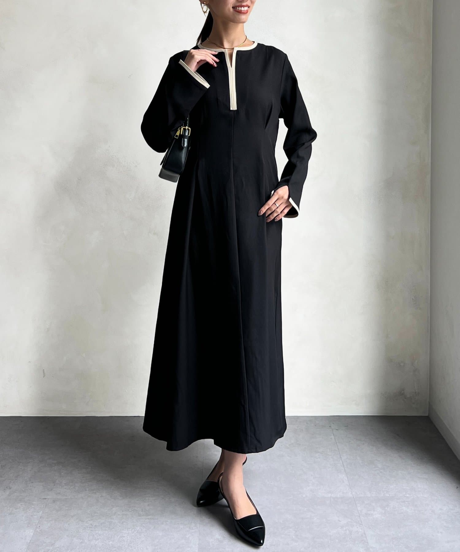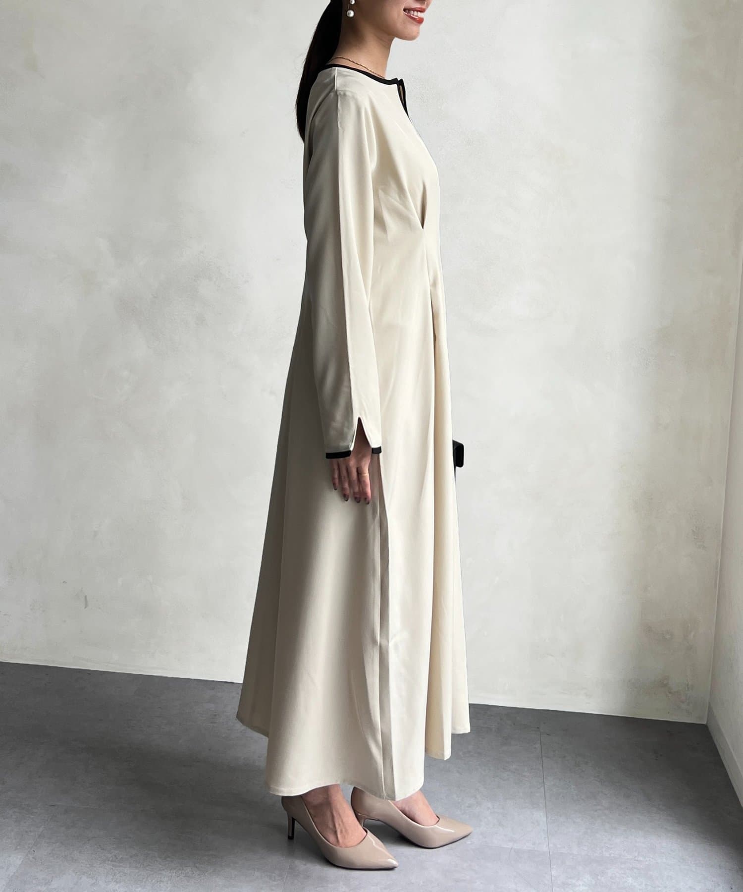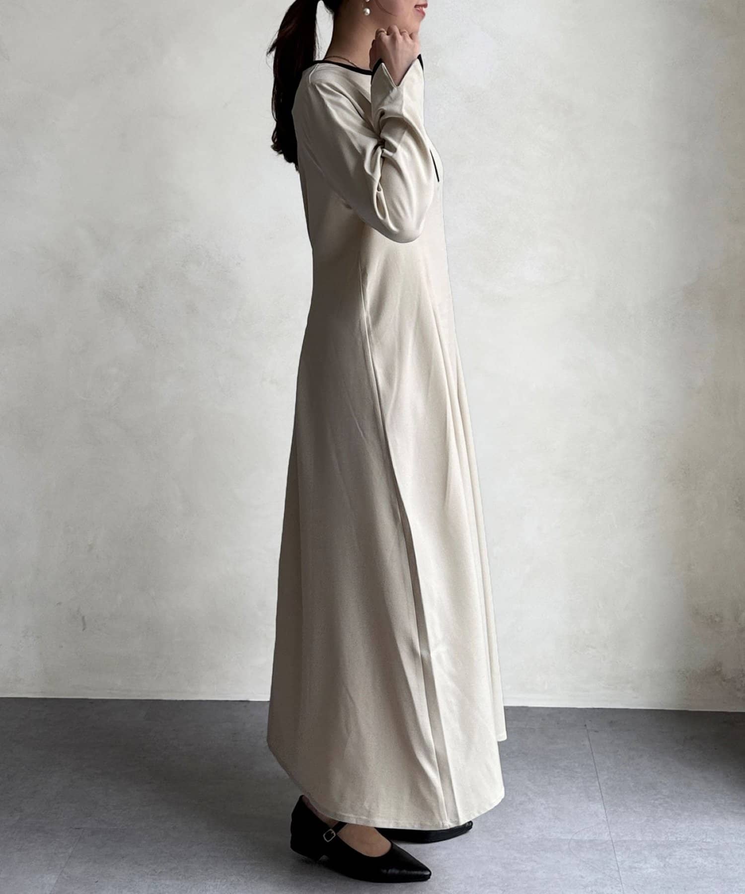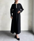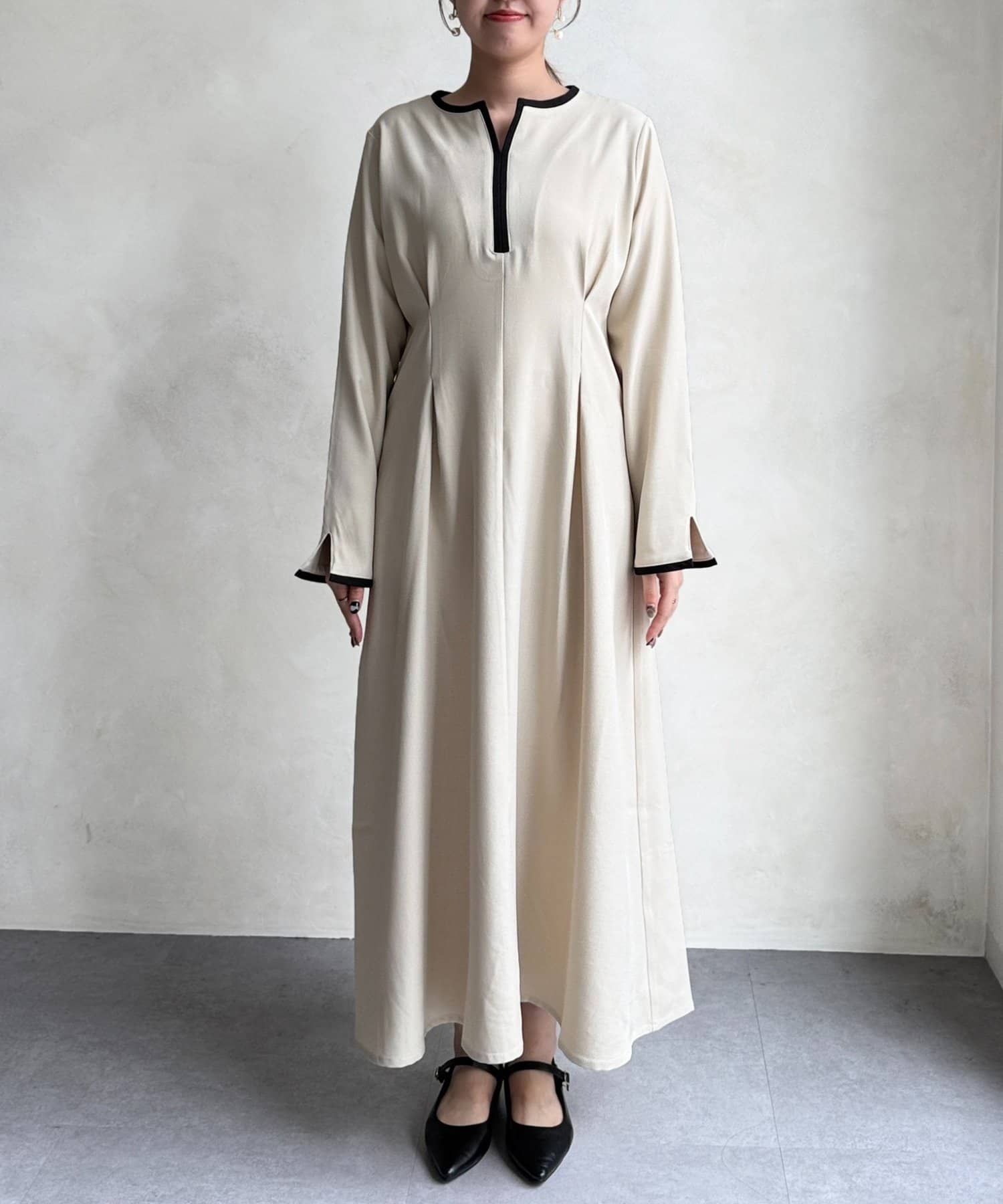 首回りや袖口、切り替え部分に施されたパイピングがコーディネートに華やかな印象を与えてくれます。