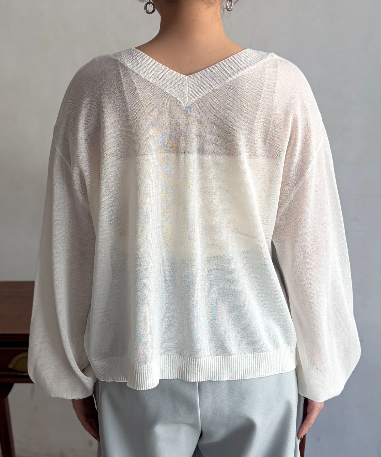 スッキリとした後襟ぐりのV開き仕様、袖口の配色が目を惹く1着