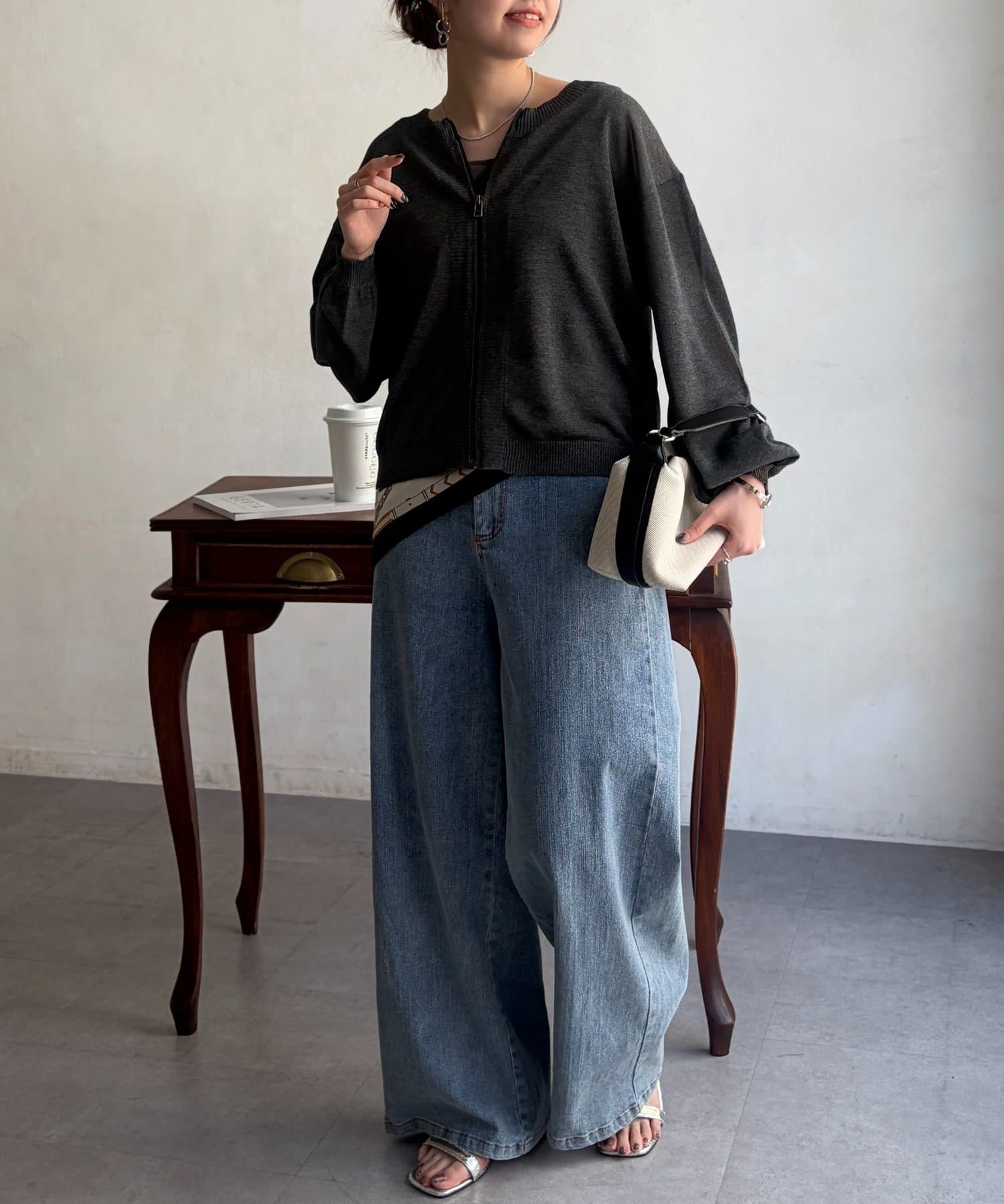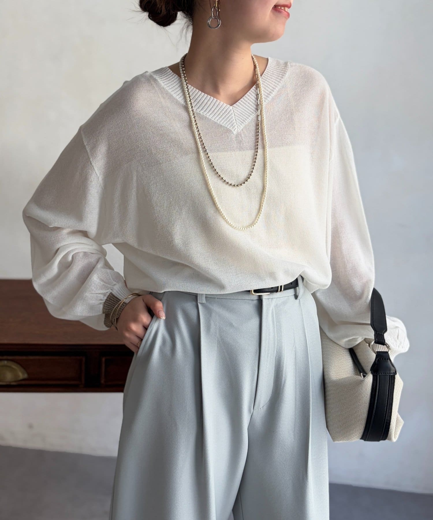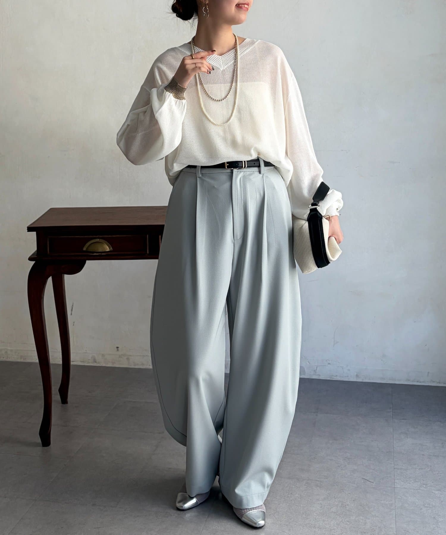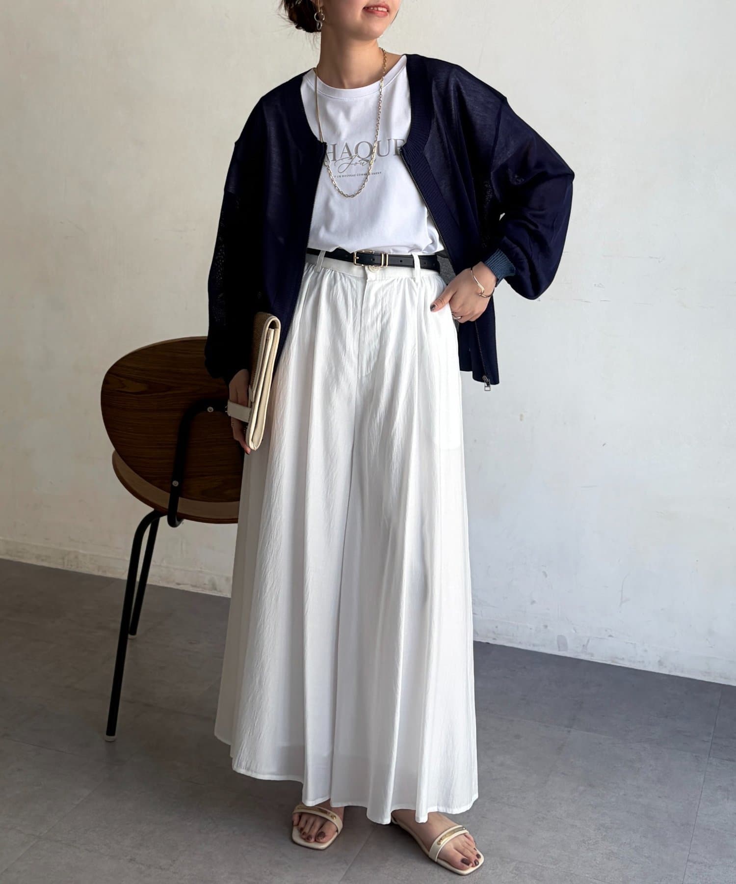 カジュアルなデニムや、きれい目なナロースカートなど様々なボトムスと合わせていただけます。