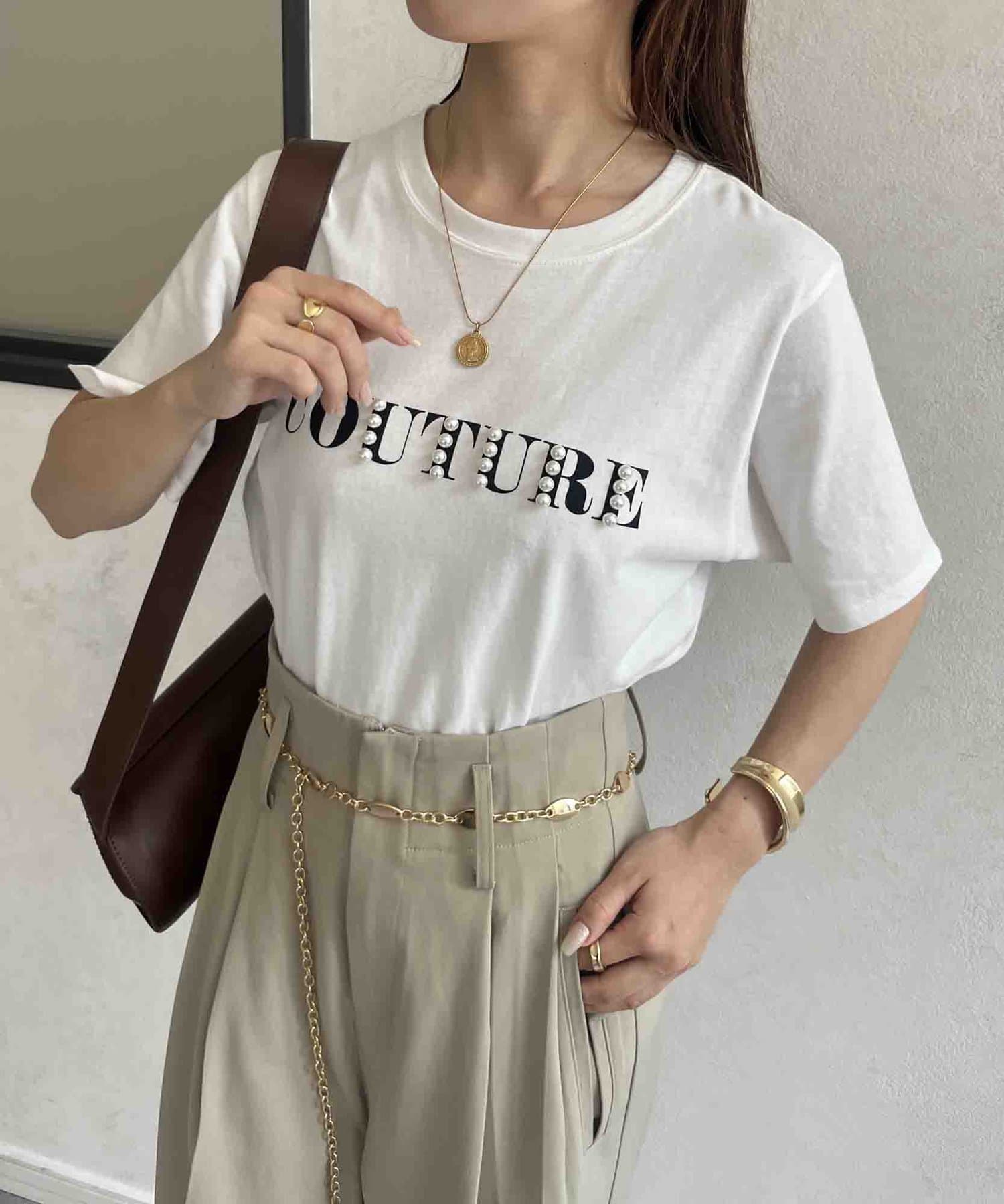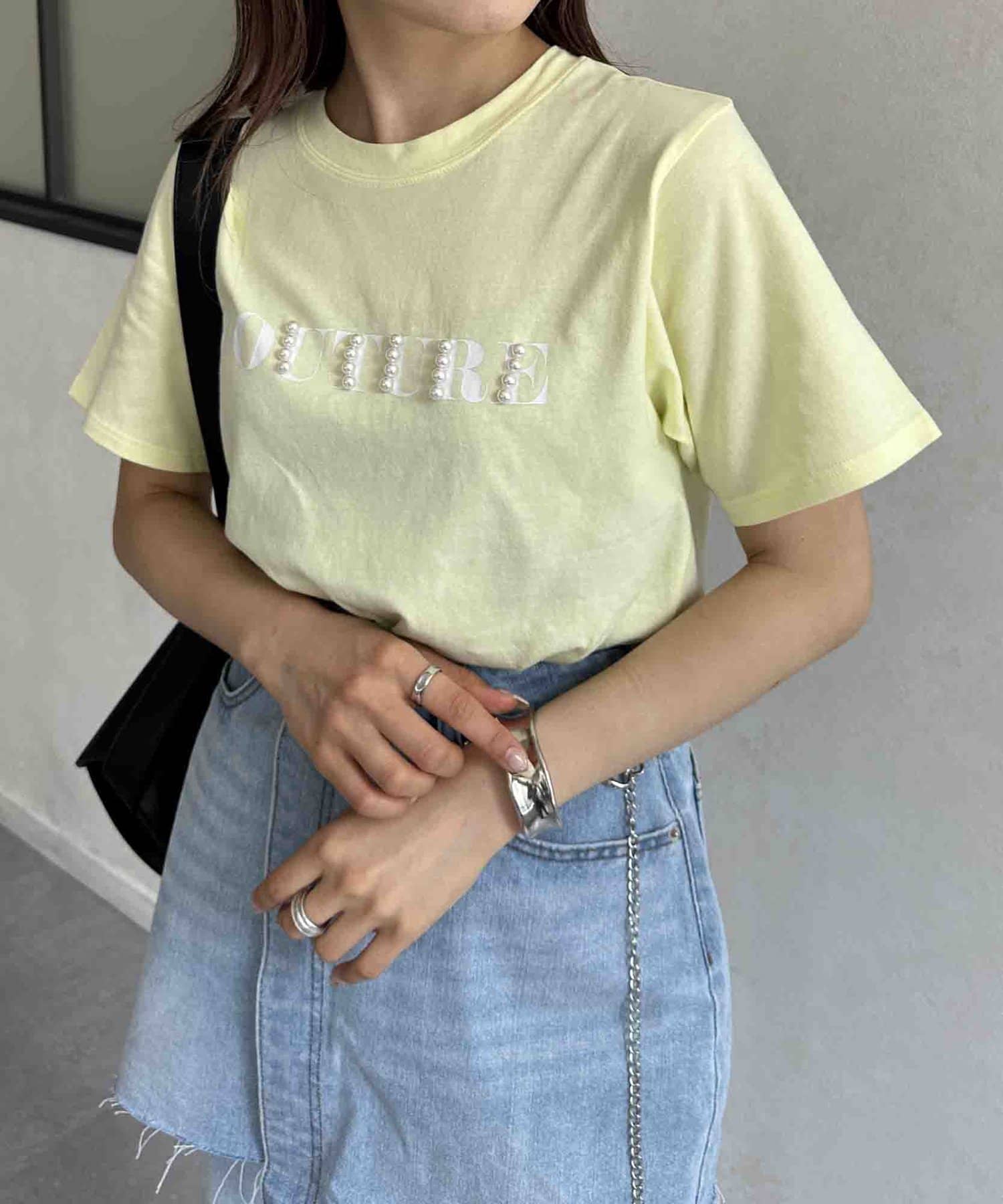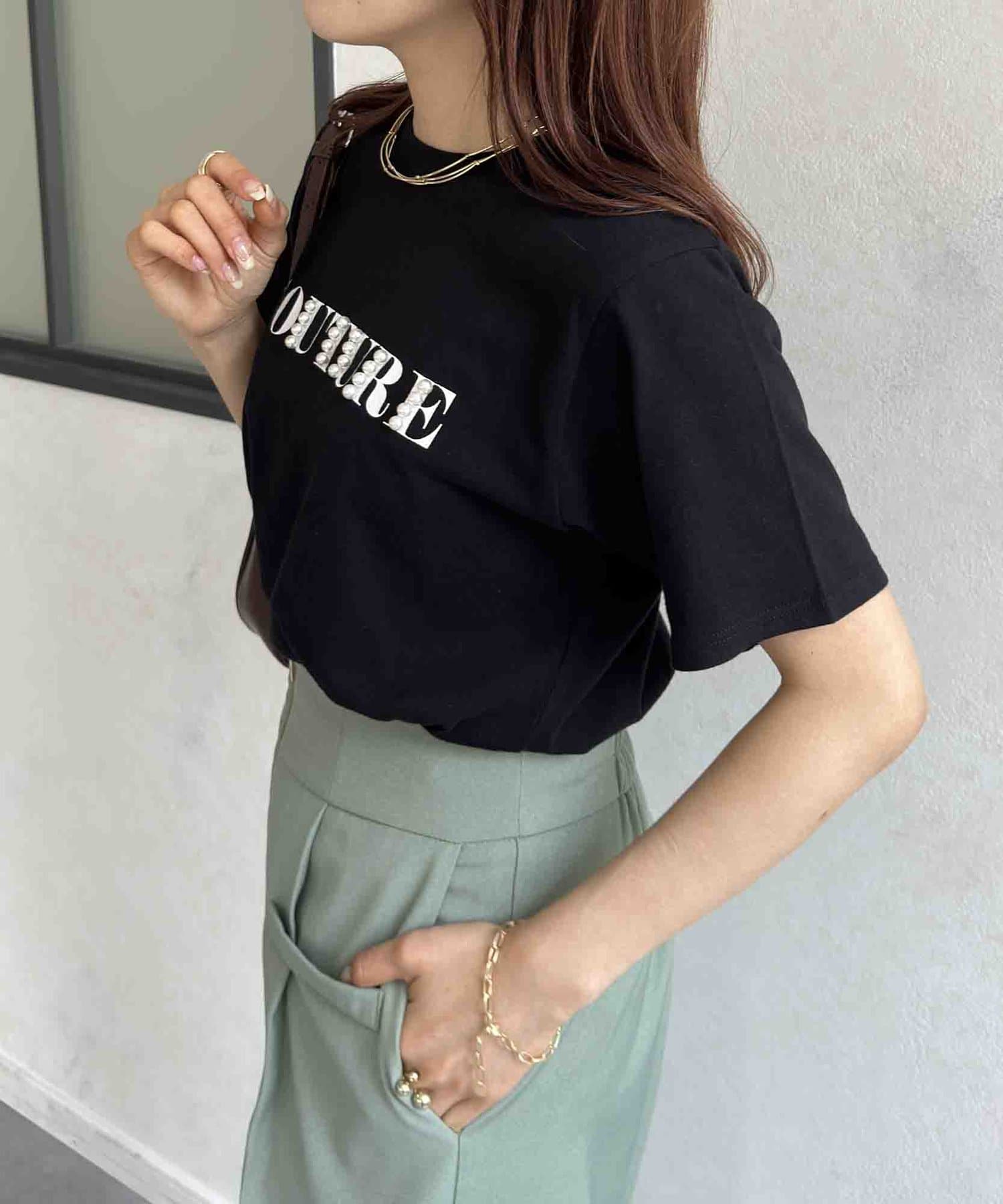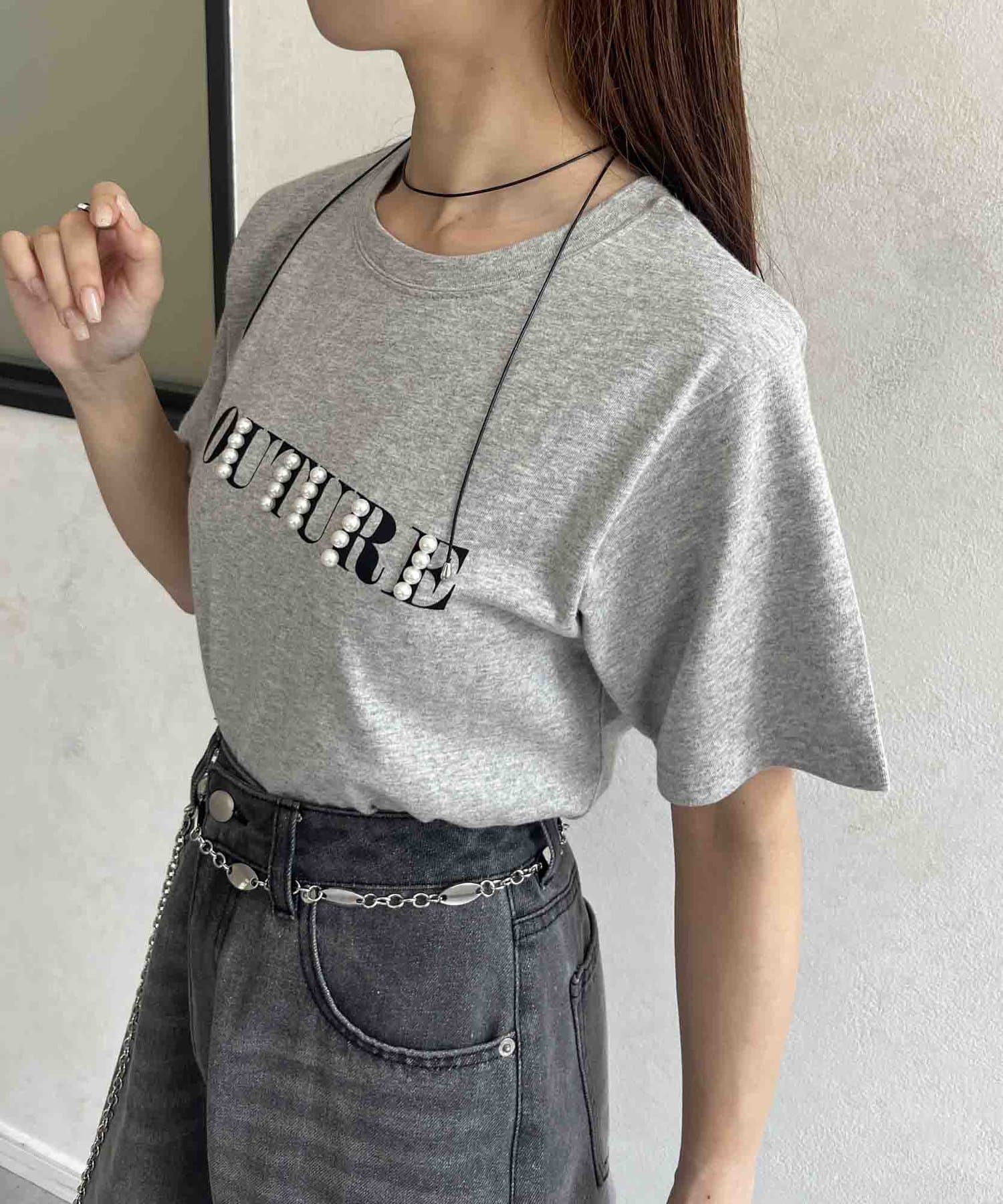 カジュアルなロゴTに華やかなパールをプラス
