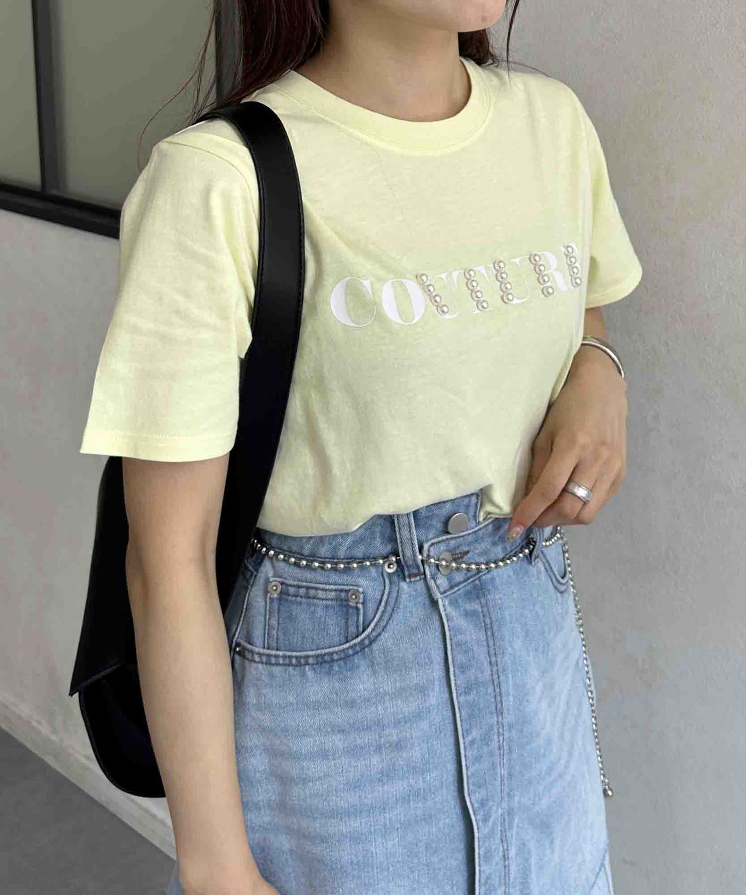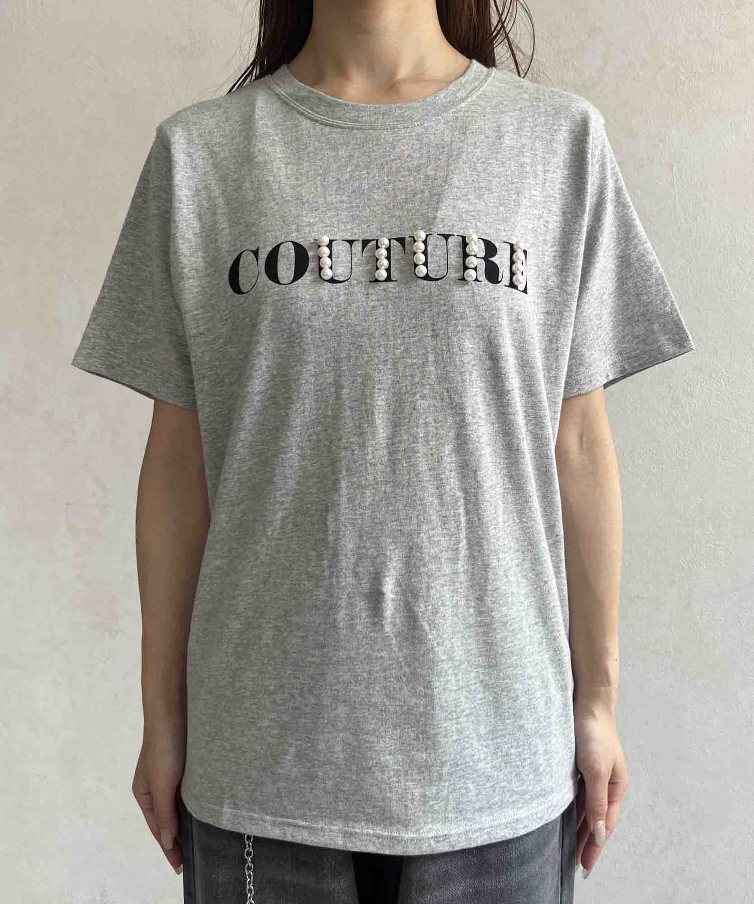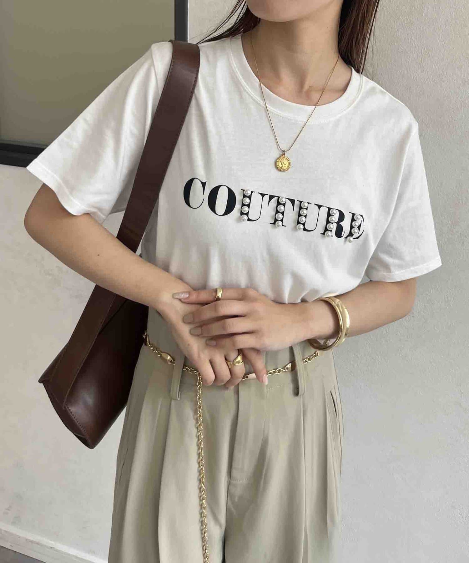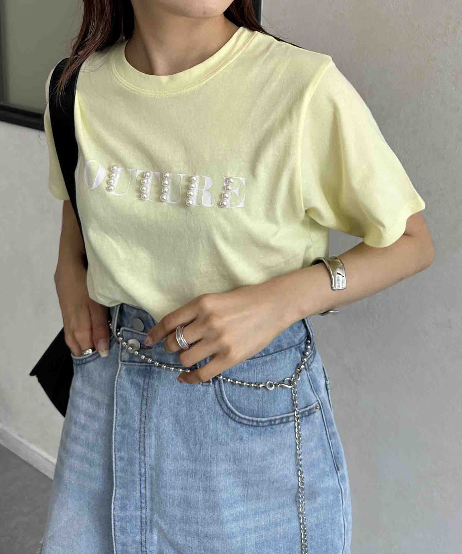 カジュアルなロゴTに華やかなパールをプラス
