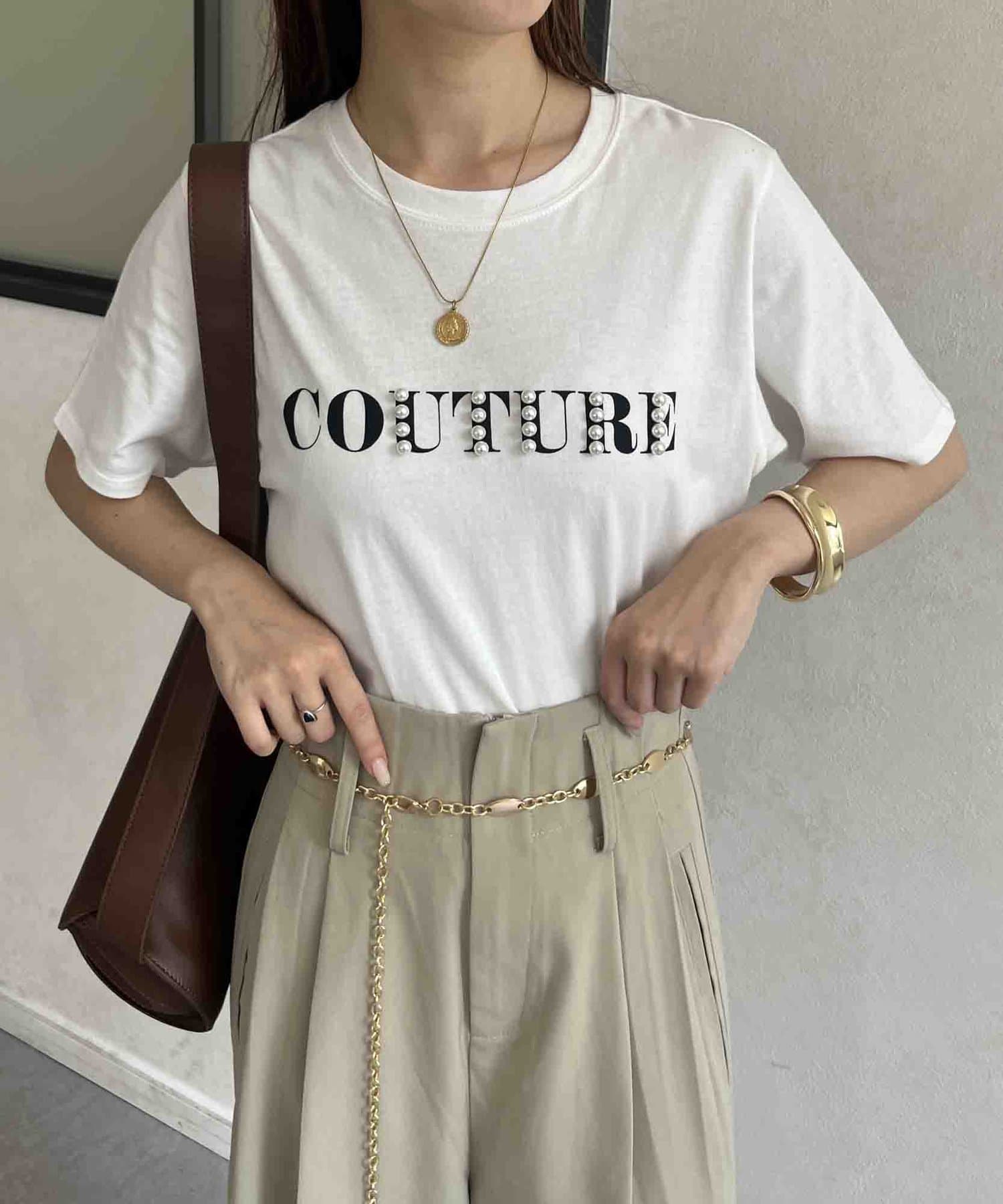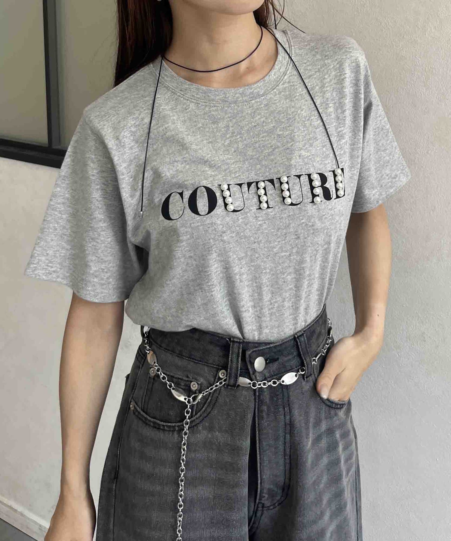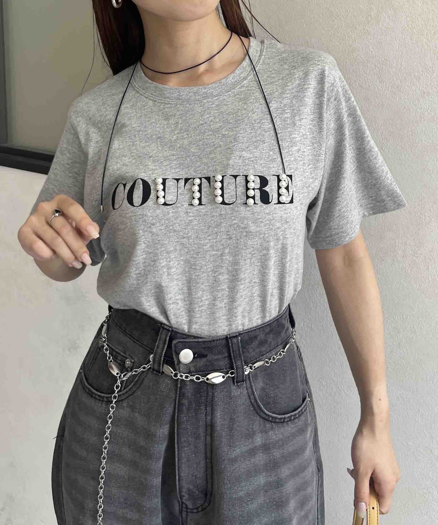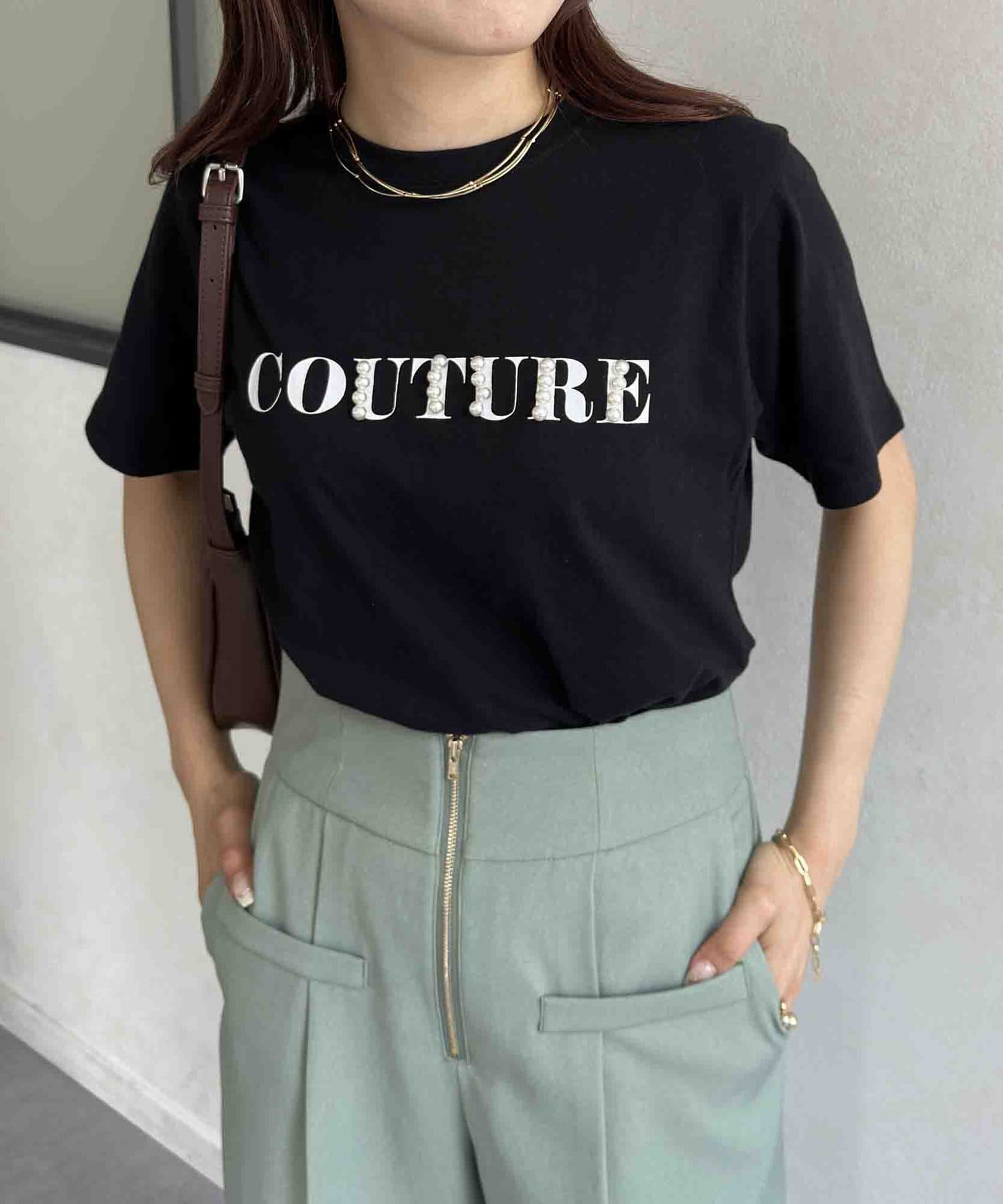 カジュアルなロゴTに華やかなパールをプラス