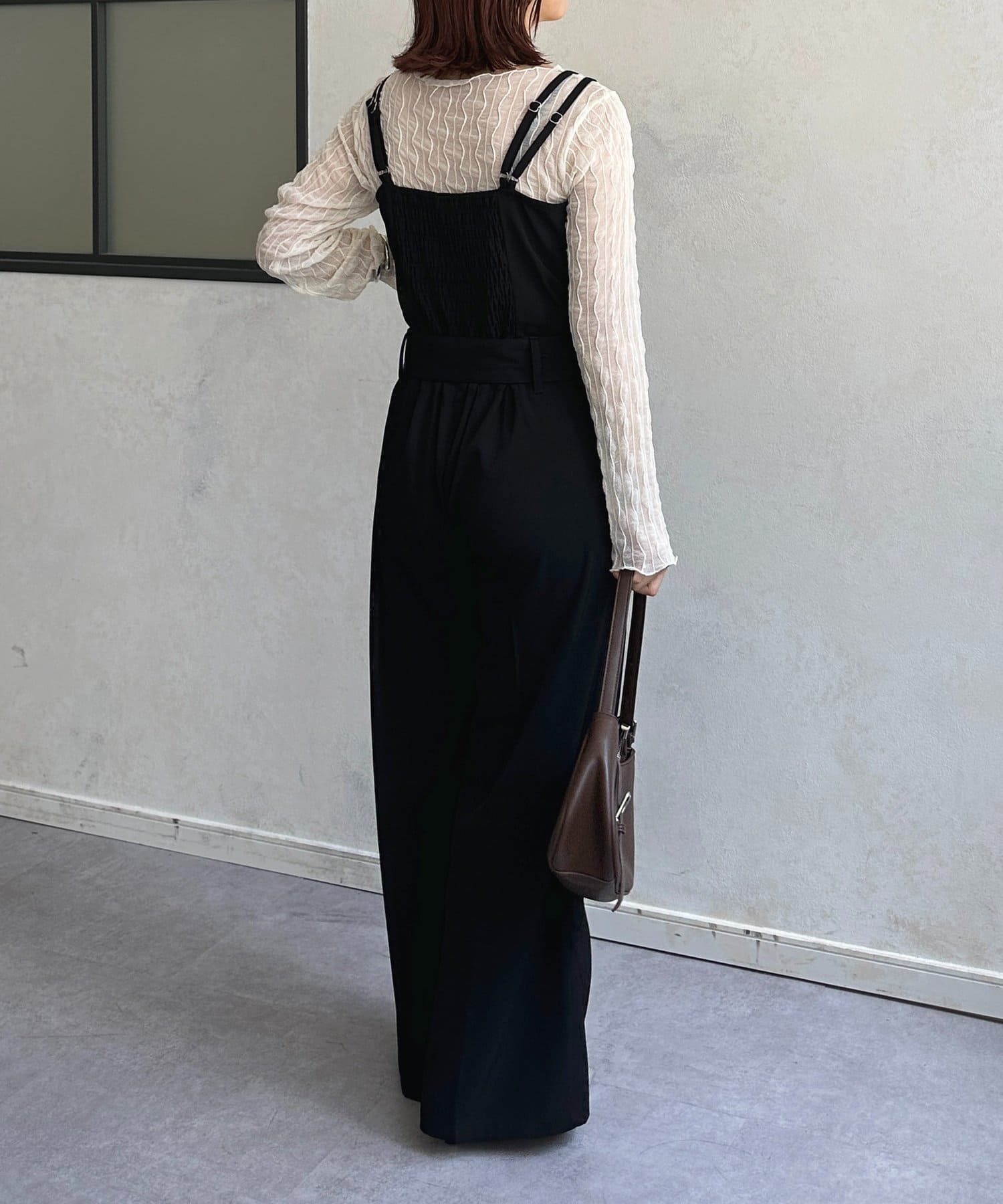 ・ 透け感のあるトップスを合わせた、トレンドのレイヤードスタイルには
