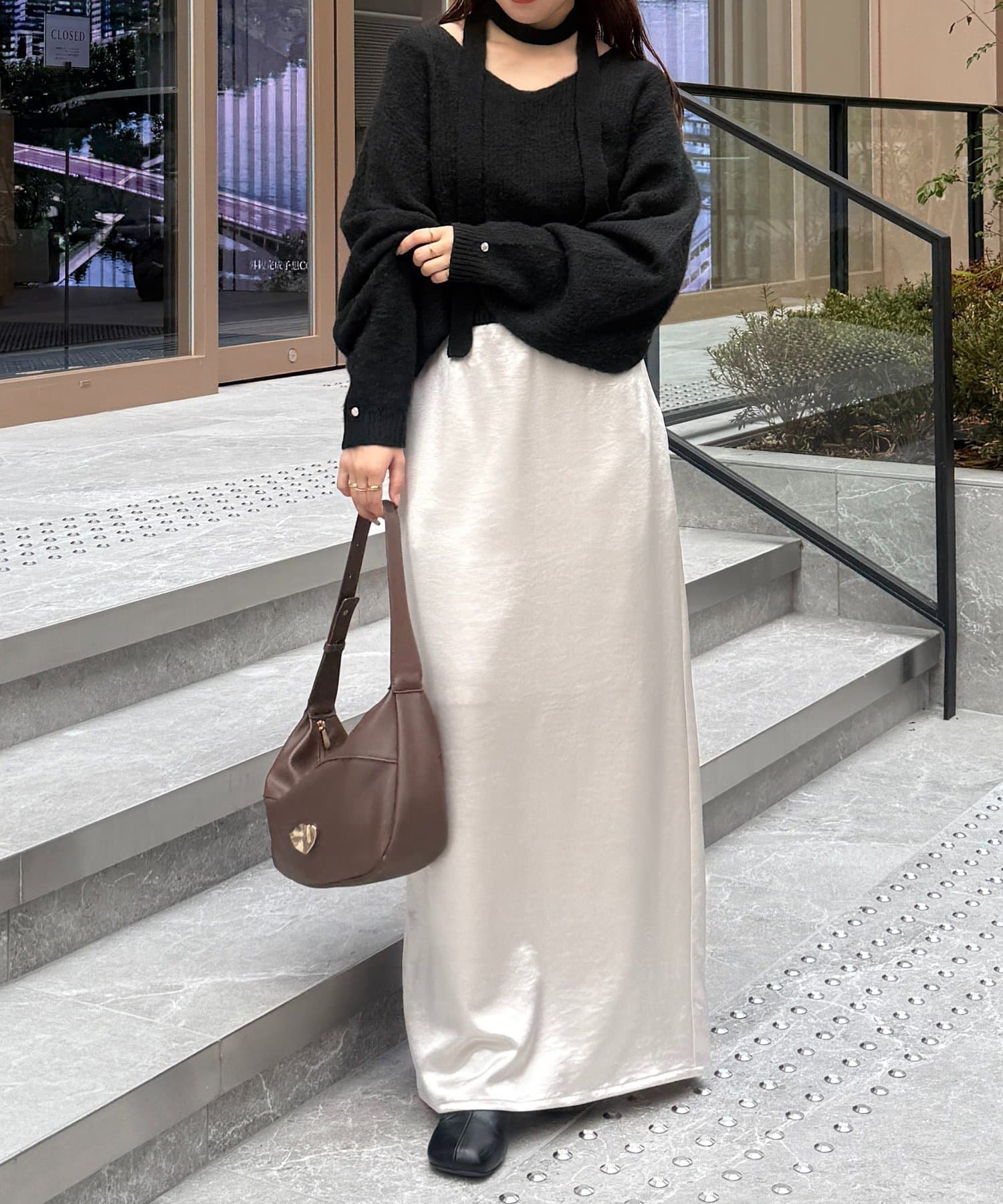 ・女性らしさのある広めのVネックは、セットのチョーカーをポイントにしたり、