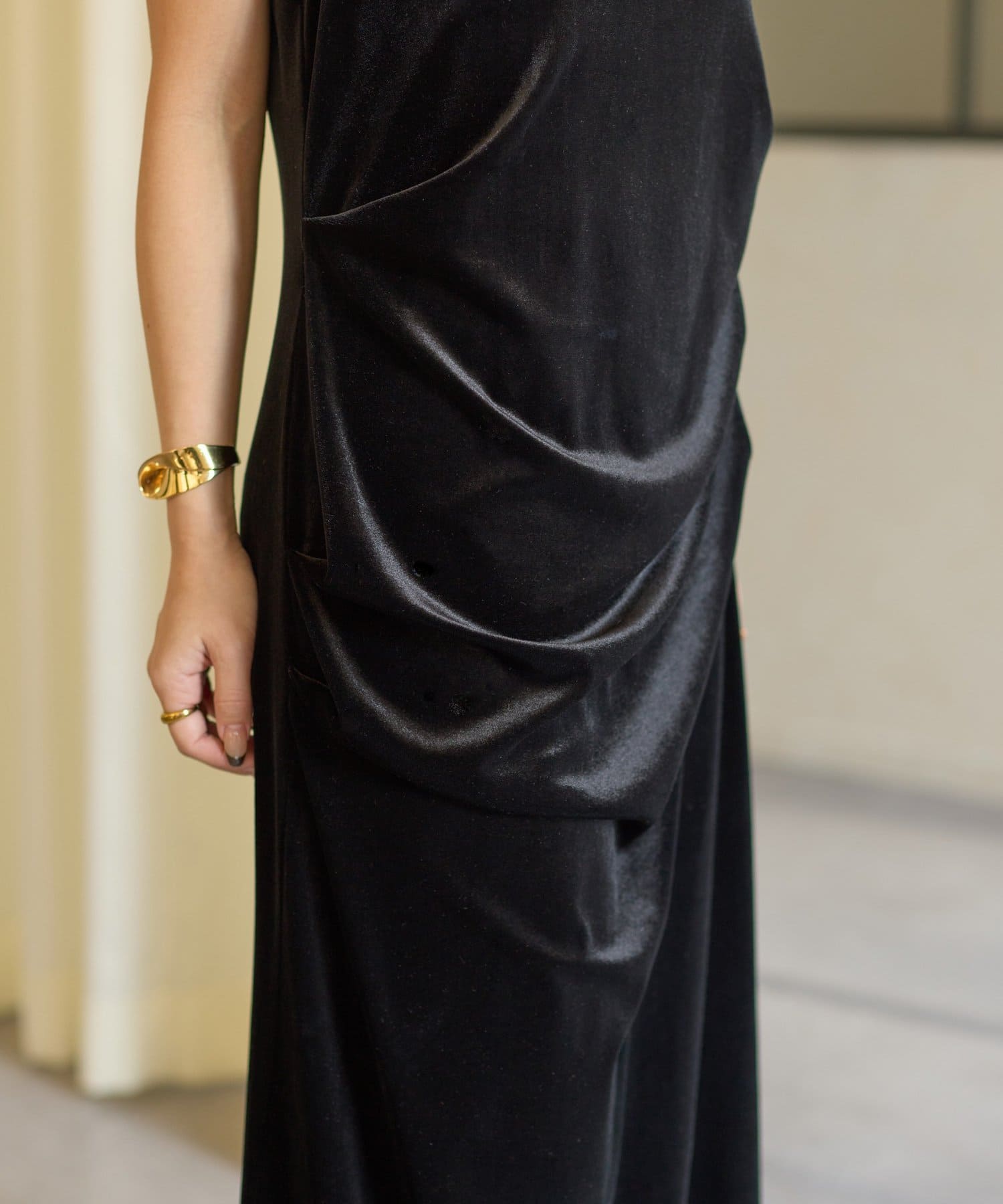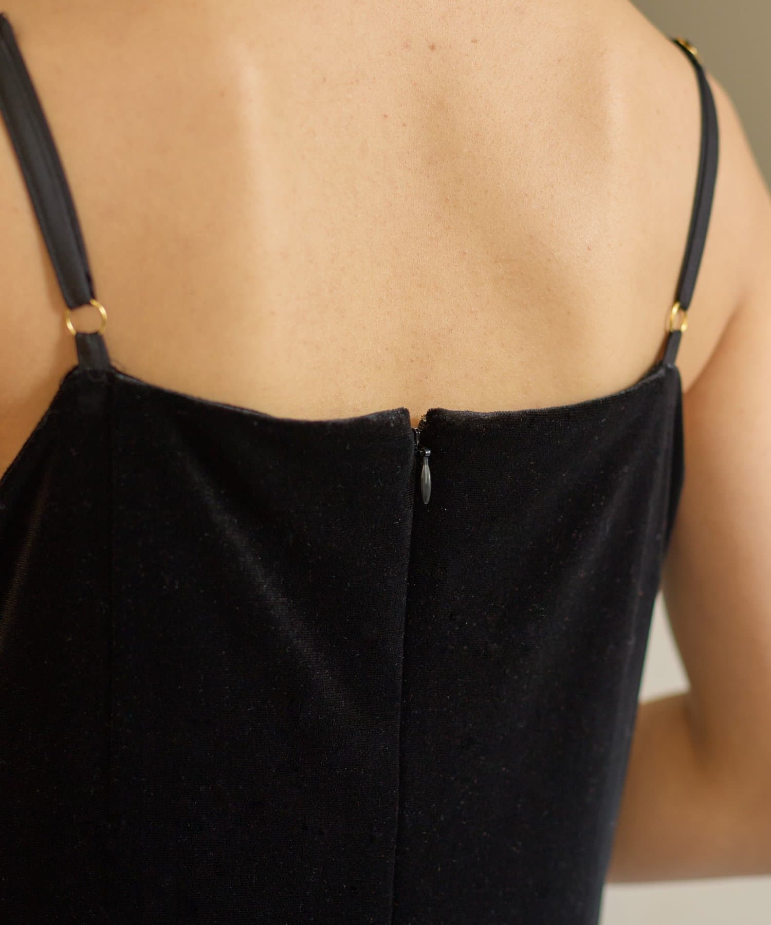 ・上品見えするベロアキャミワンピース,華やかなビジューと