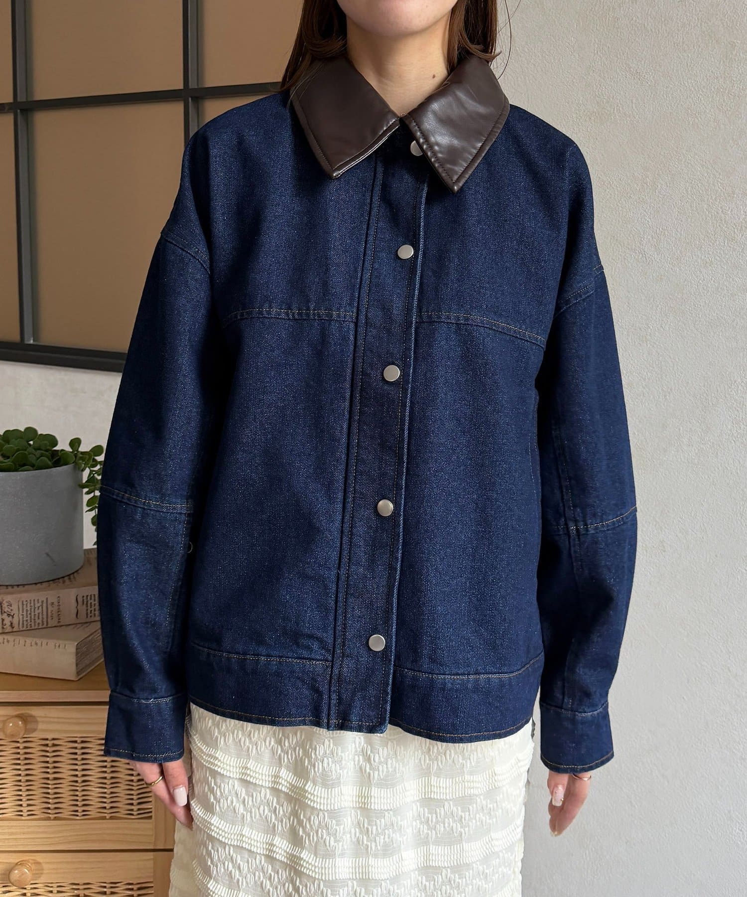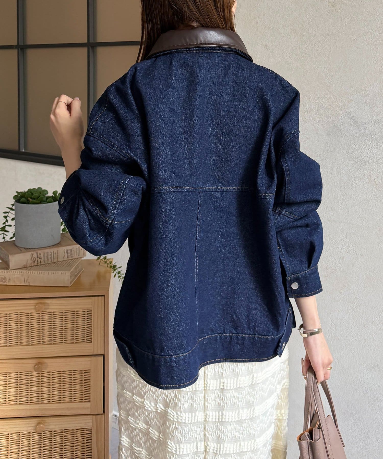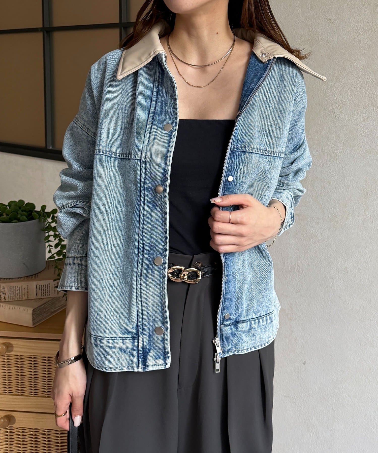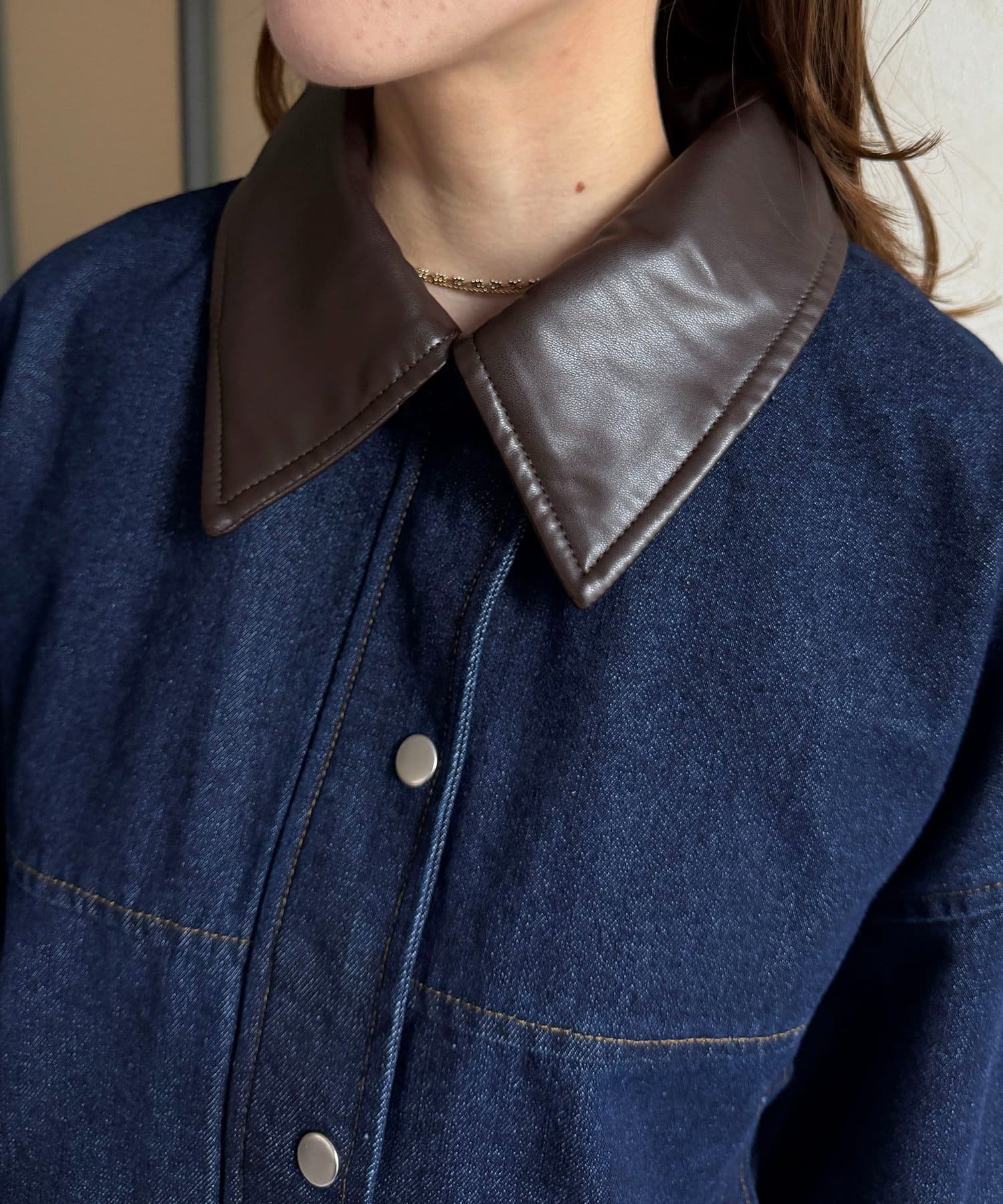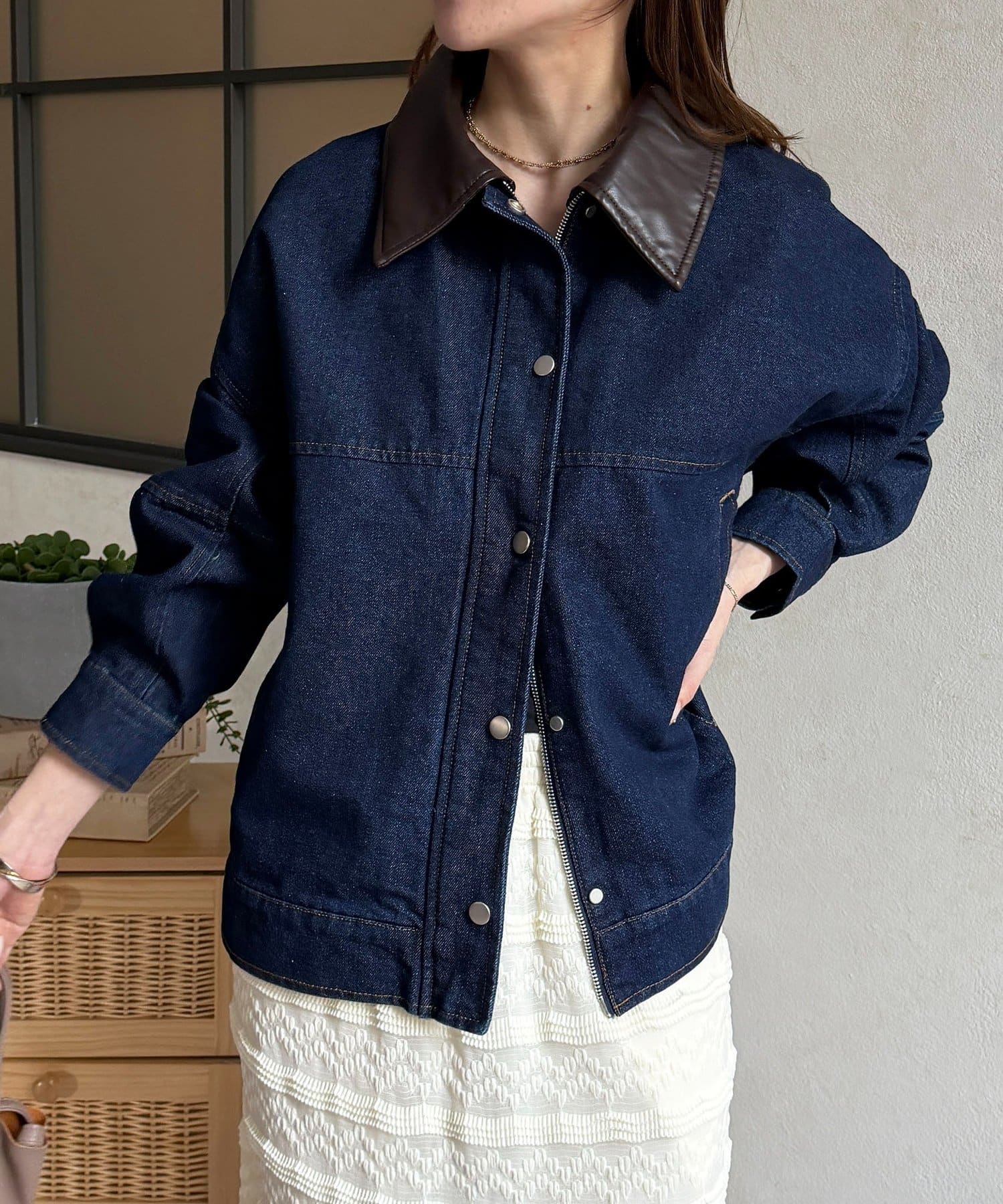・襟の合皮がアクセントになり、トレンド感満載のスタイルに