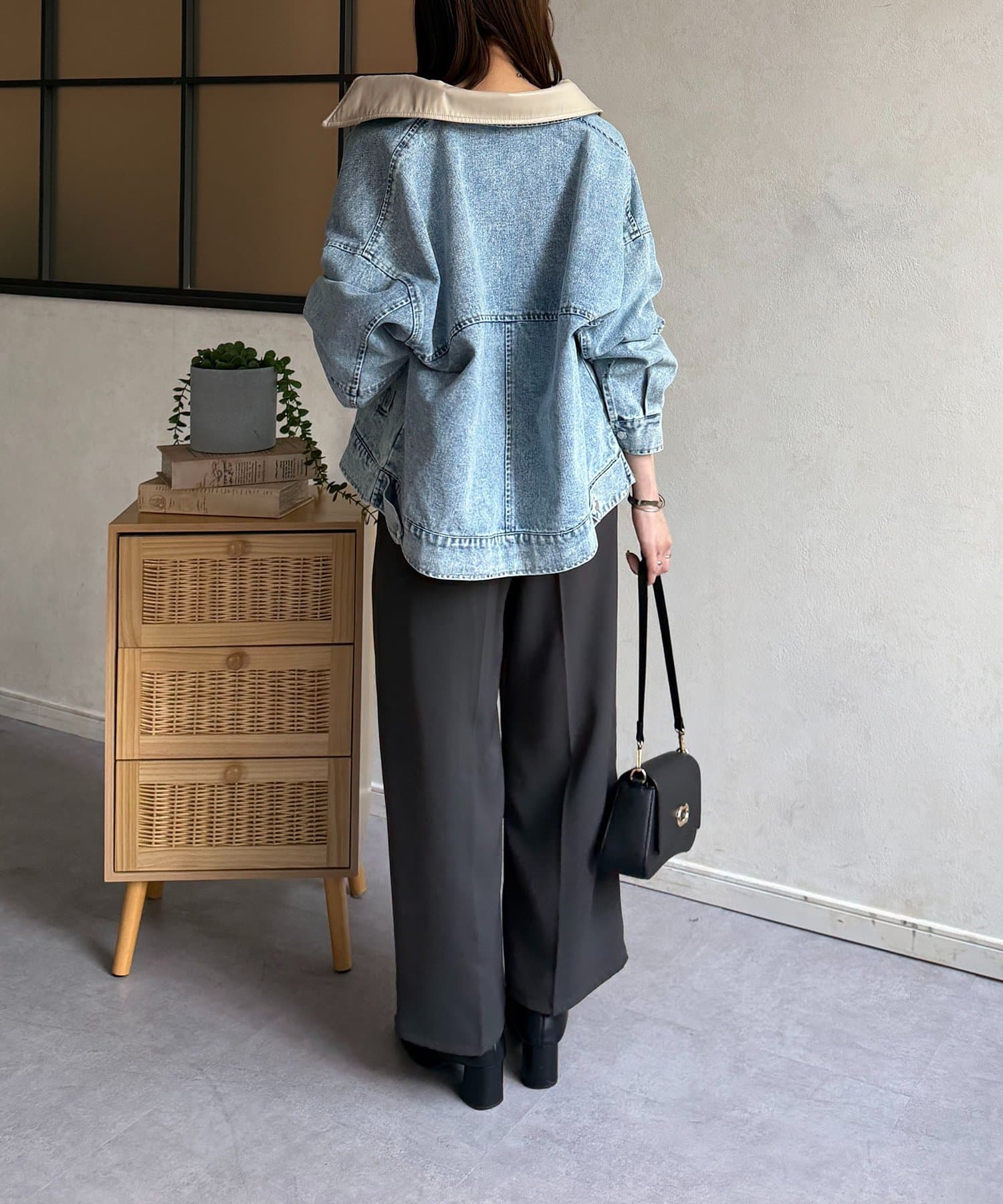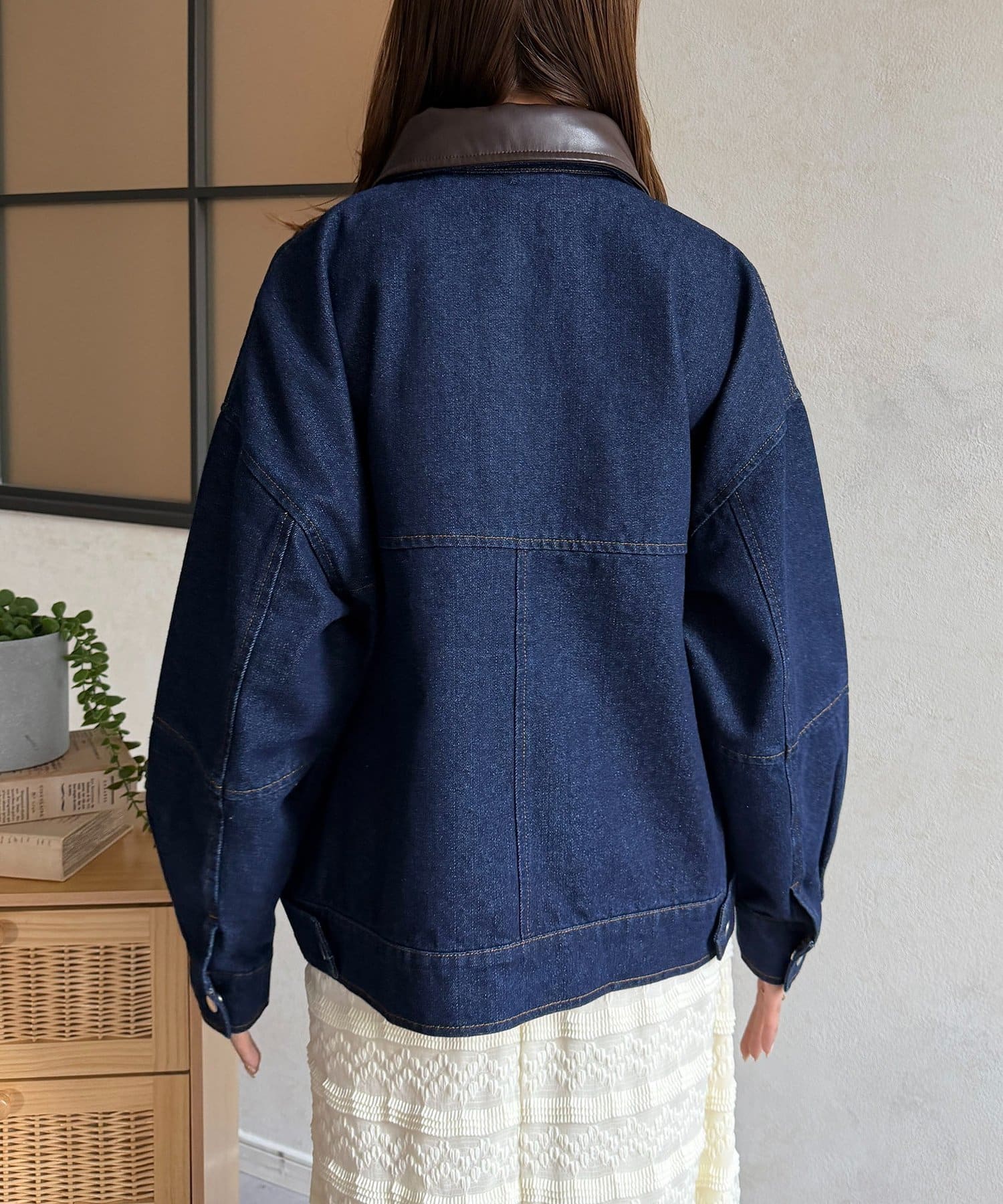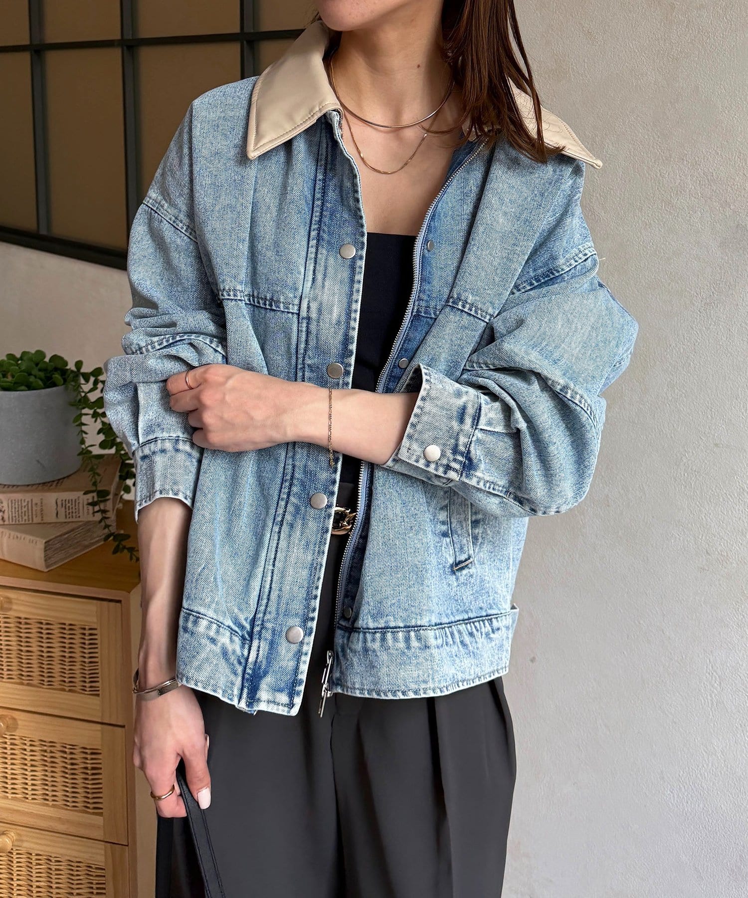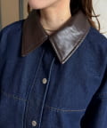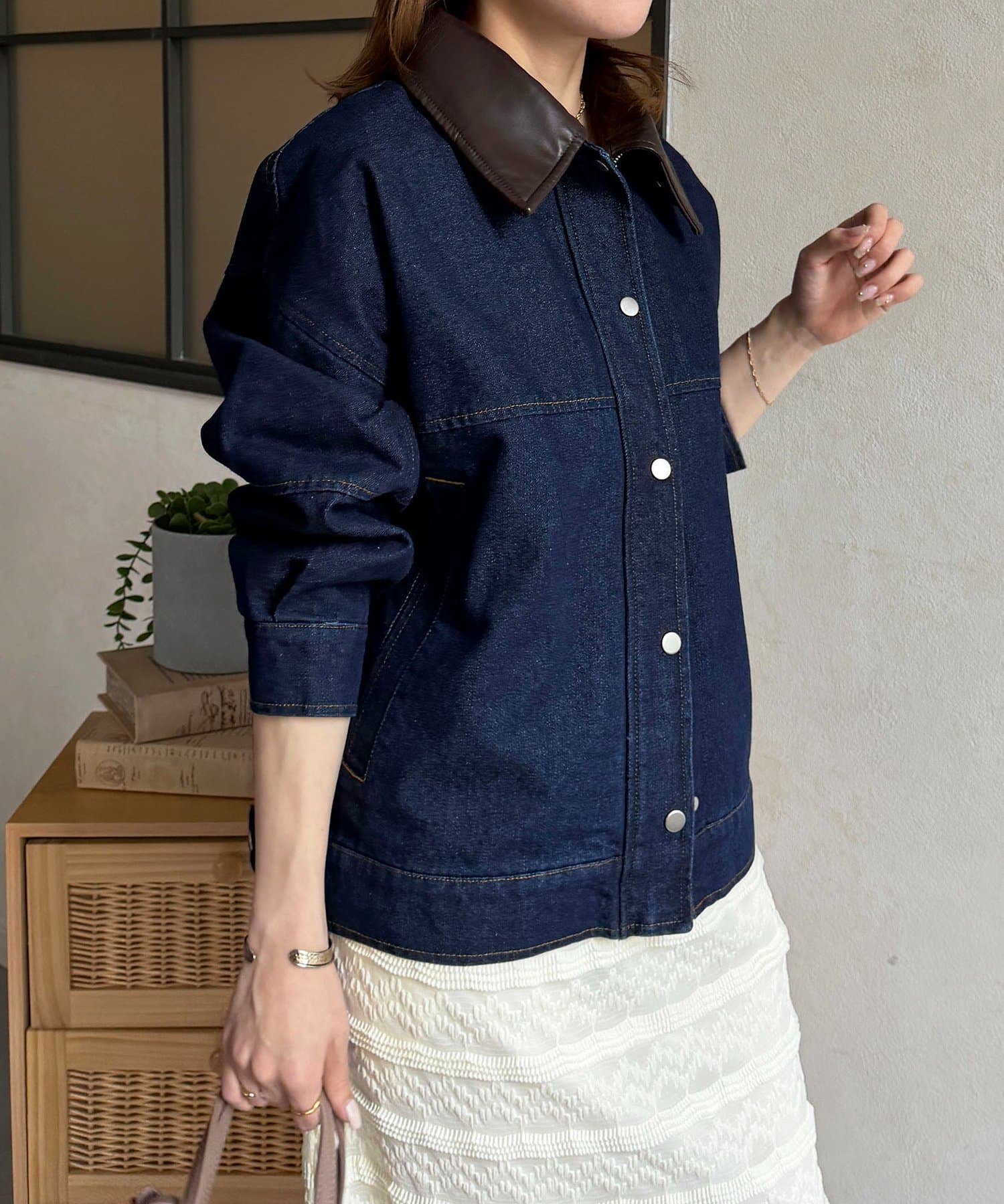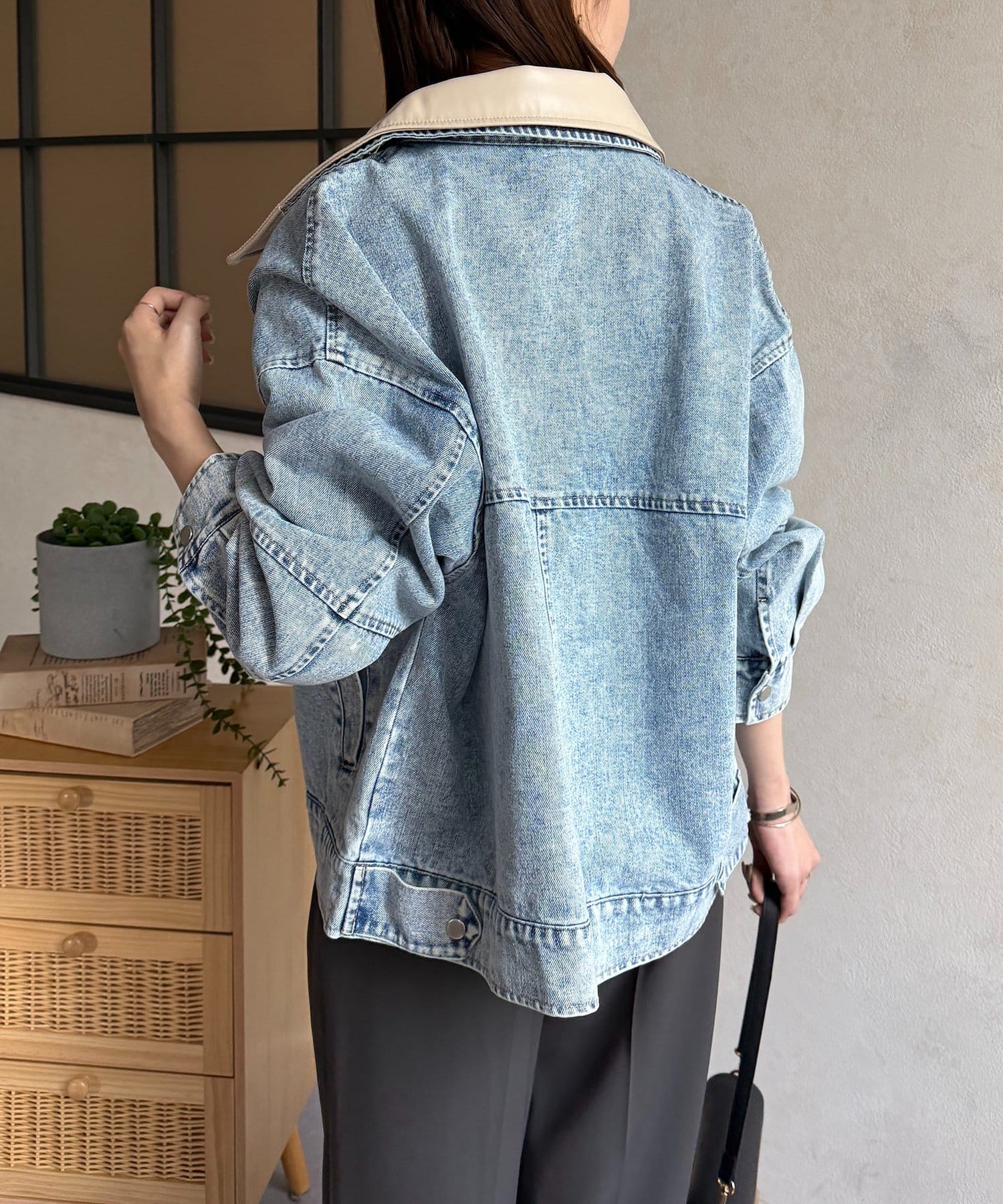 ・襟の合皮がアクセントになり、トレンド感満載のスタイルに