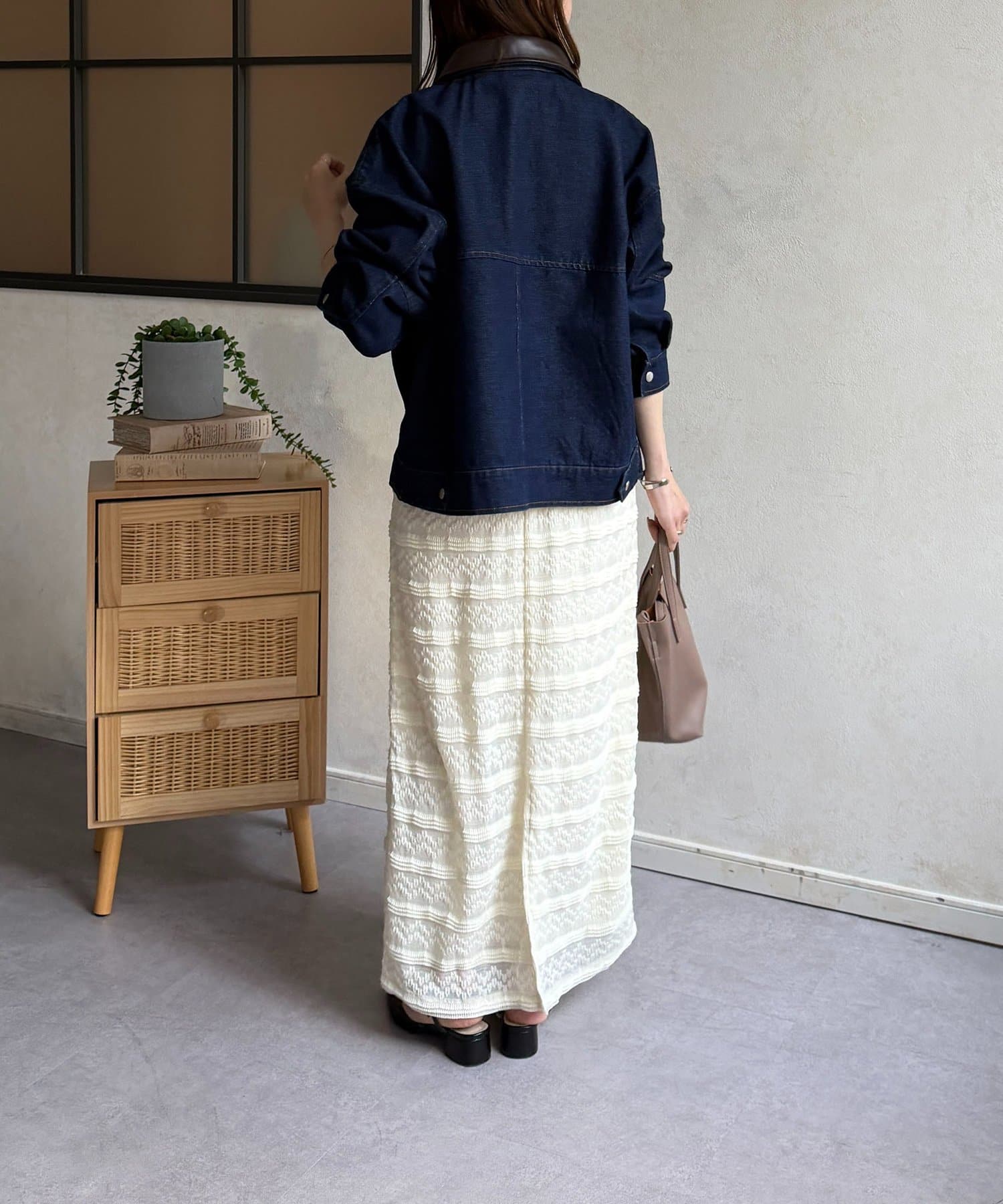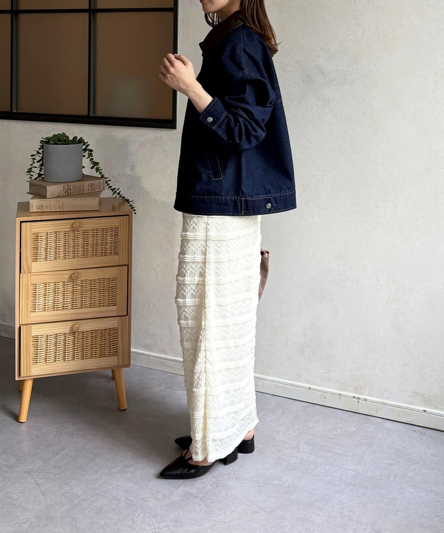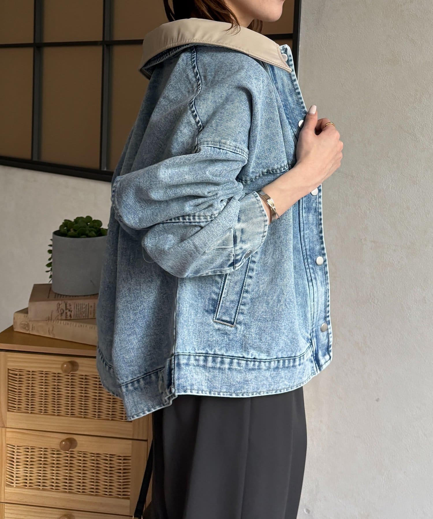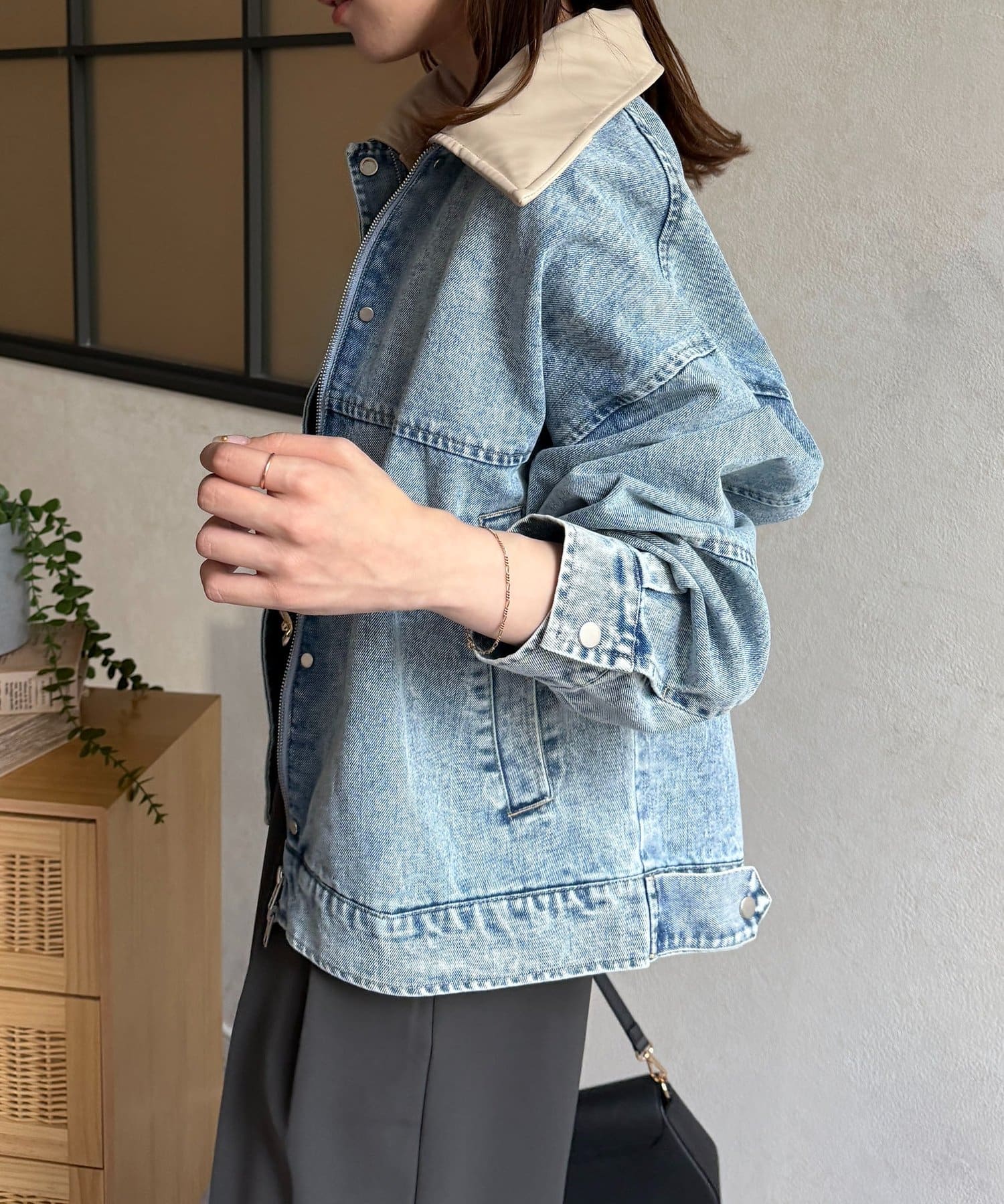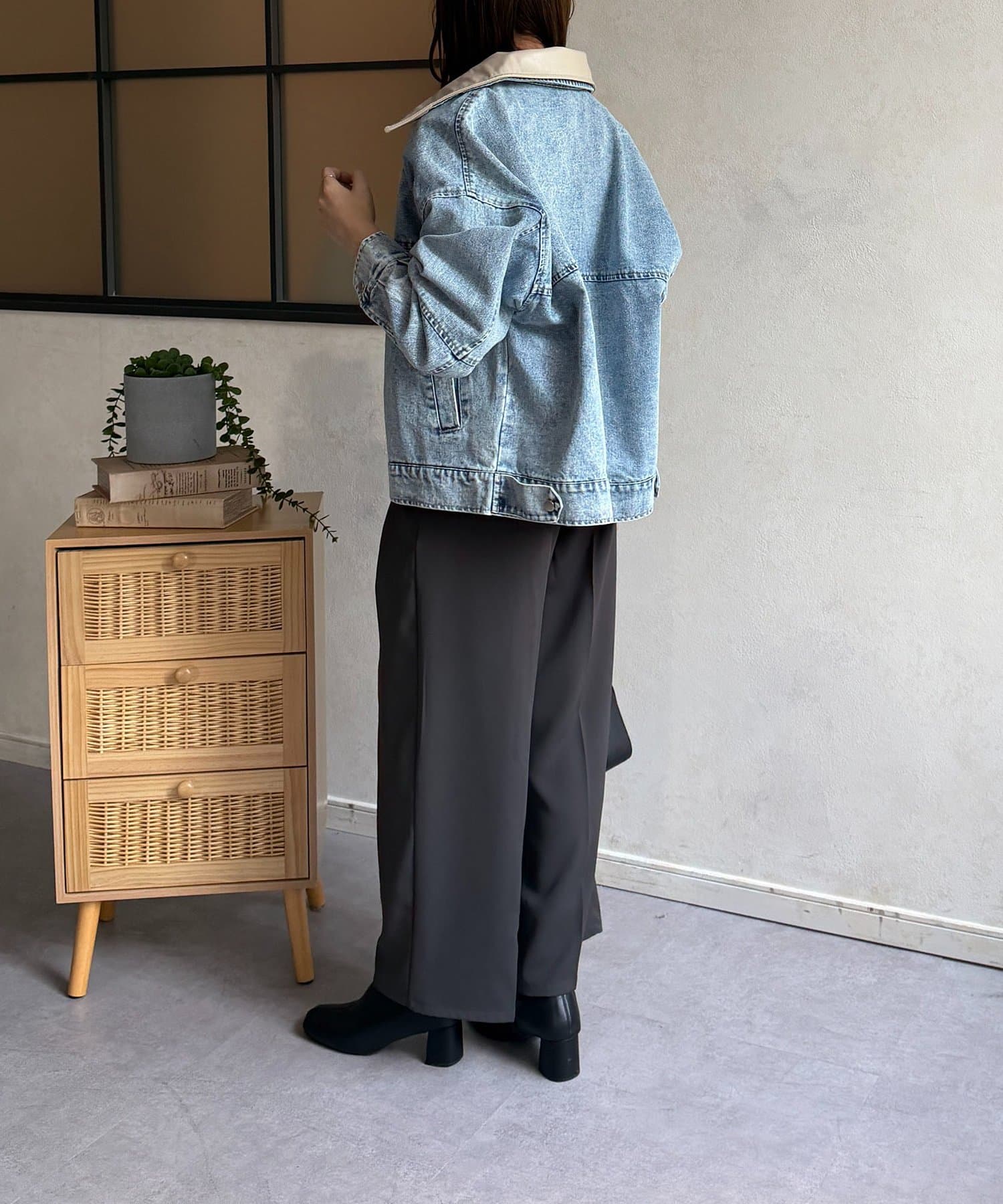 ・襟の合皮がアクセントになり、トレンド感満載のスタイルに