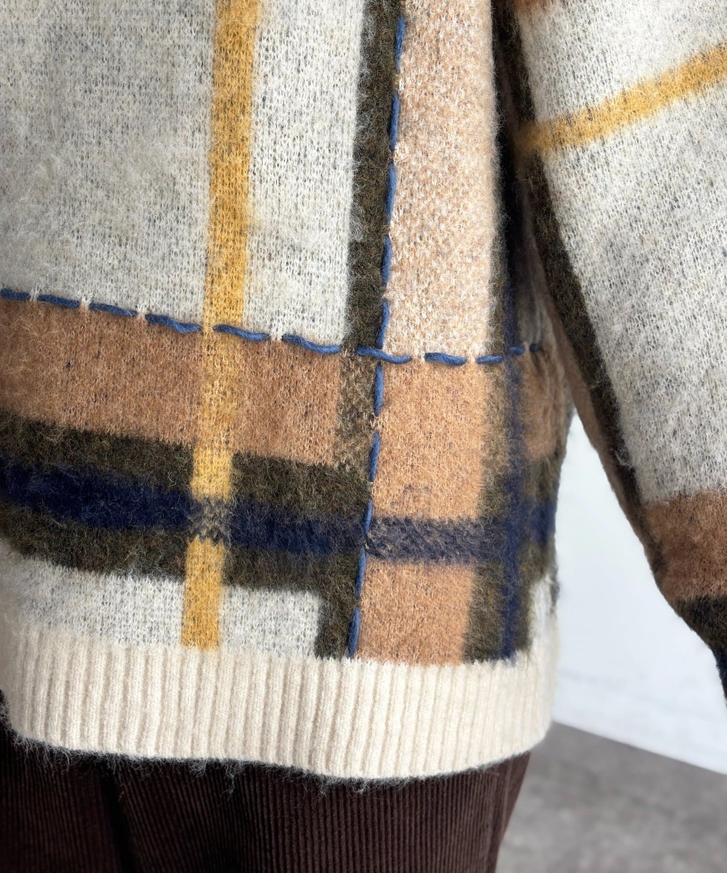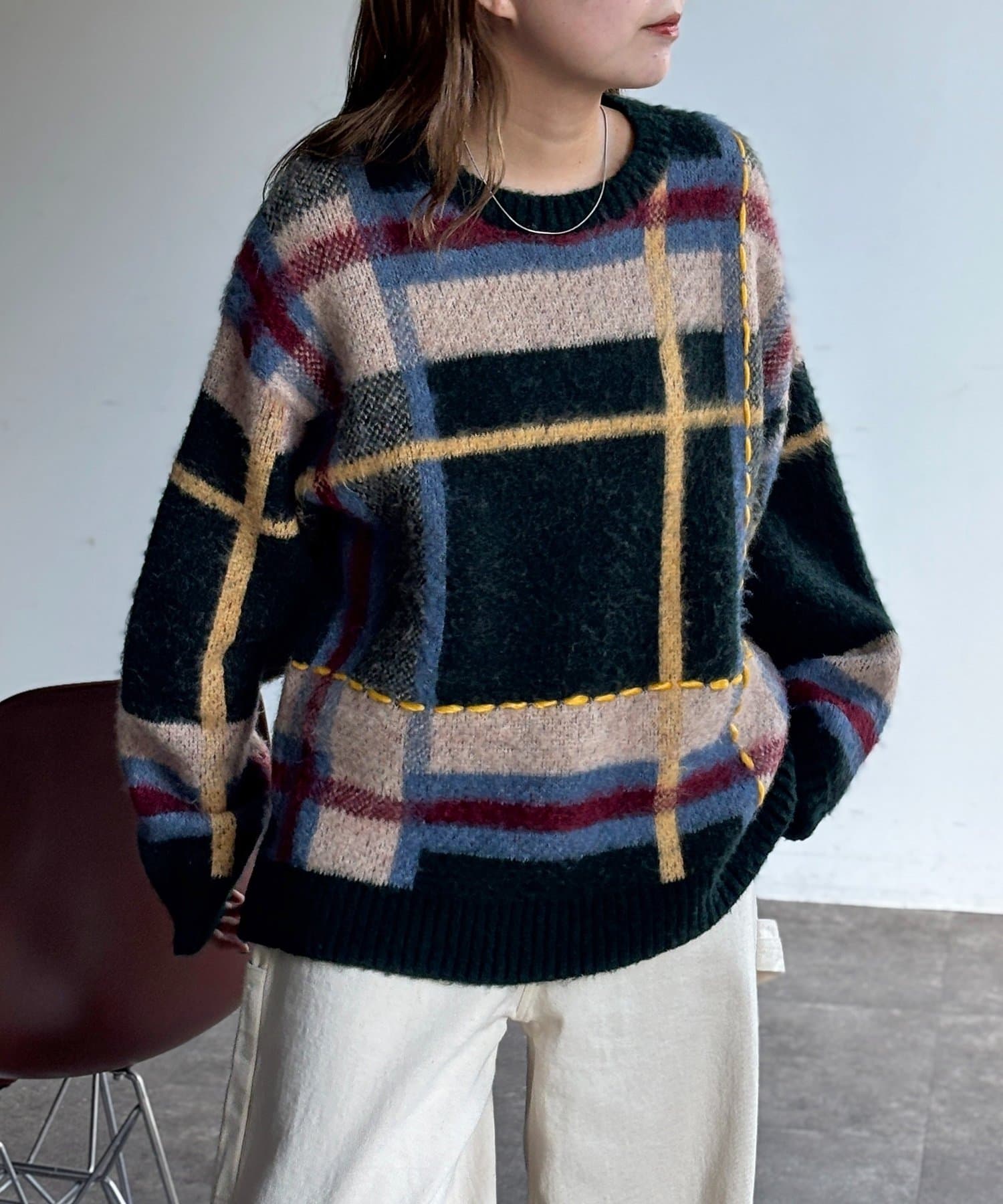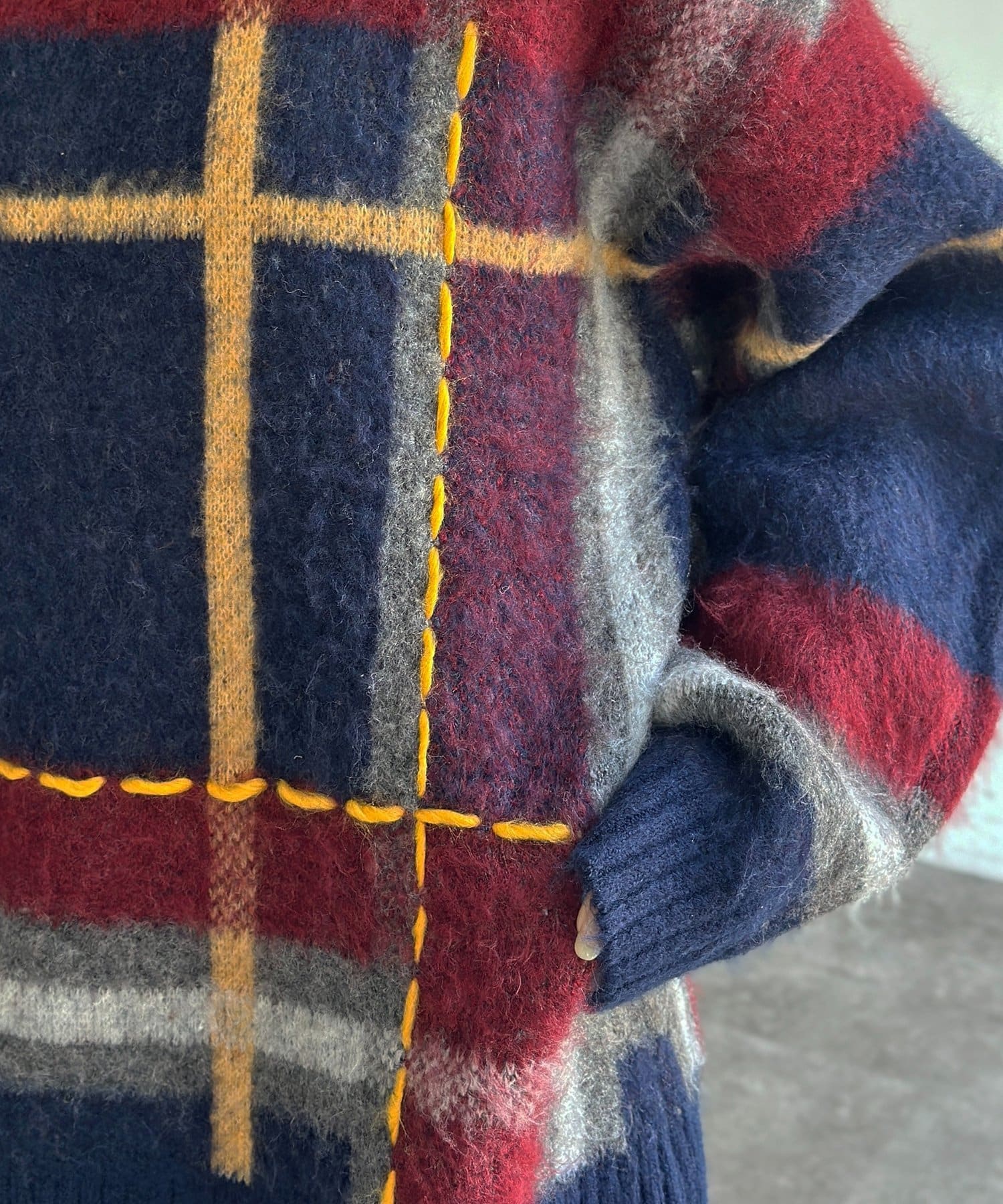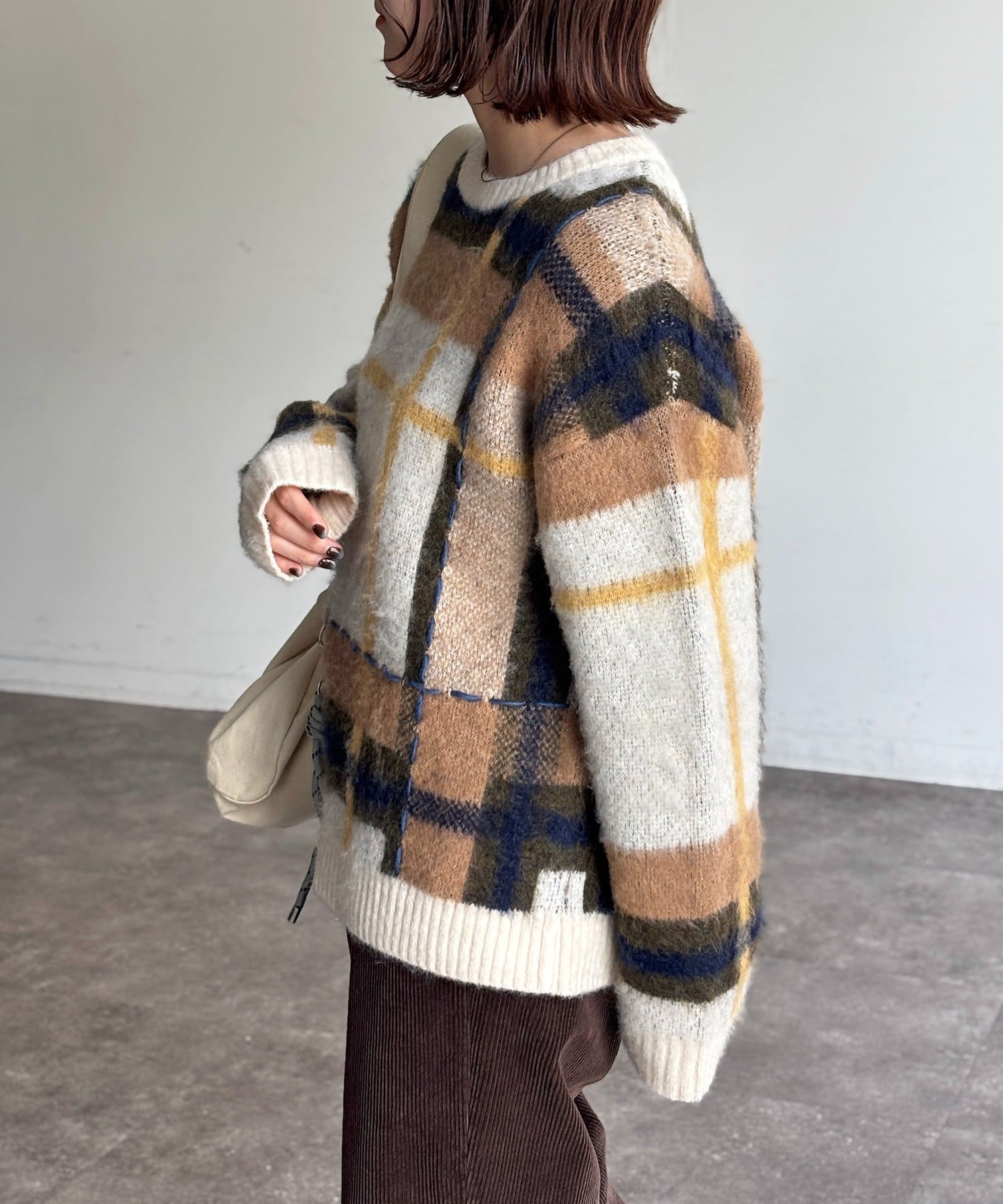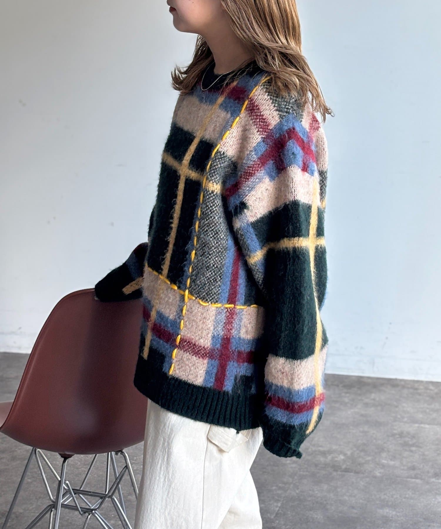 大きめのチェックに暖かみのあるステッチがアクセントのシャギーニット!