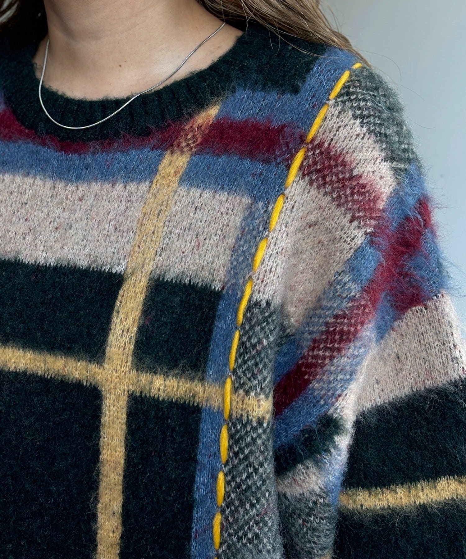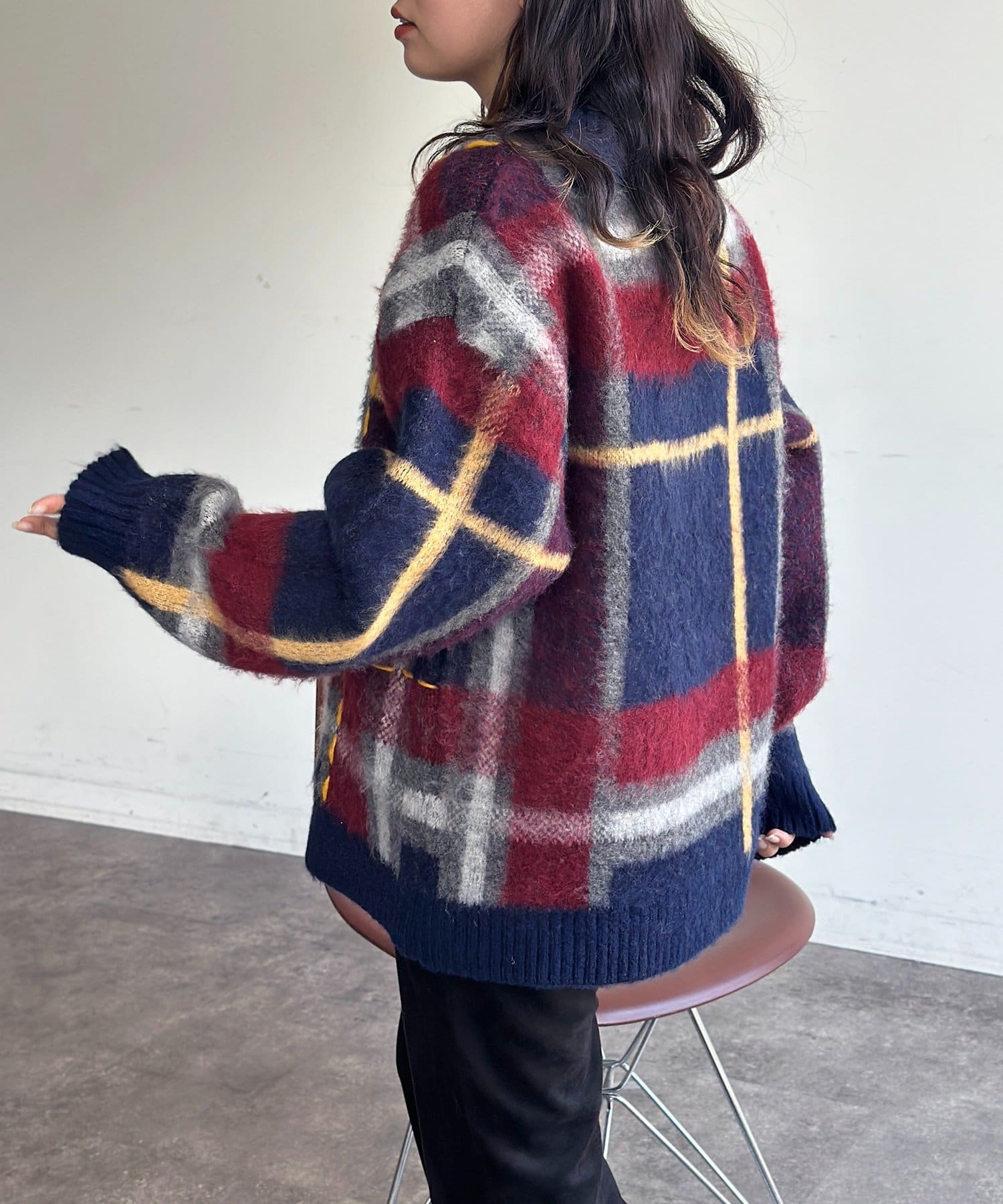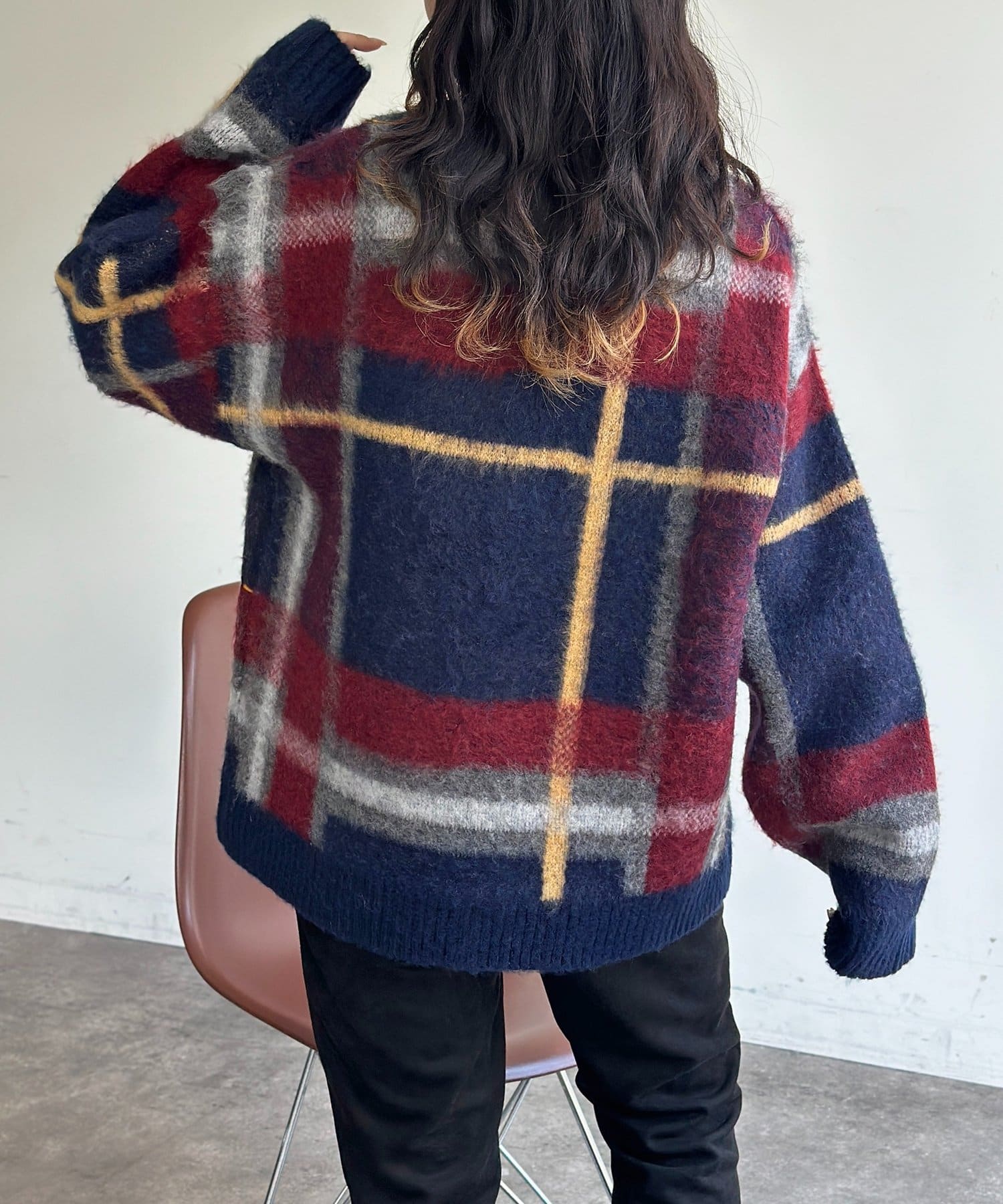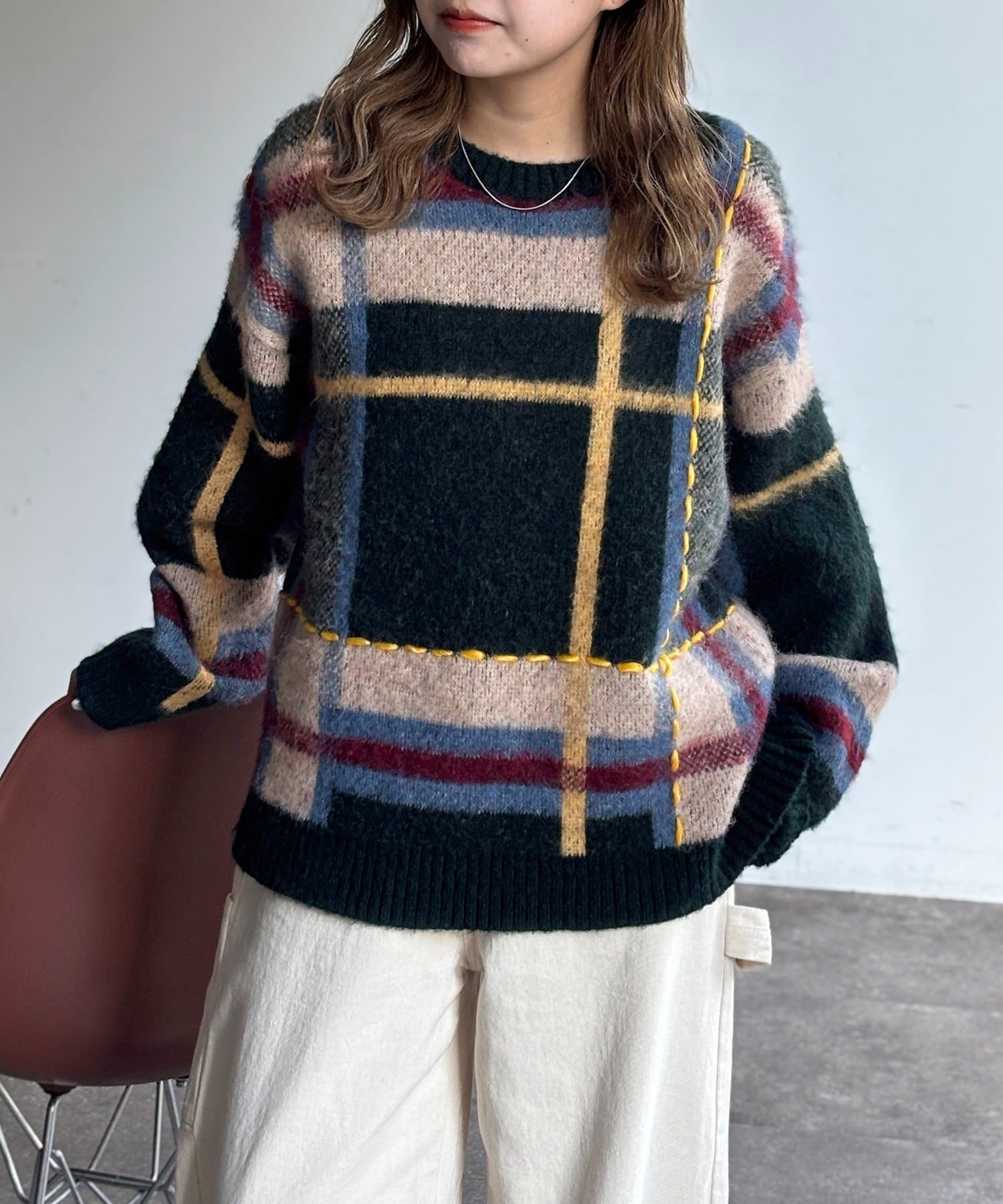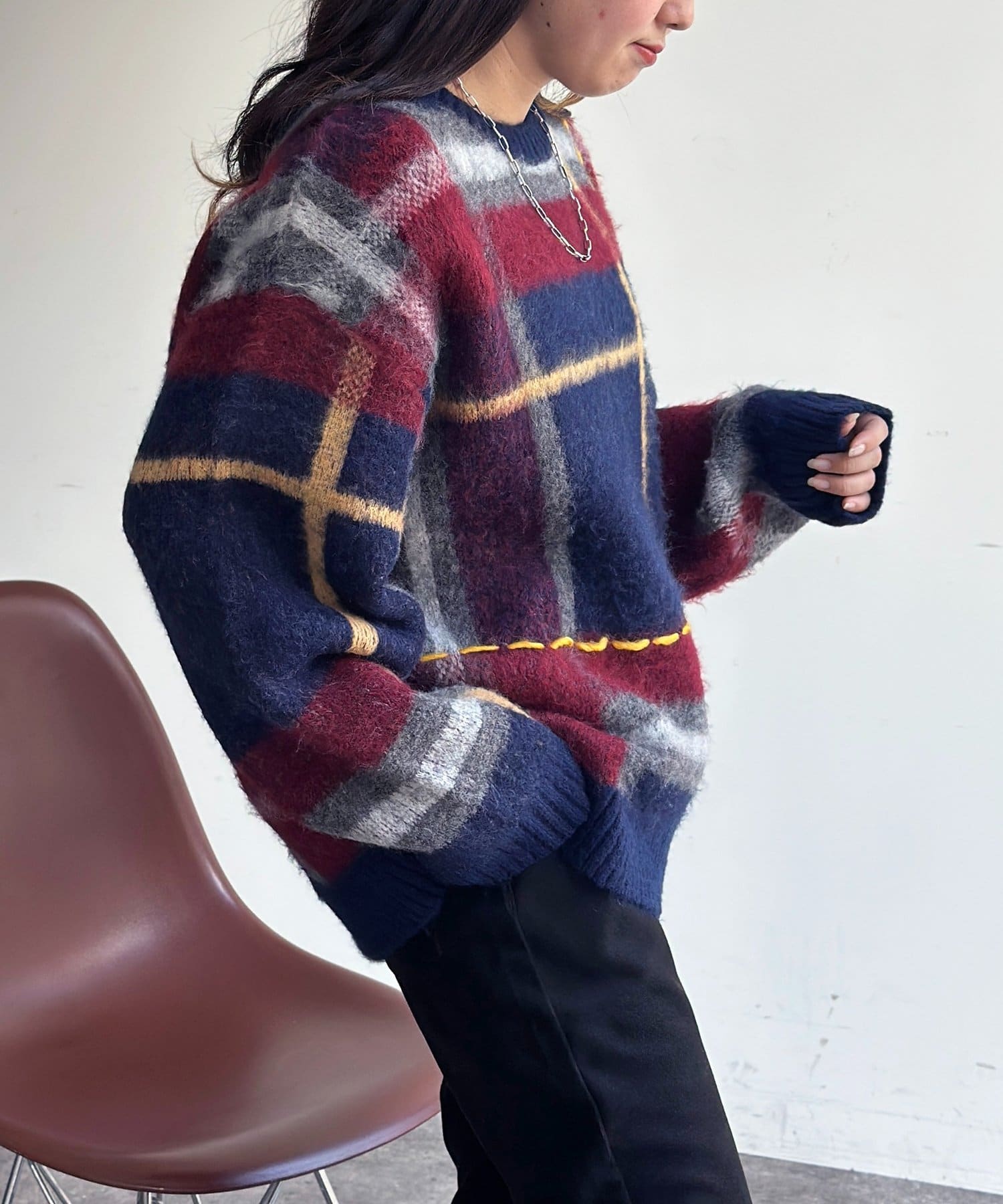 大きめのチェックに暖かみのあるステッチがアクセントのシャギーニット!