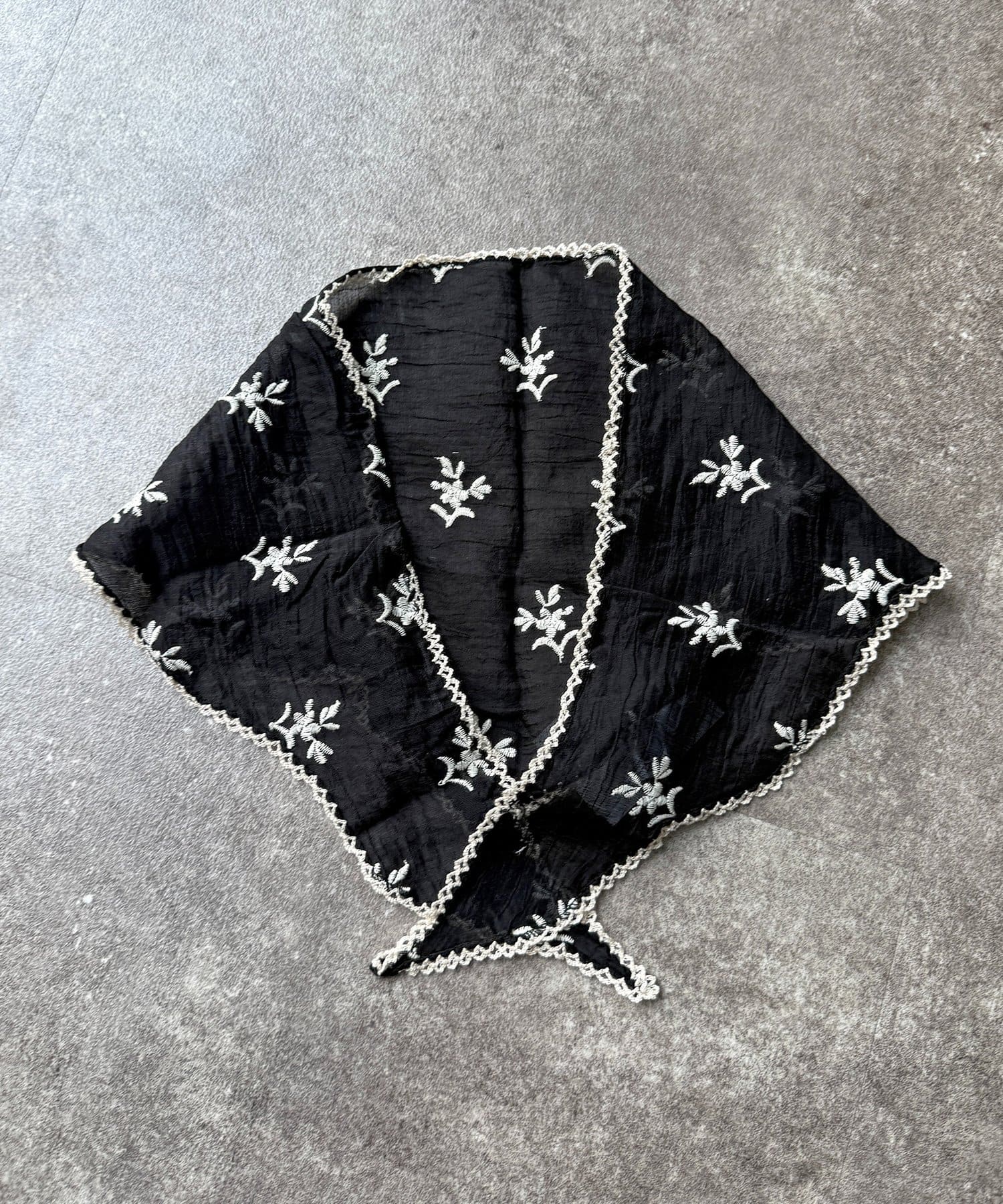 顔周りを華やかに彩る、繊細なリーフ刺繍が魅力のバブーシュカ!