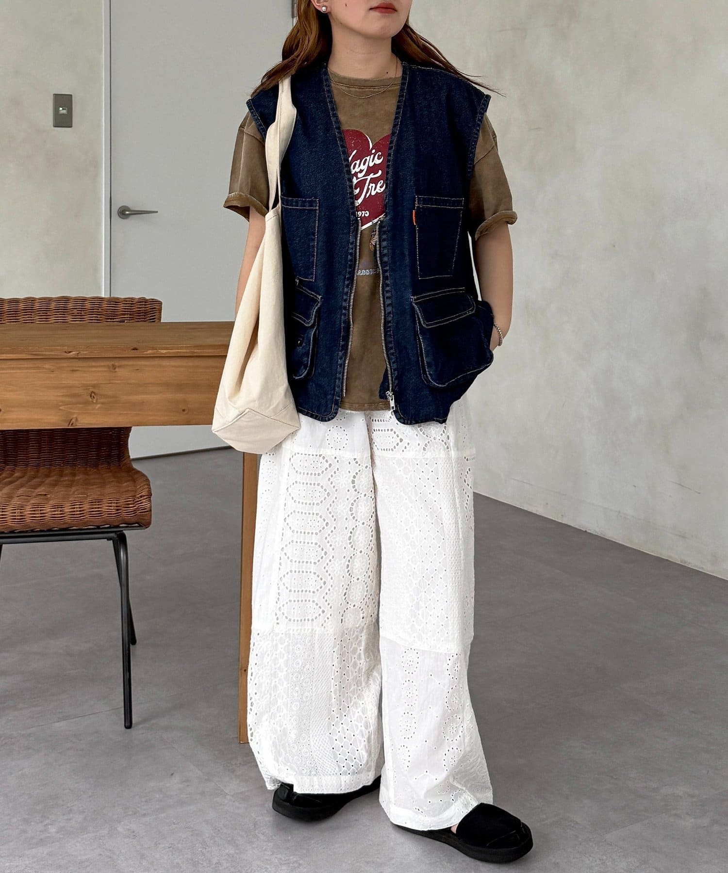 ・ロゴTシャツやデニムベストを合わせた、甘すぎない大人カジュアルな着こなし