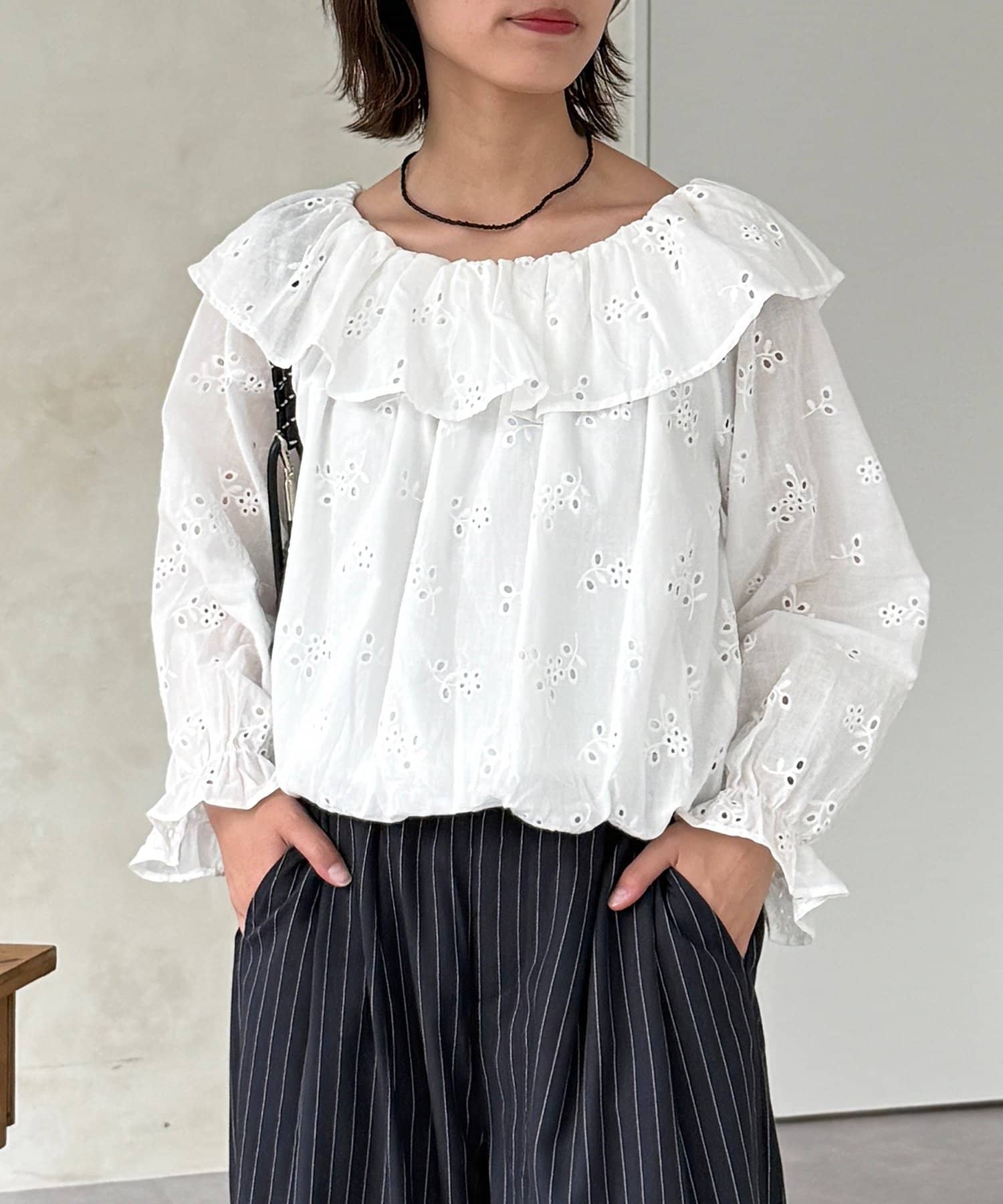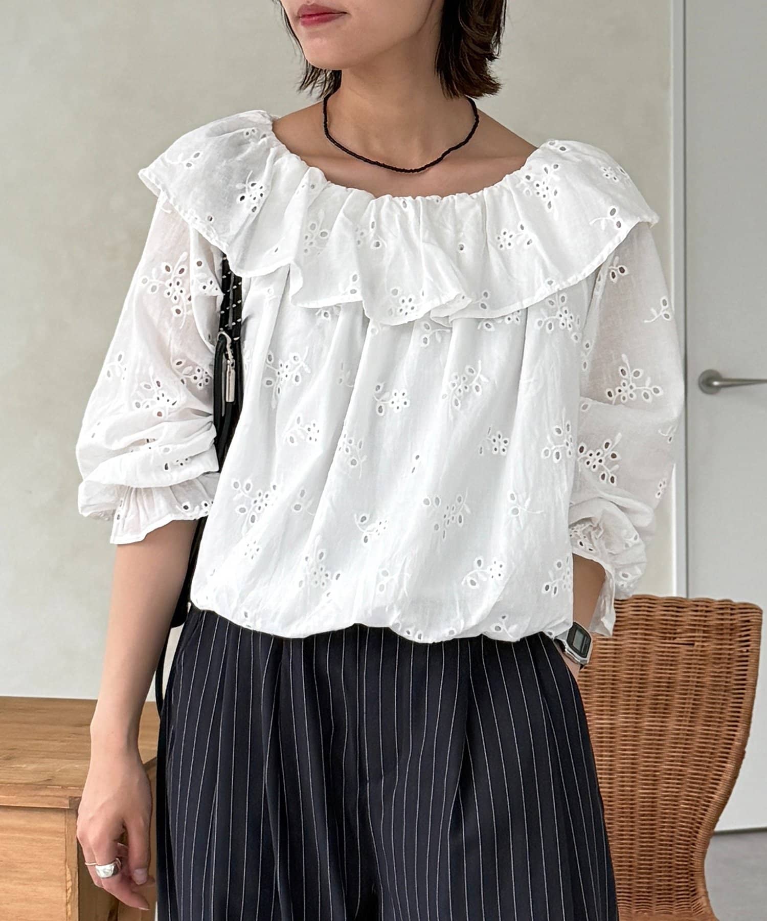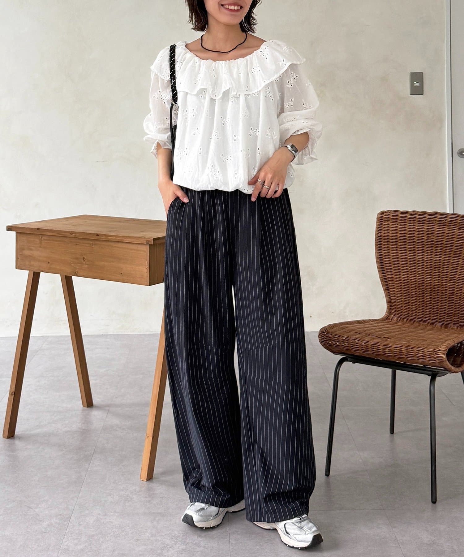 ・ストライプ柄のパンツやデニムと合わせて、甘さを抑えた大人カジュアルな着こなしに