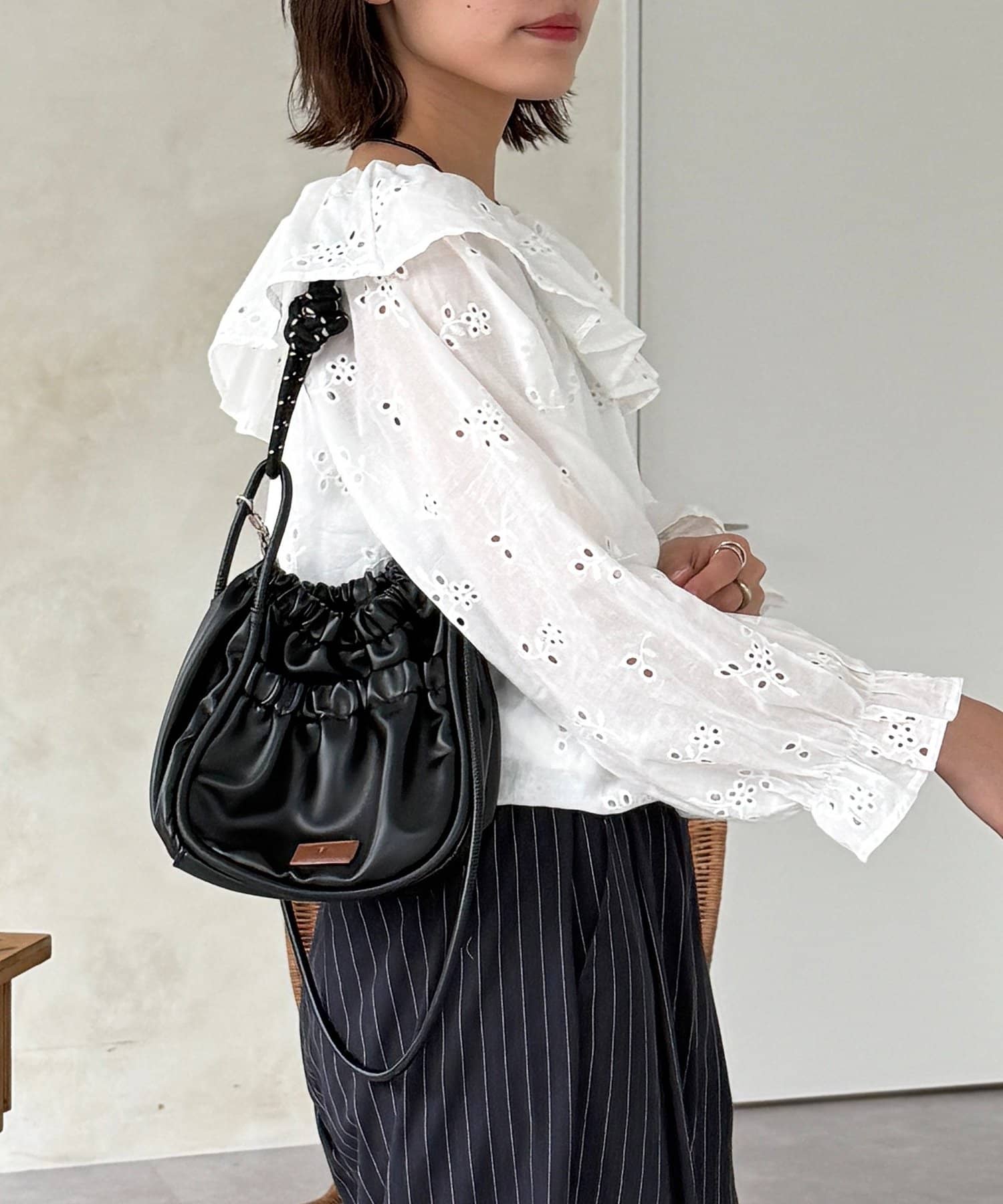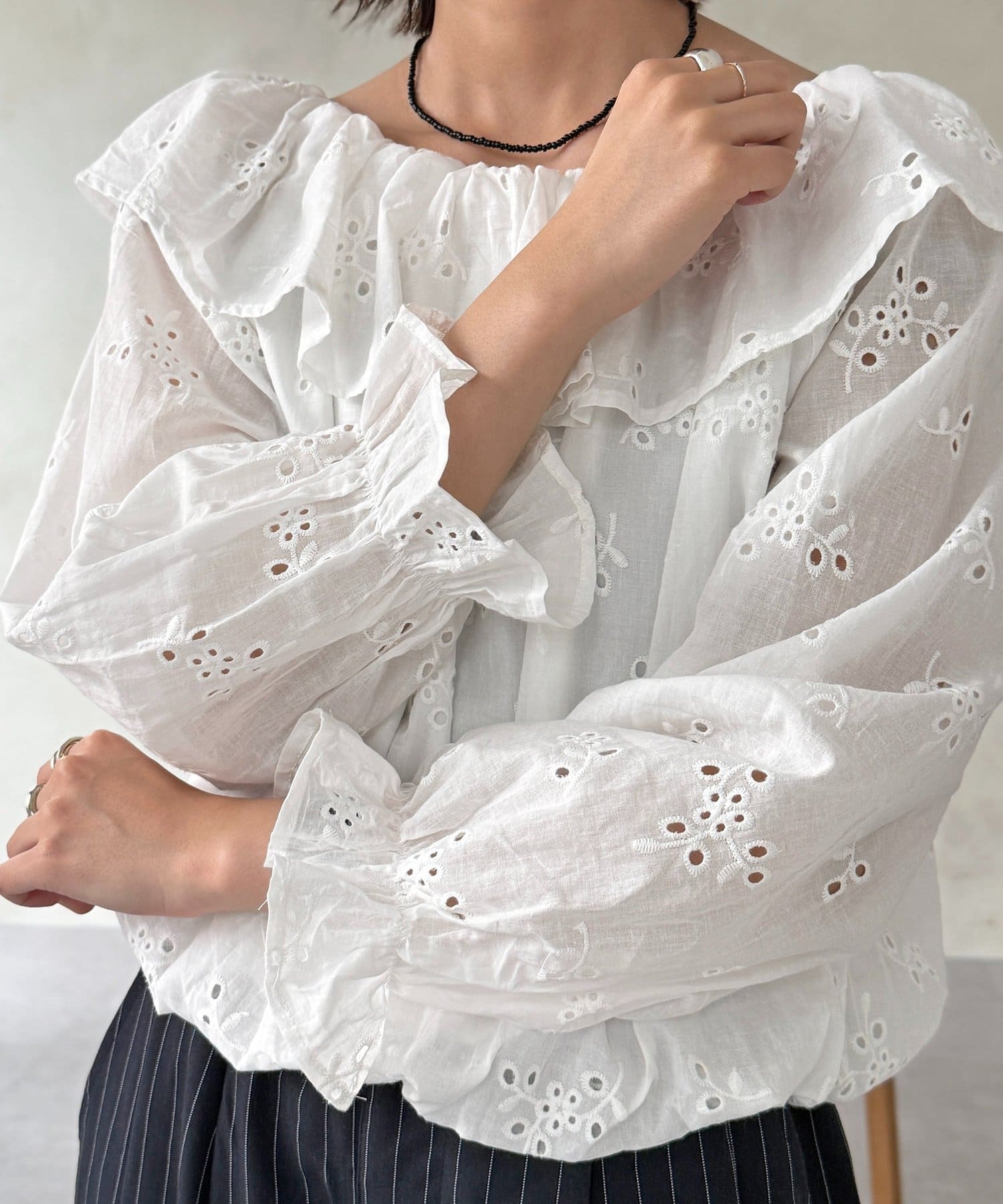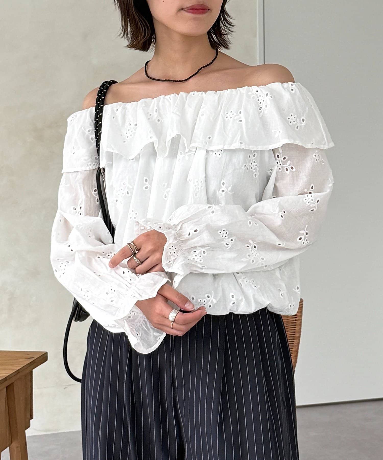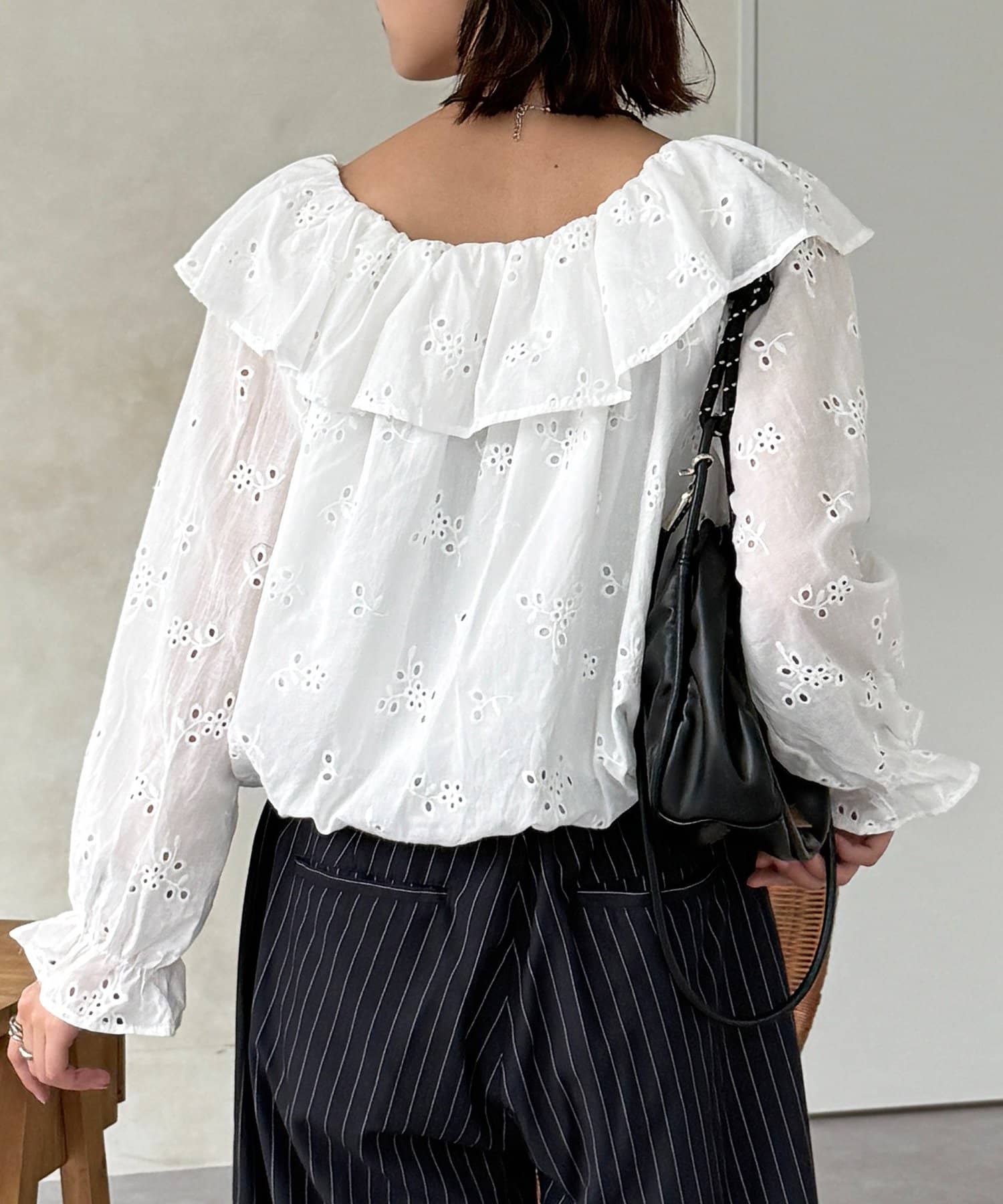 ・ストライプ柄のパンツやデニムと合わせて、甘さを抑えた大人カジュアルな着こなしに