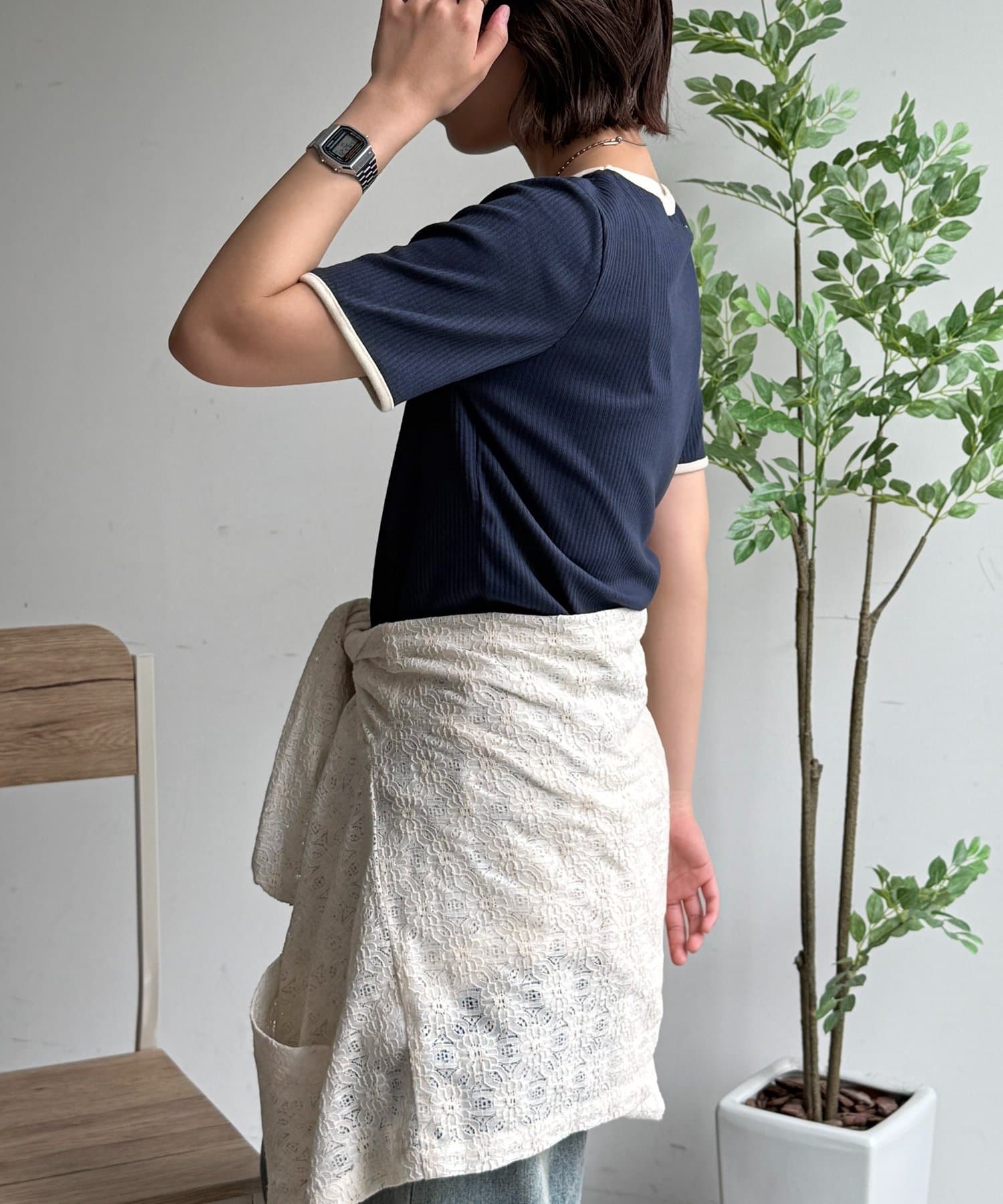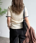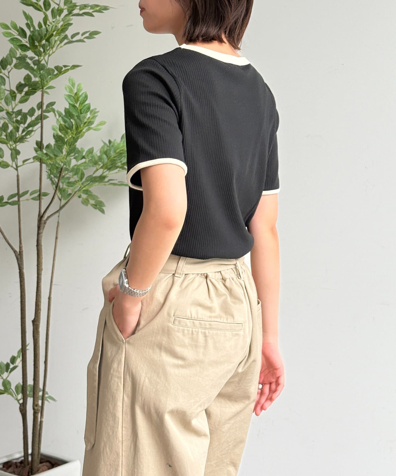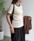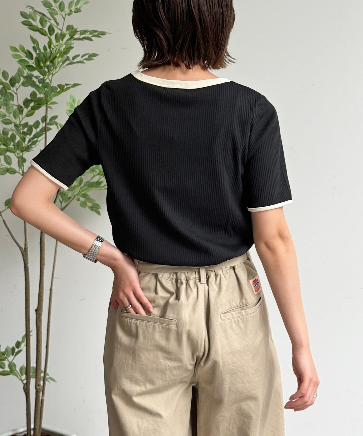 首元と袖口の配色デザインが、シンプルなコーディネートにもさりげないアクセントを加えてくれる一枚。
