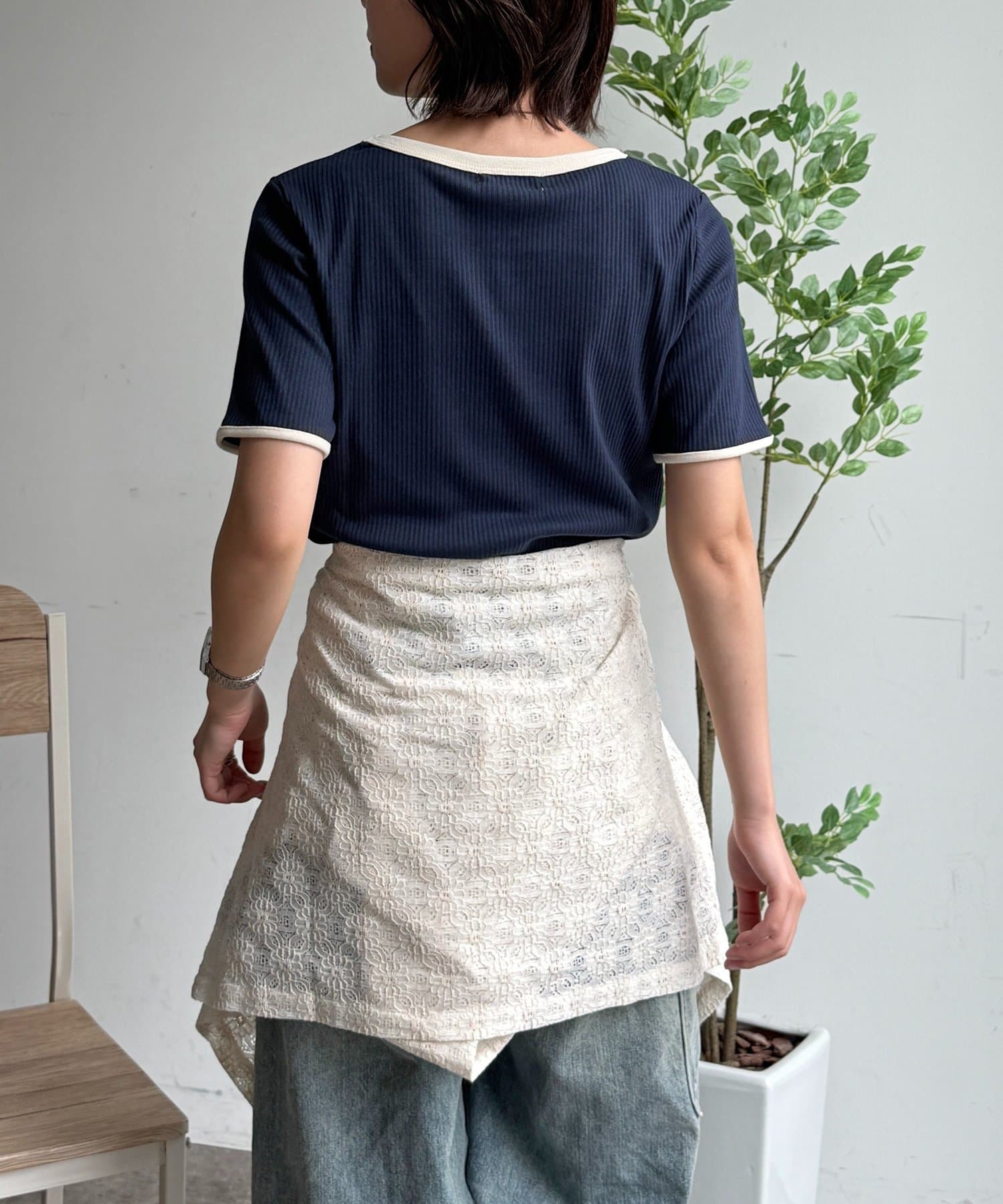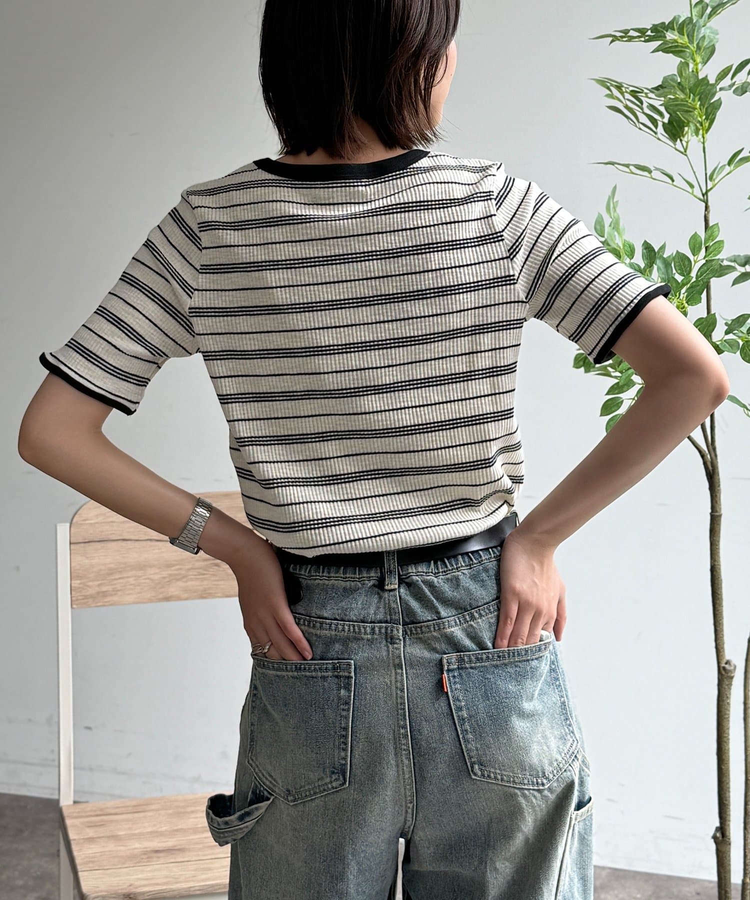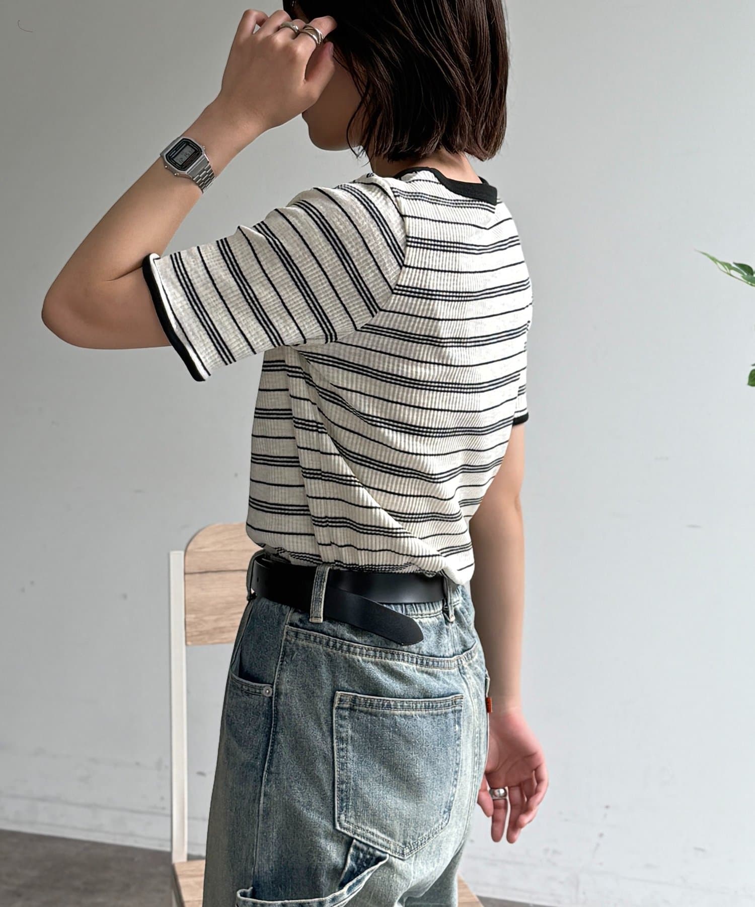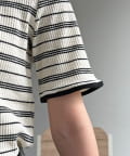 首元と袖口の配色デザインが、シンプルなコーディネートにもさりげないアクセントを加えてくれる一枚。