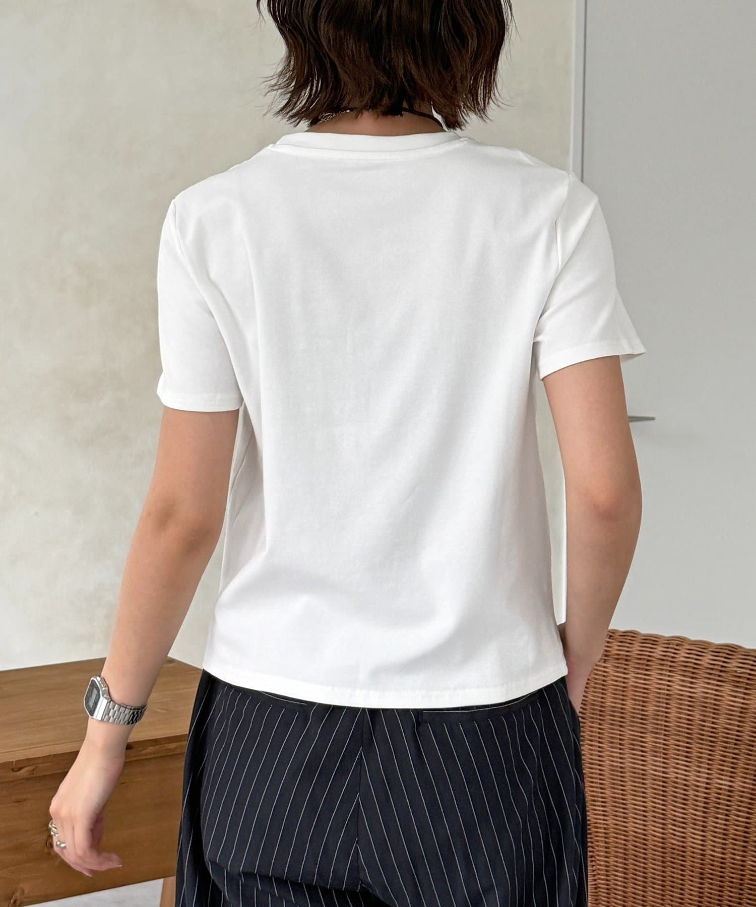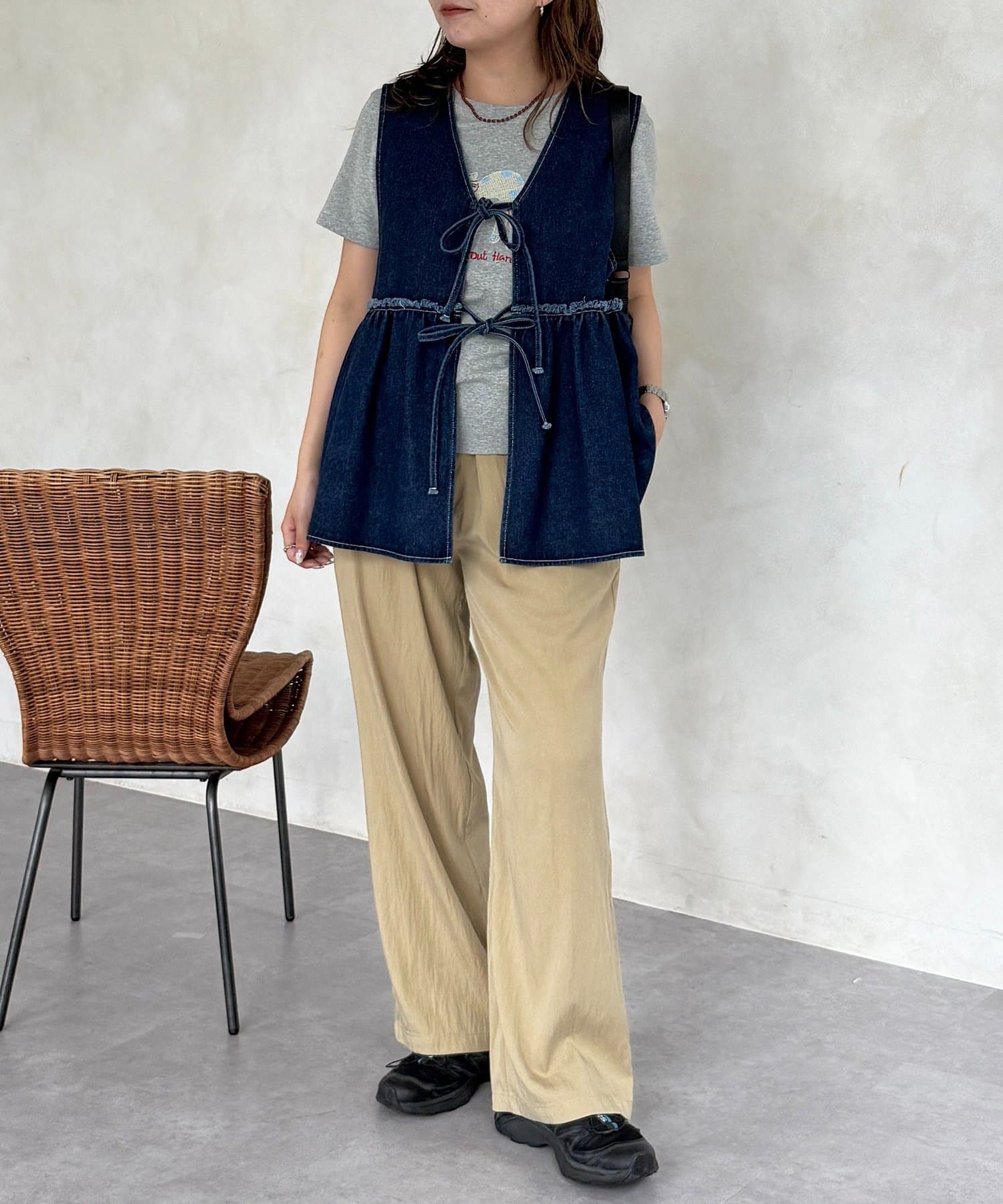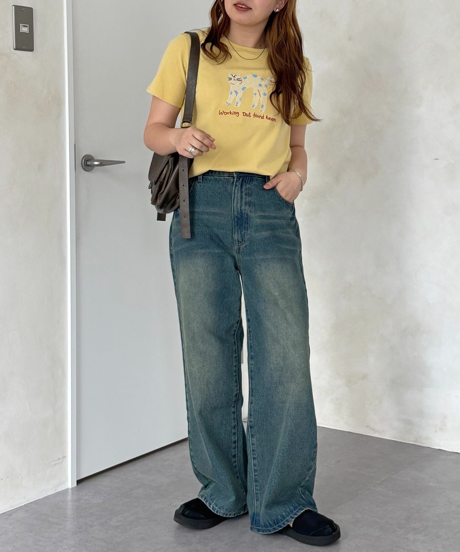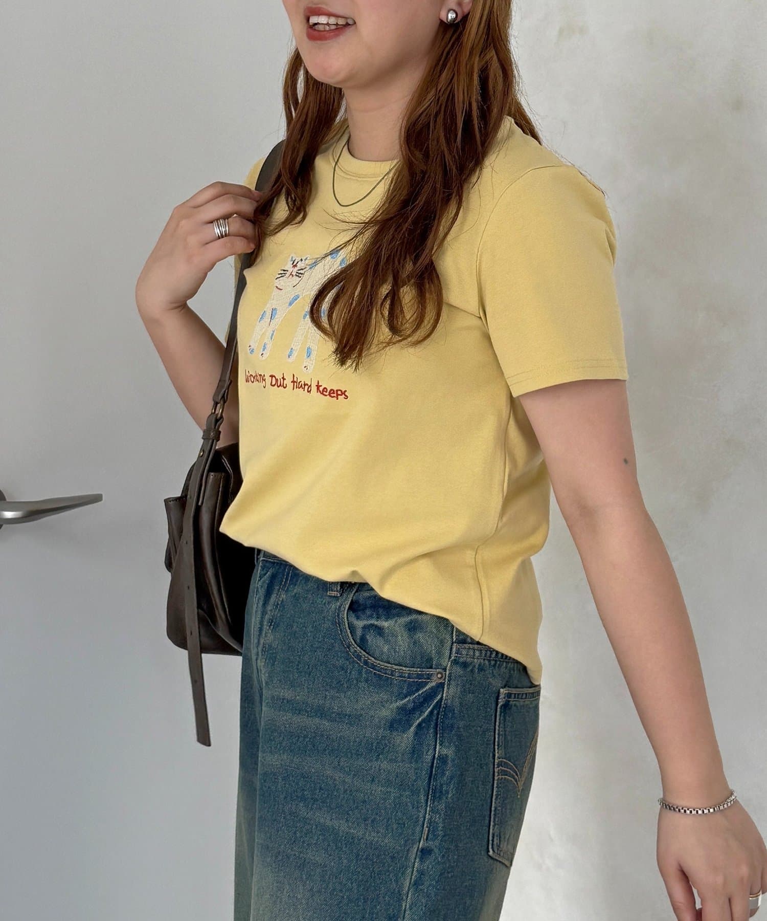 ・デニムやワイドパンツと合わせて、Tシャツの刺繍を主役にしたカジュアルスタイル