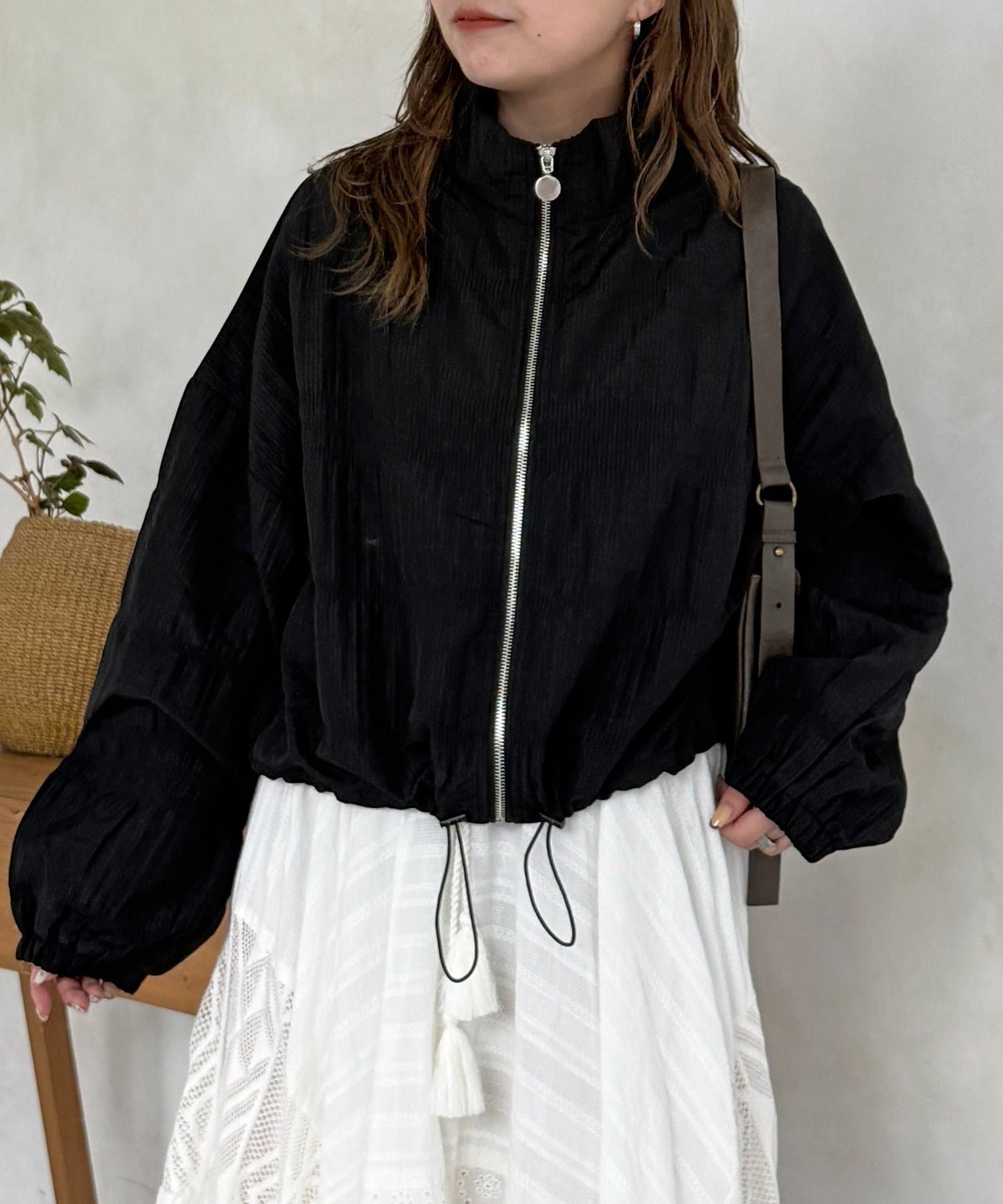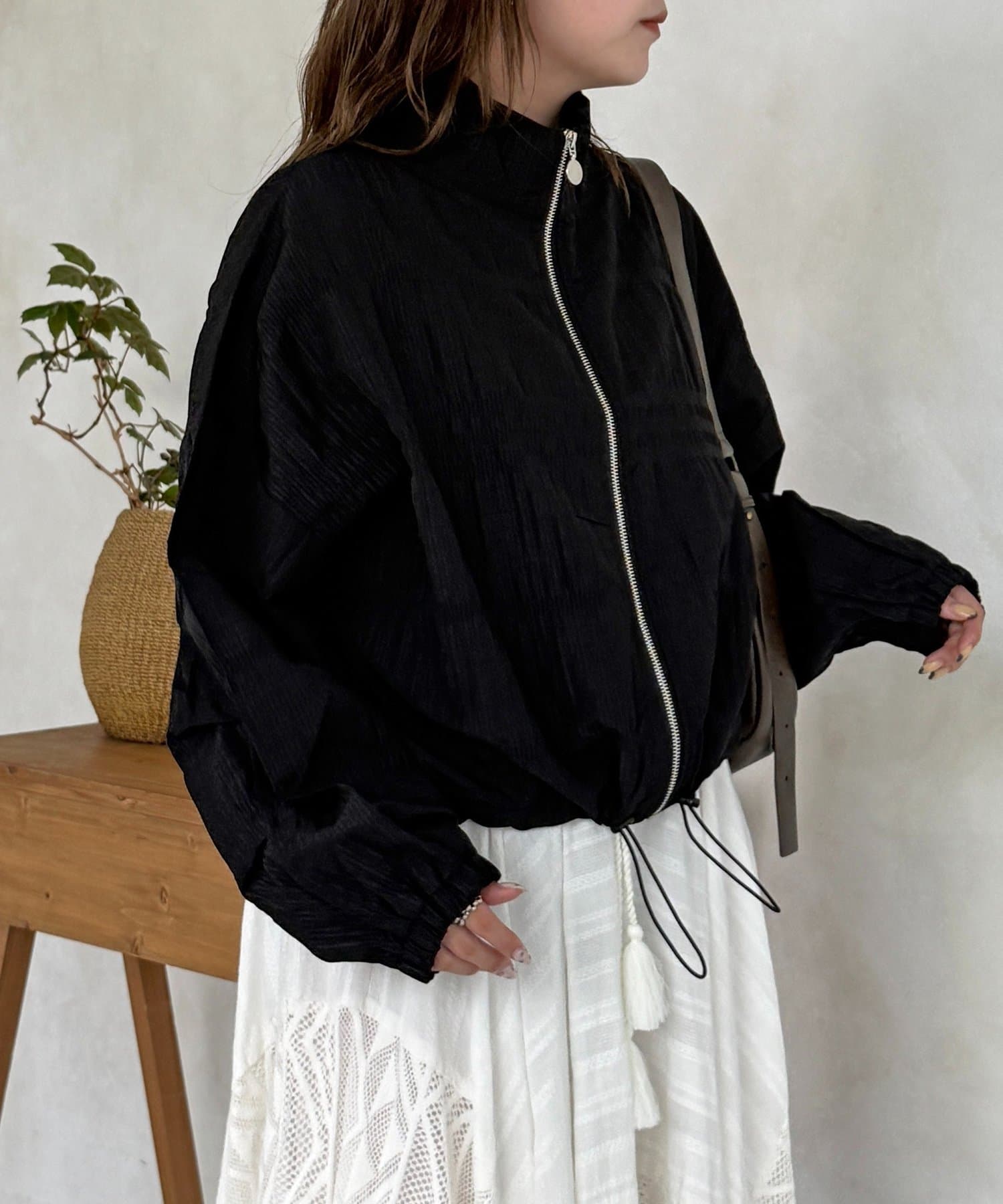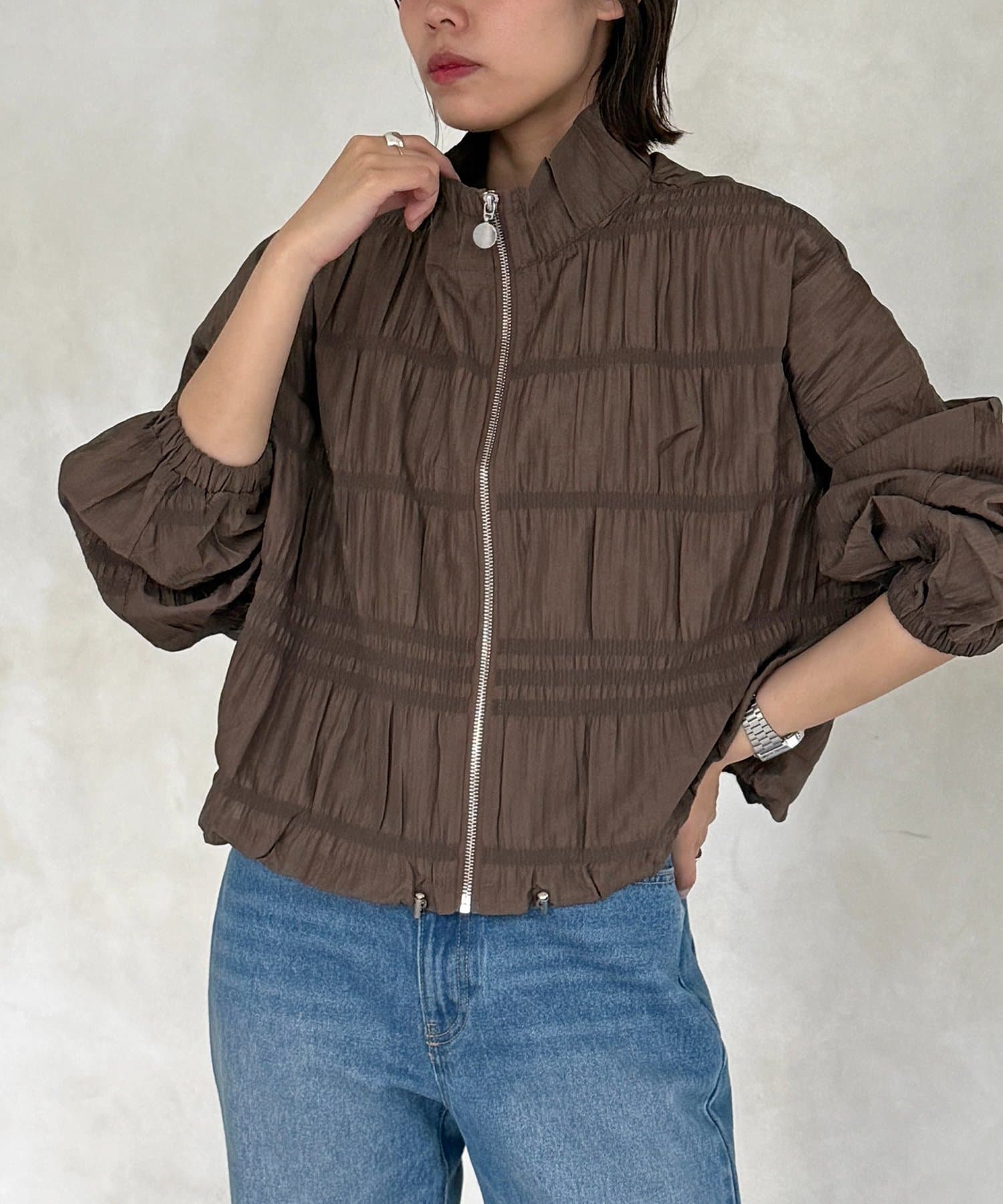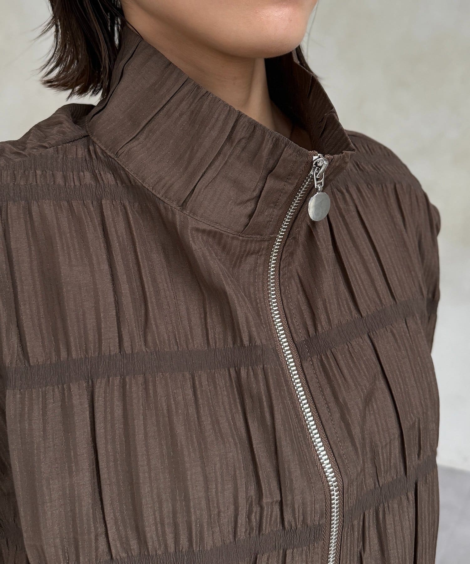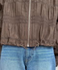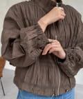 繊細なシャーリングが全面に施された、表情豊かなジップブルゾン。