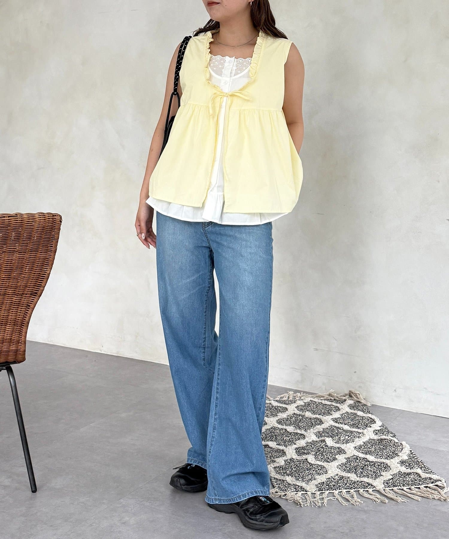 胸元のリボンとさりげないフリルが、カジュアルな中に女性らしい甘さをプラスしてくれます◎