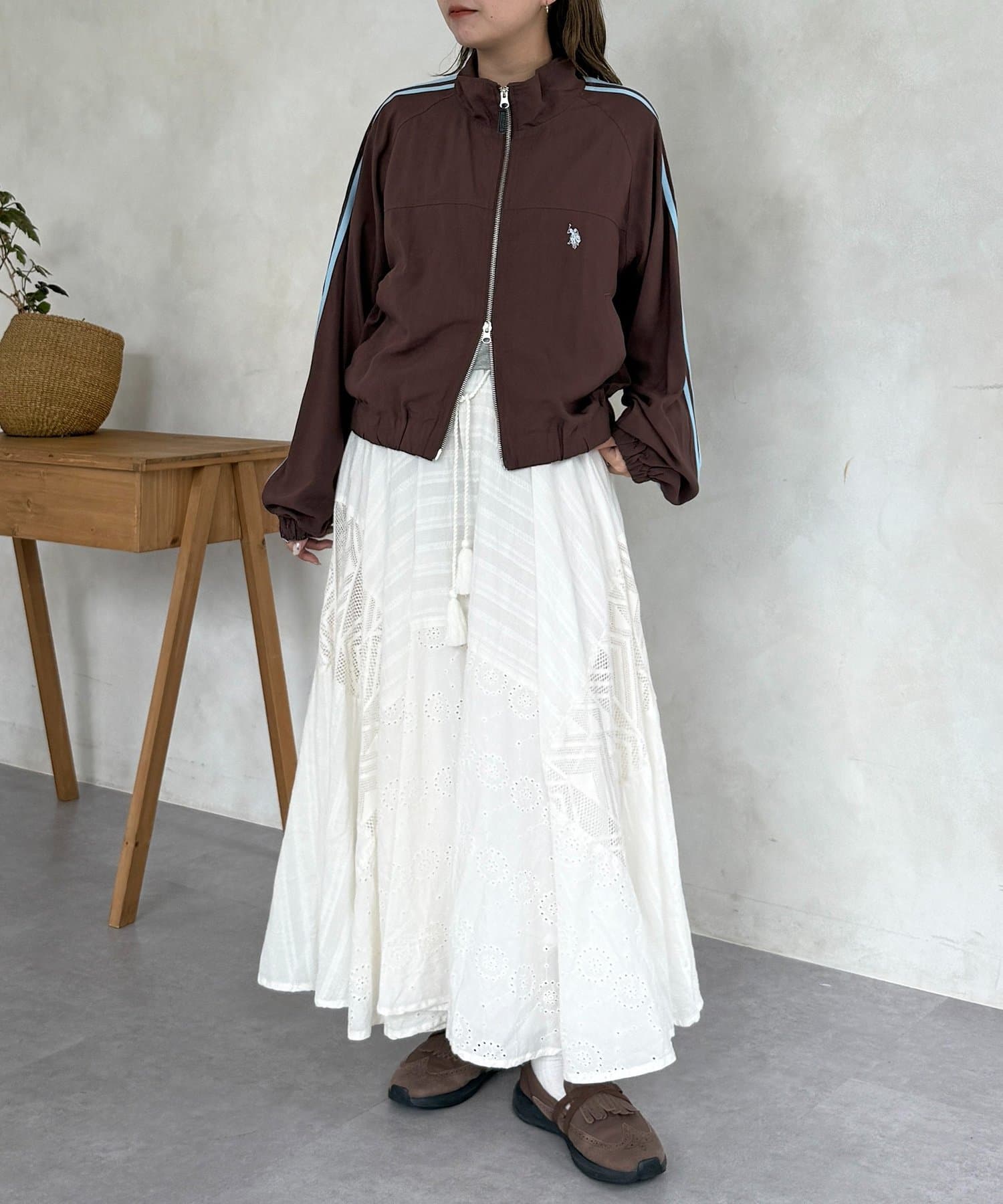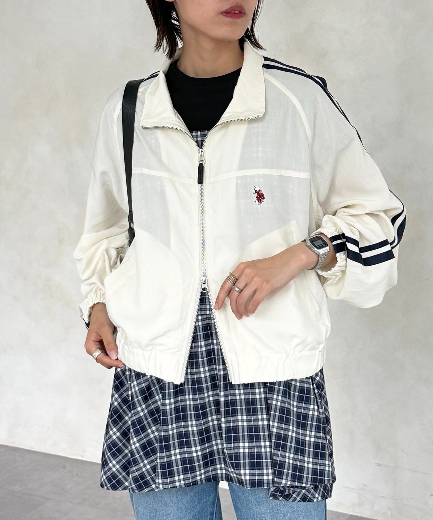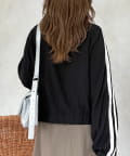 ・袖のラインテープと胸元のワンポイント刺繍が、コーディネートのアクセントに。