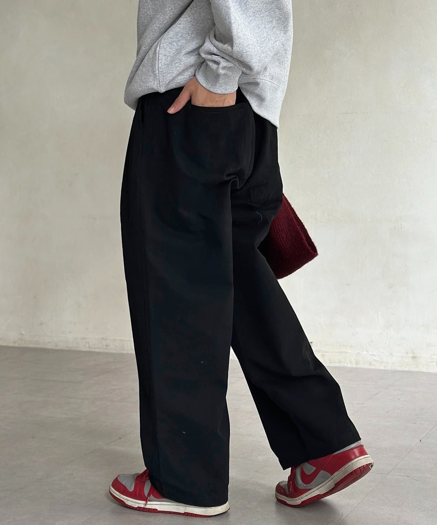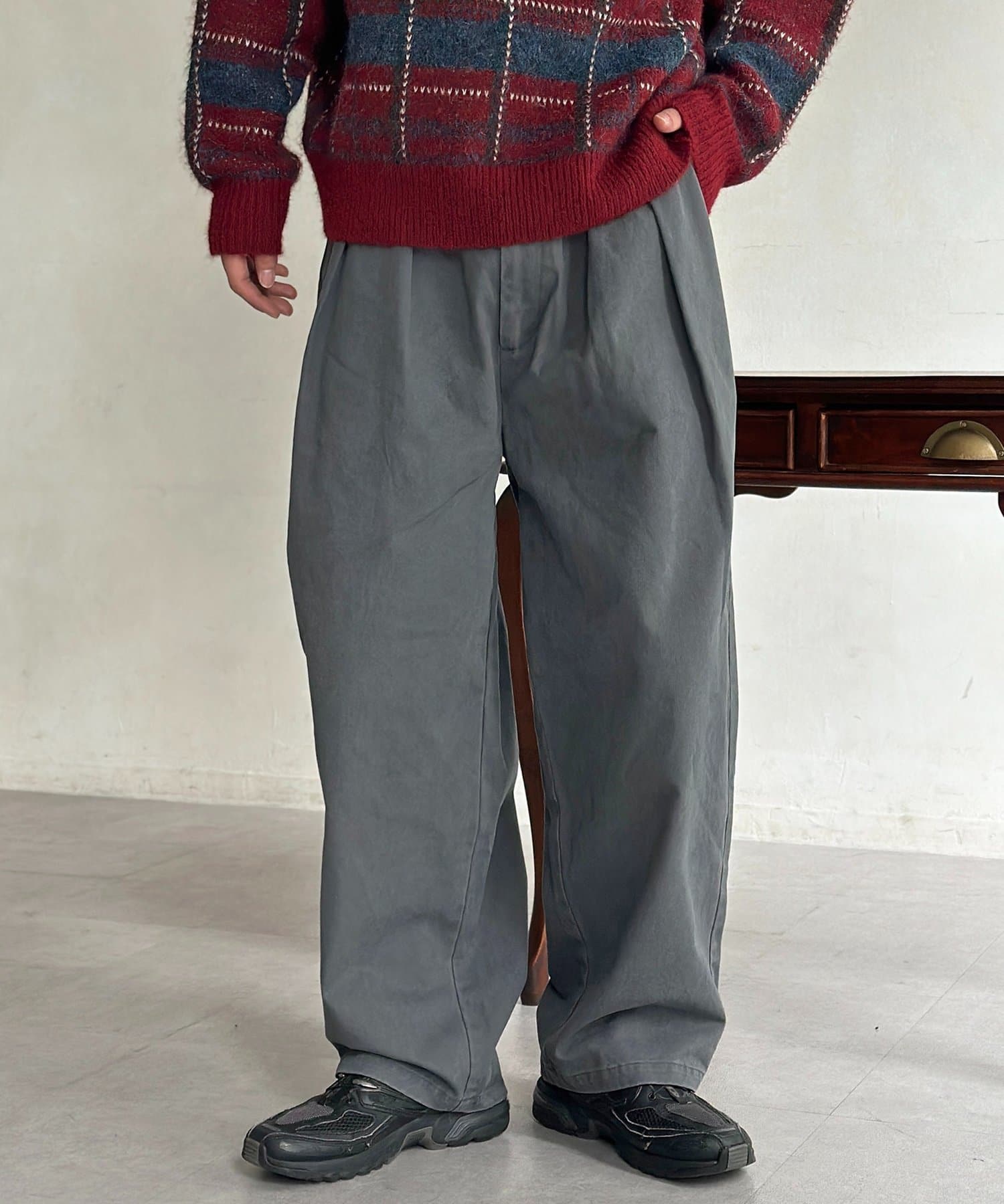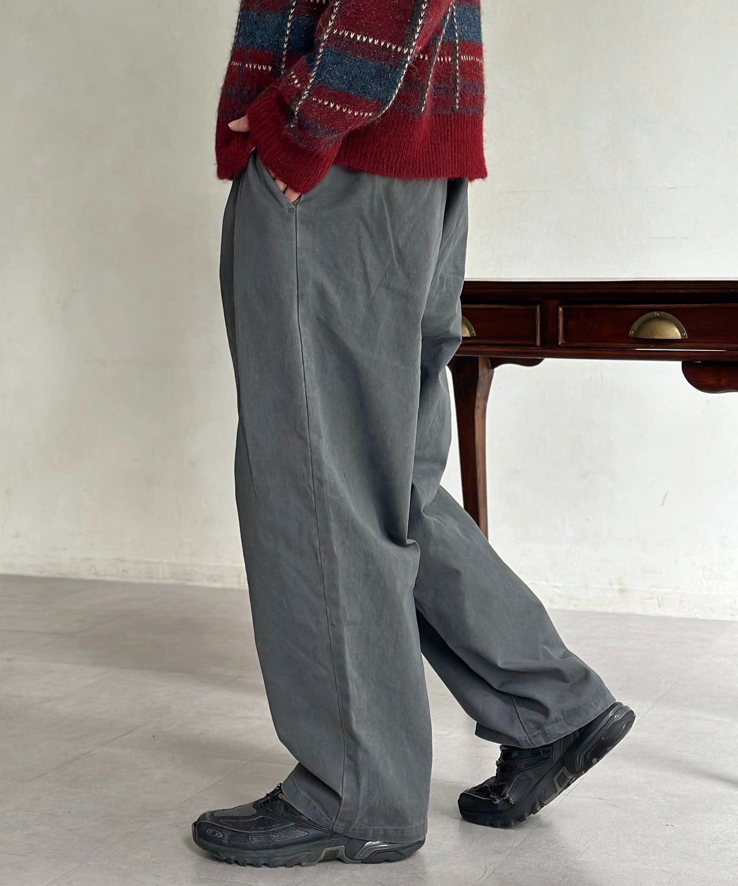 ヴィンテージライクなピグメント加工の、シルエット◎なタックワイドパンツ