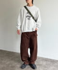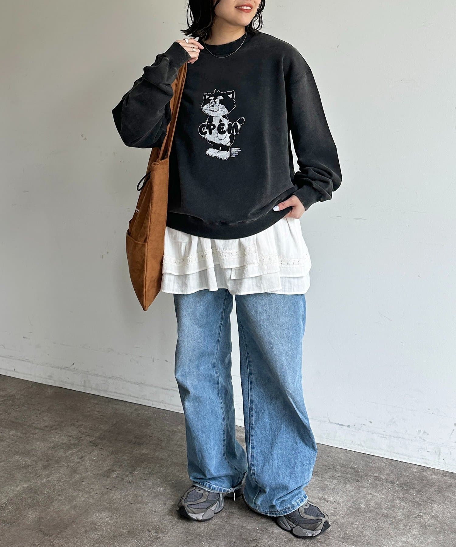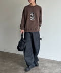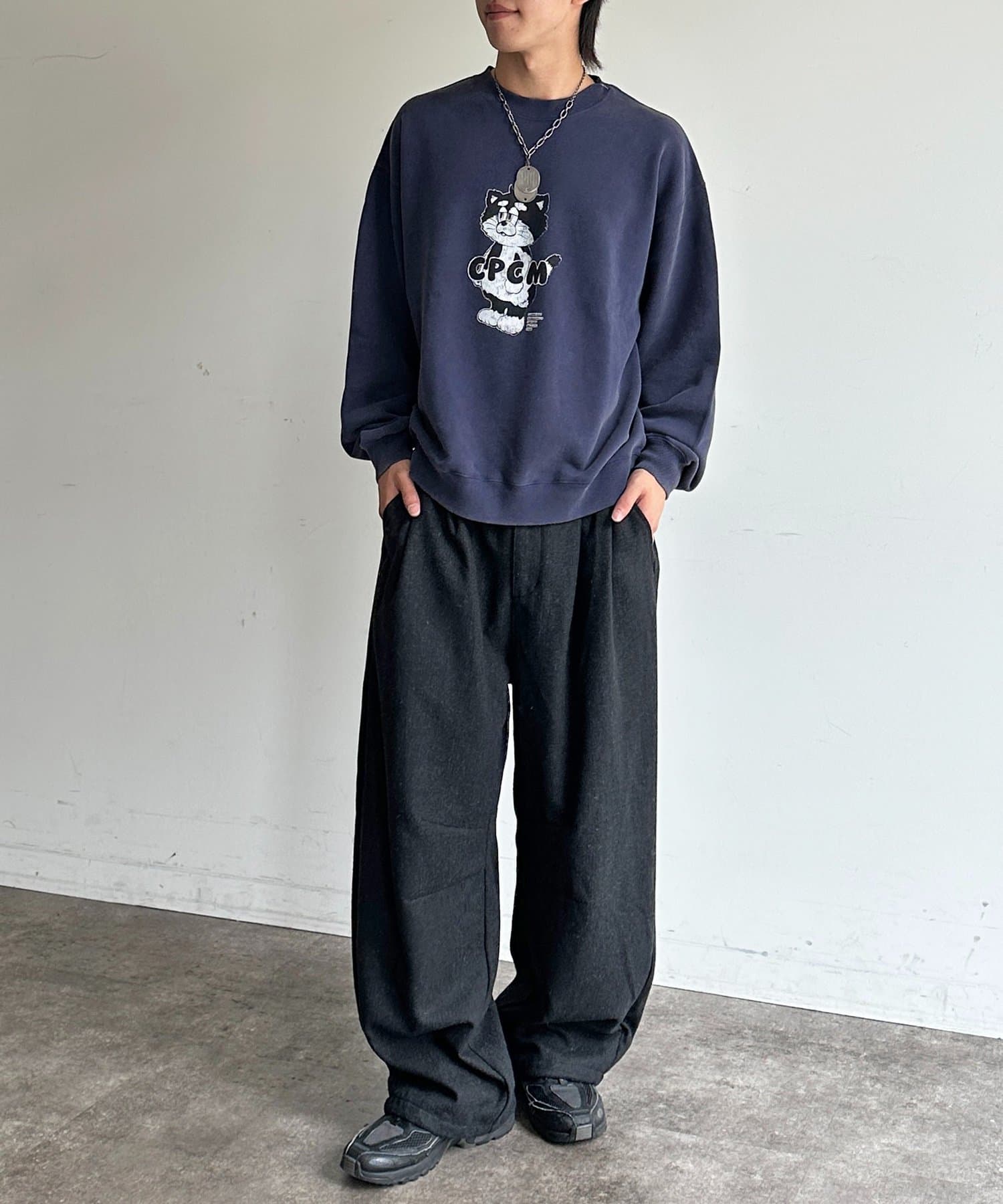 ・オーバーサイズのスウェットに、ゆったりとしたパンツを合わせて古着ライクなスタイル