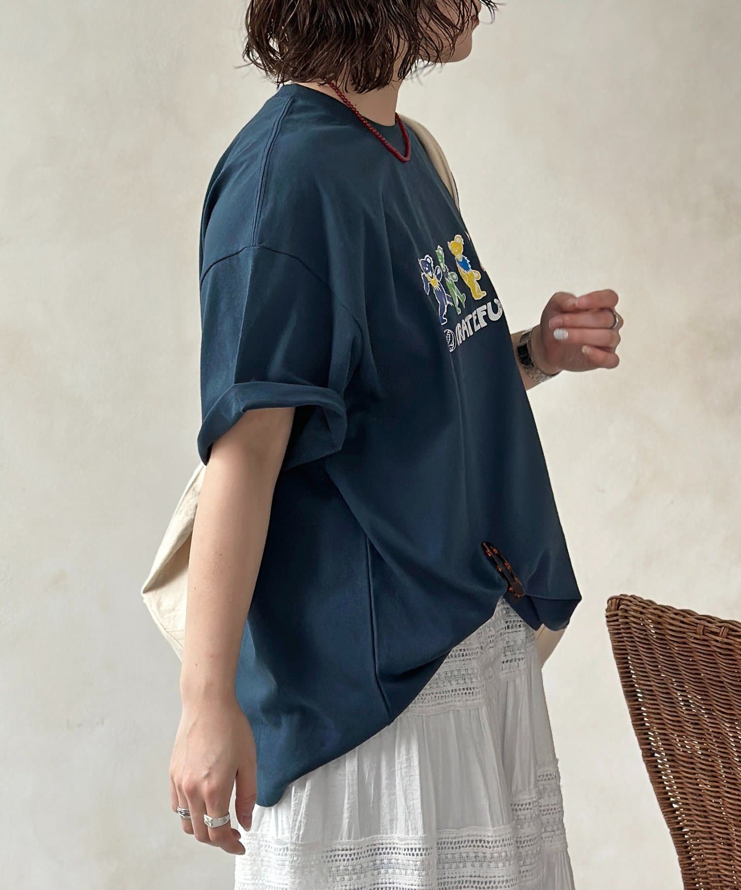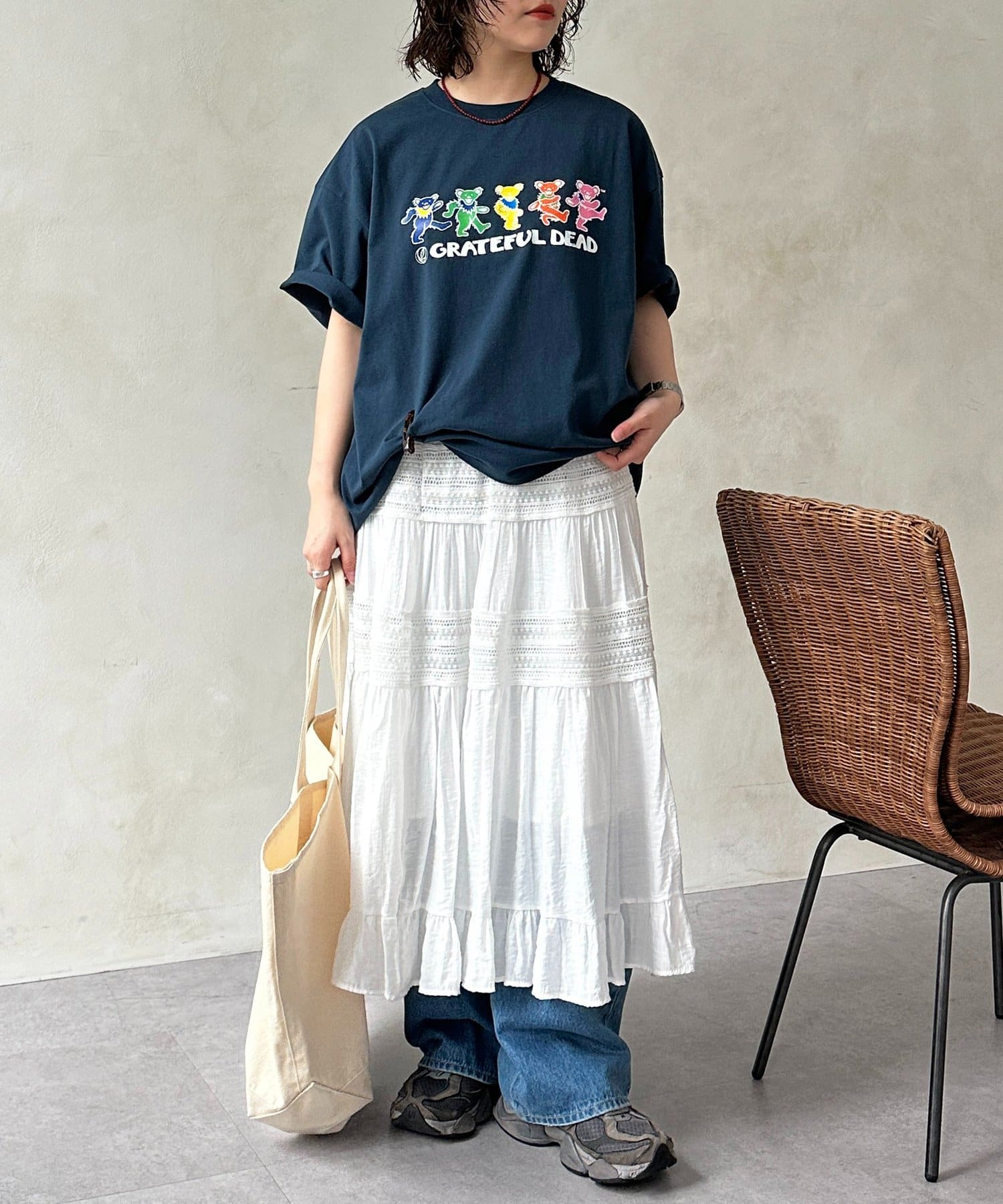 ・レーススカートやティアードスカートと合わせた、甘さのあるカジュアルMIXスタイル