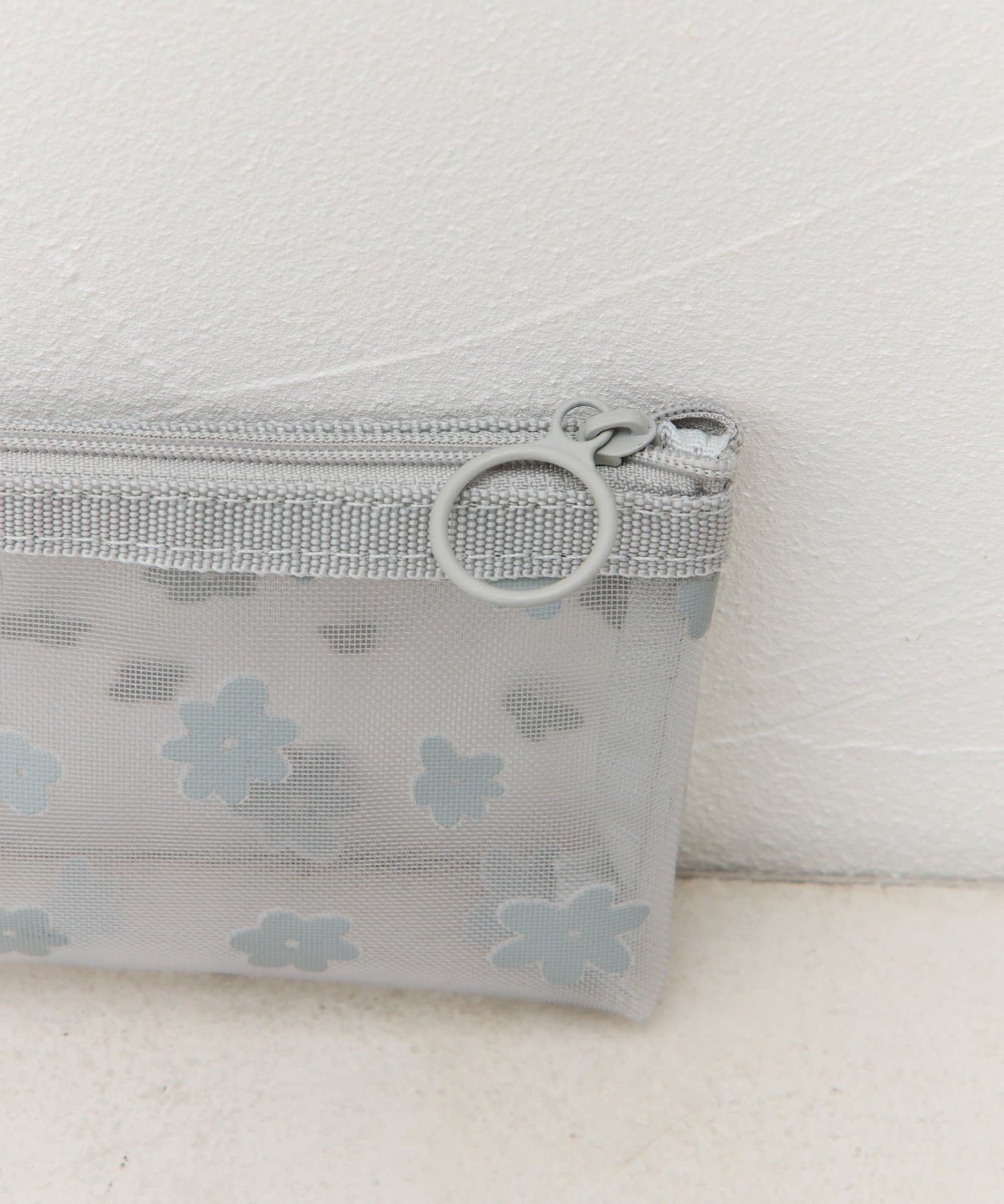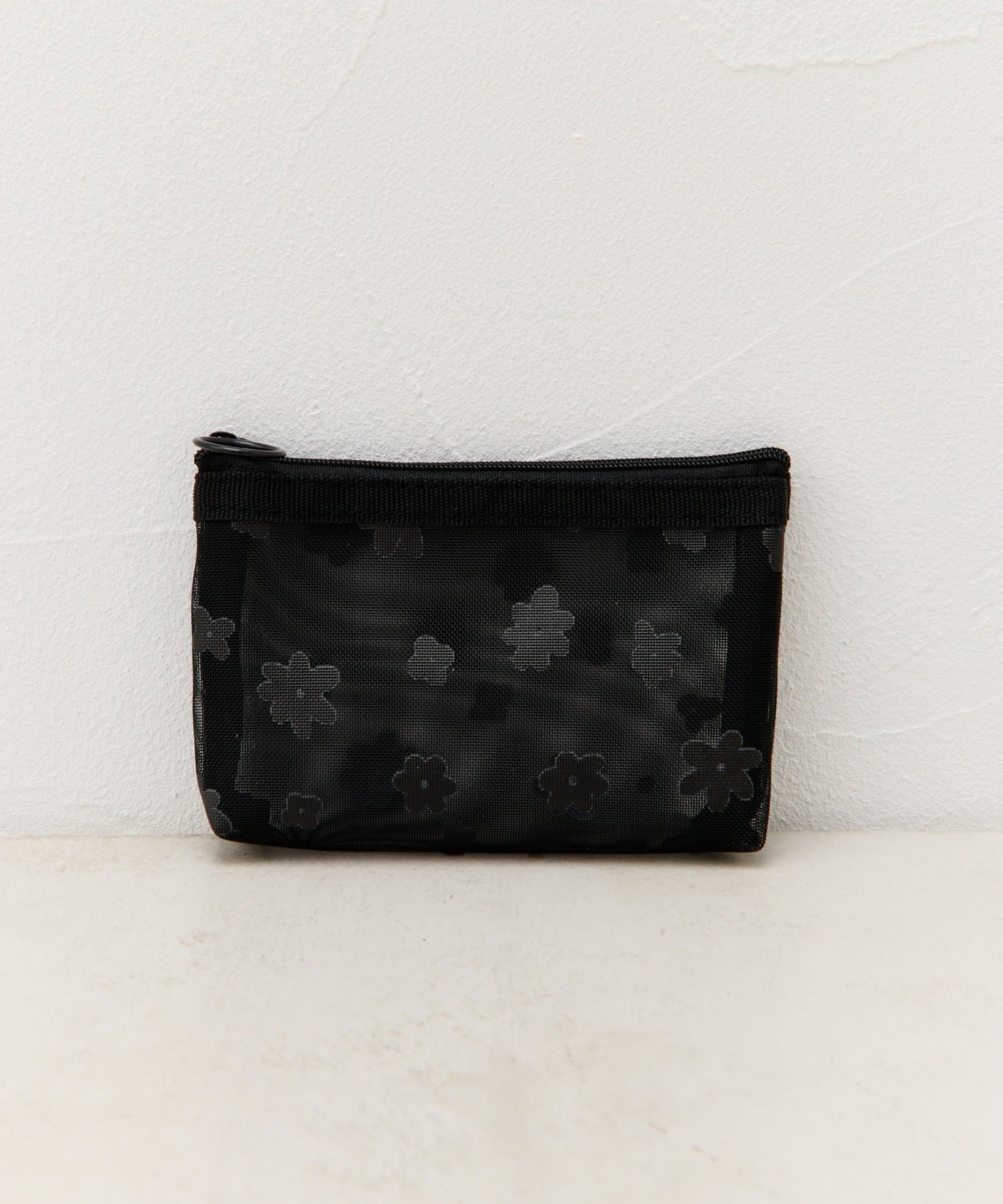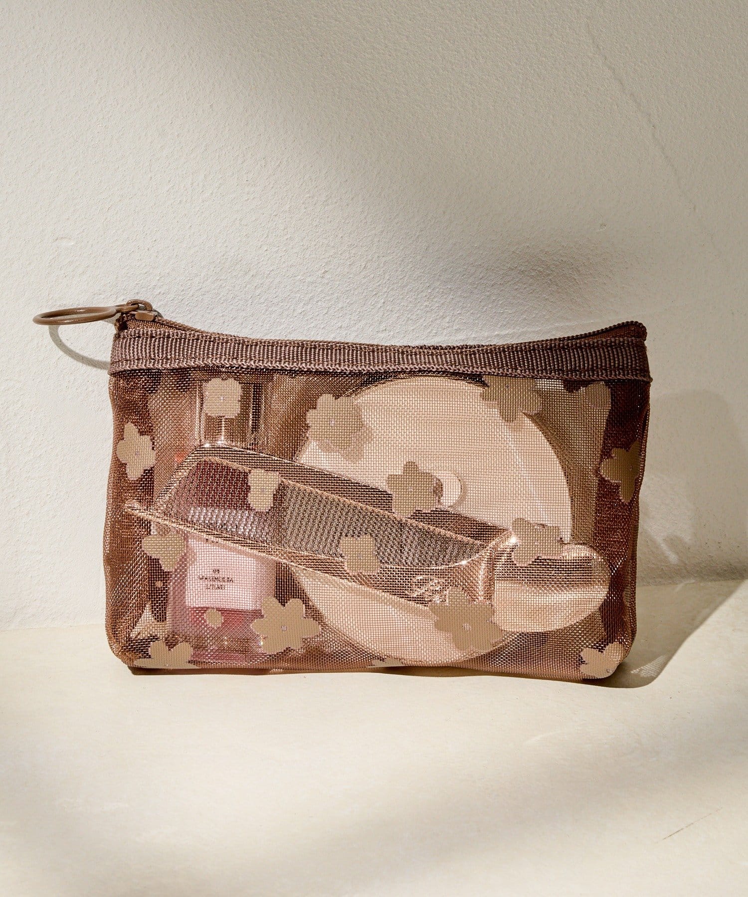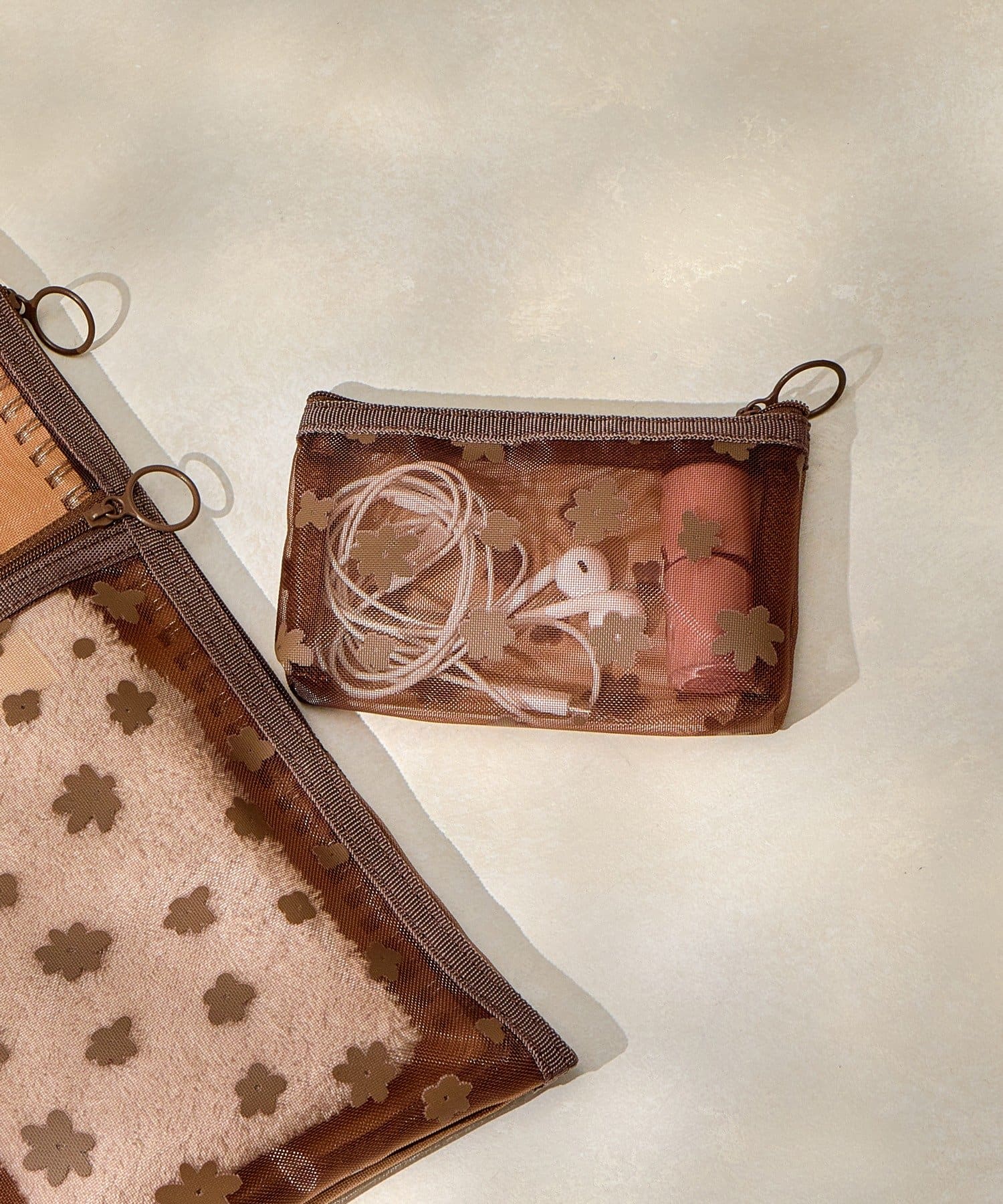 フラワーモチーフが散りばめられたメッシュポーチ。