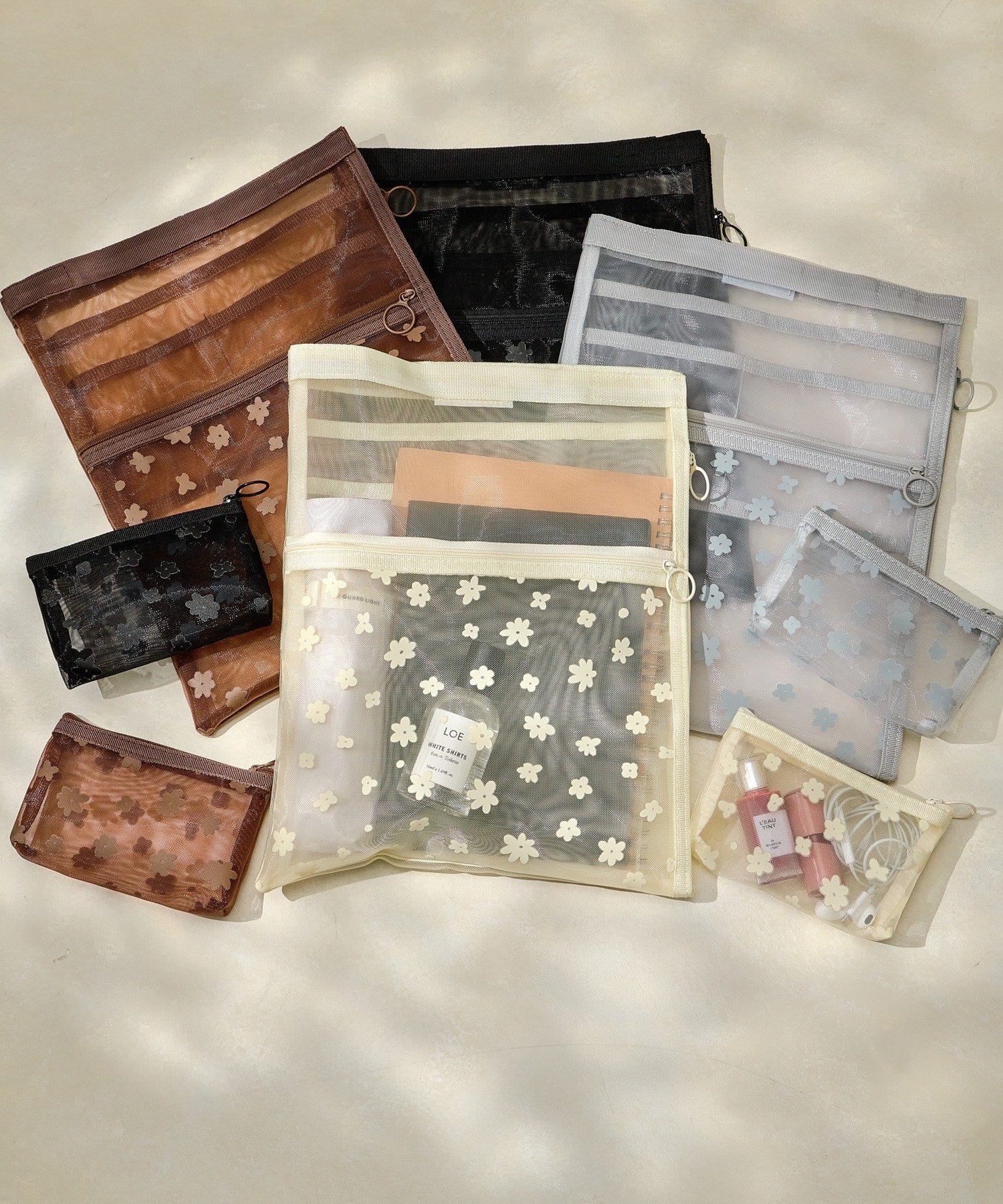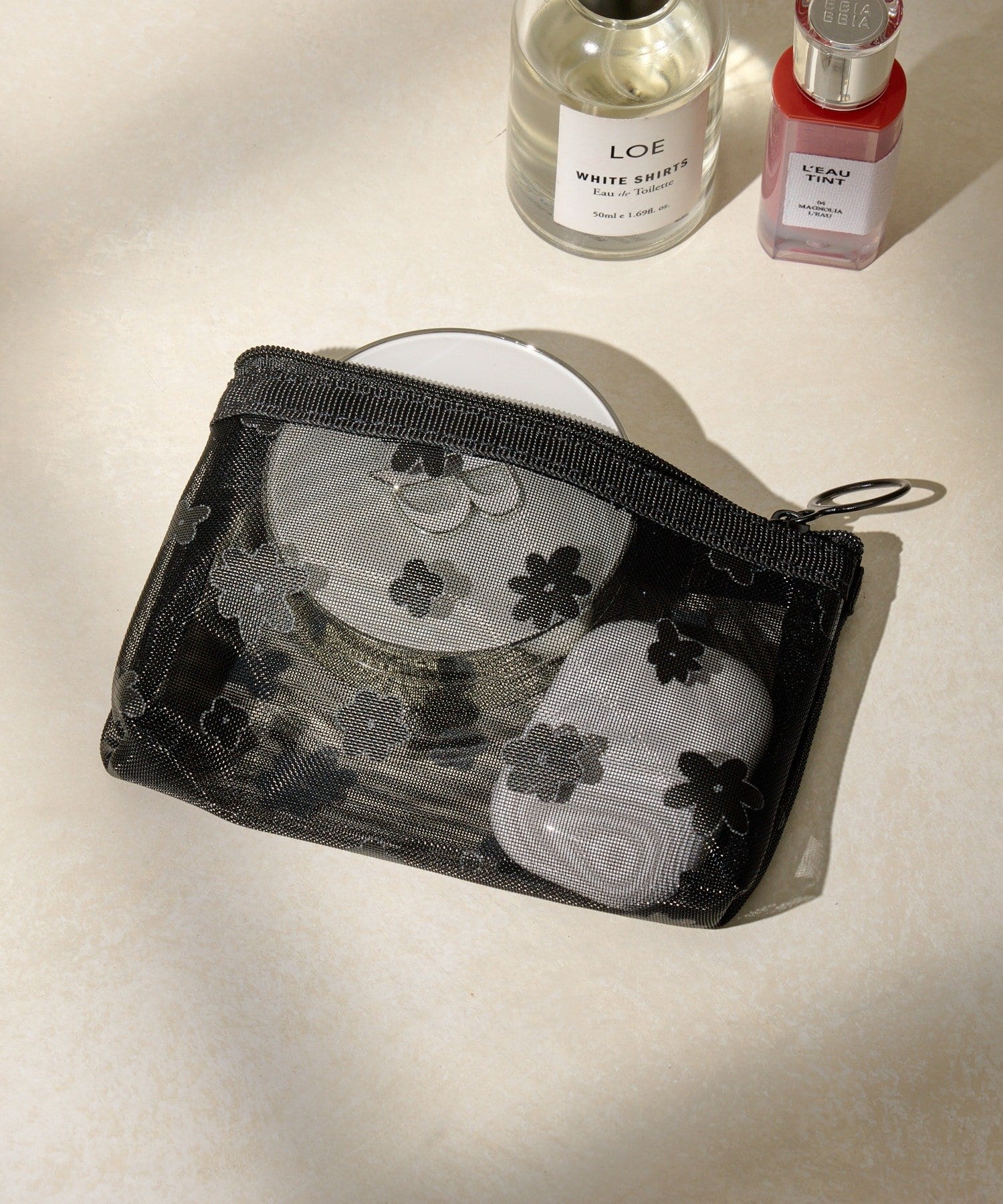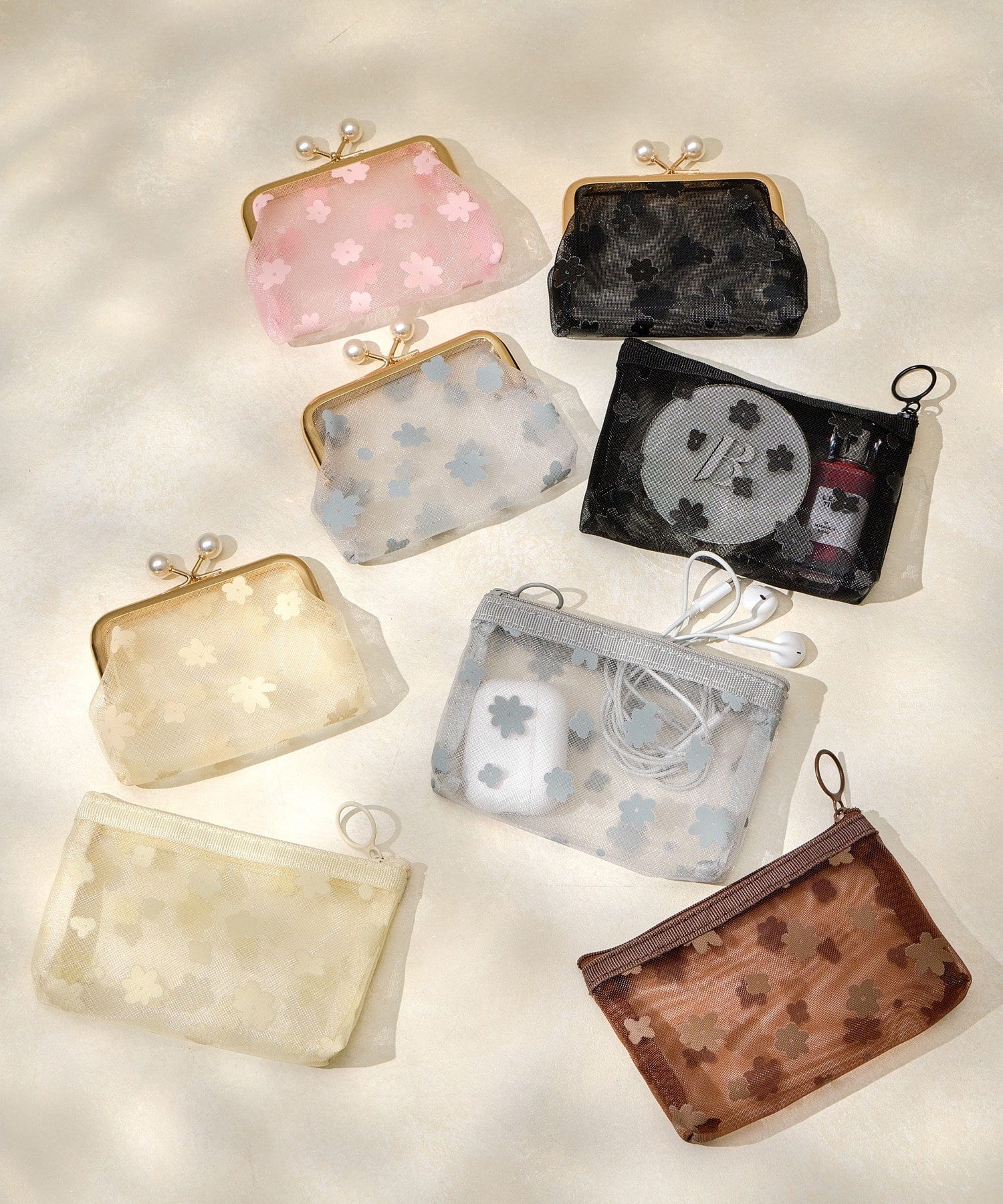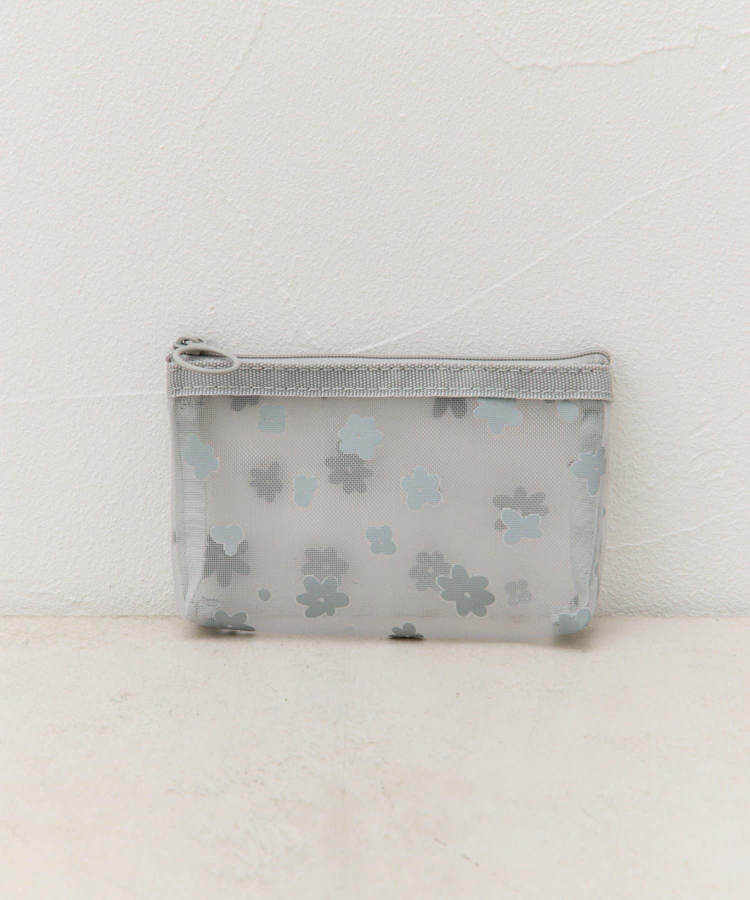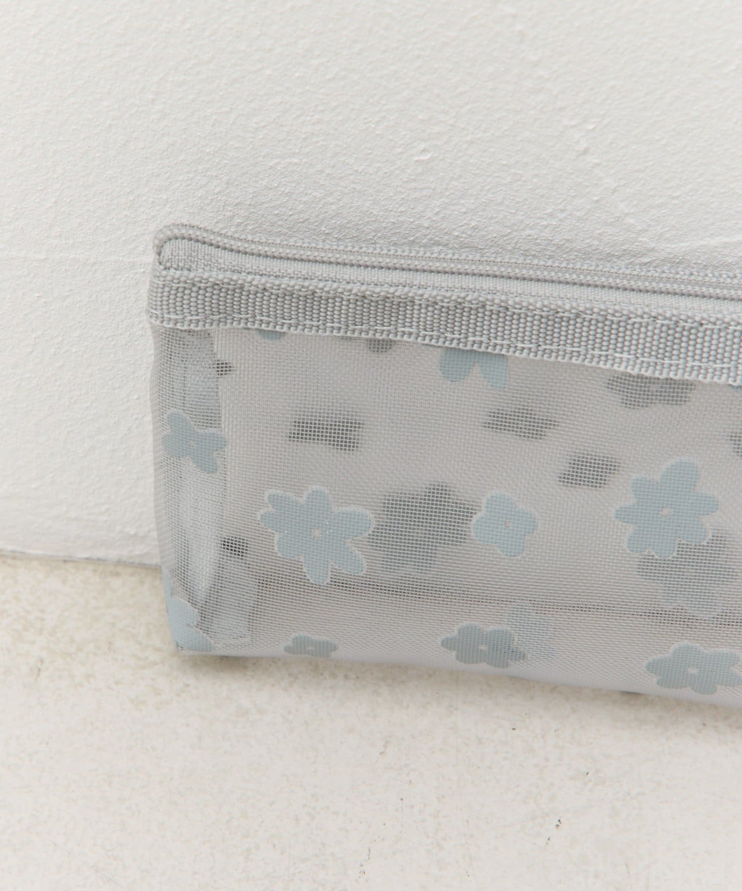 フラワーモチーフが散りばめられたメッシュポーチ。