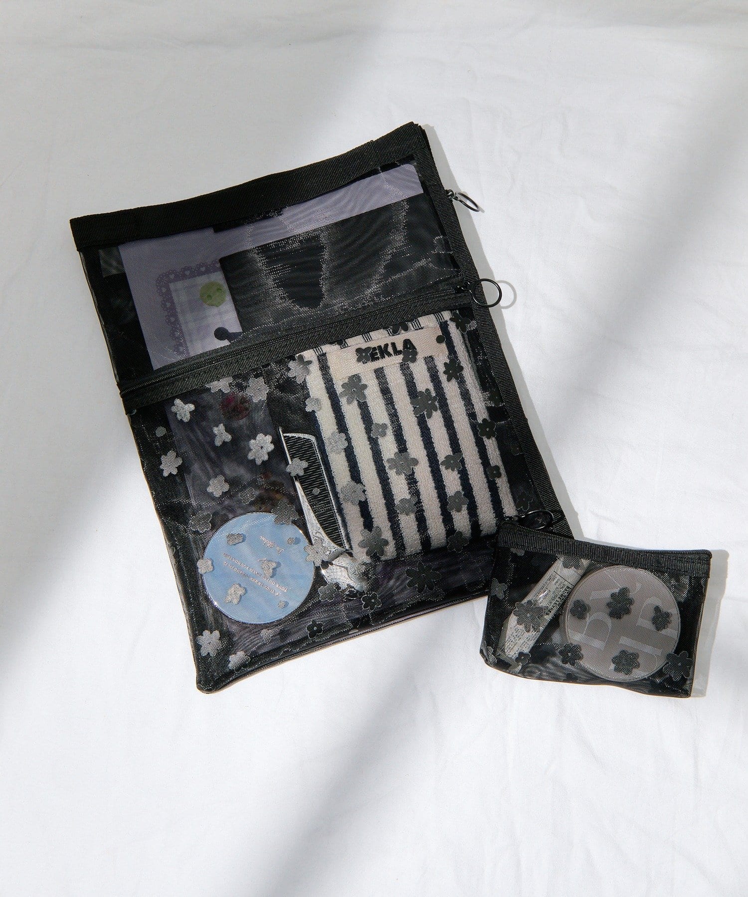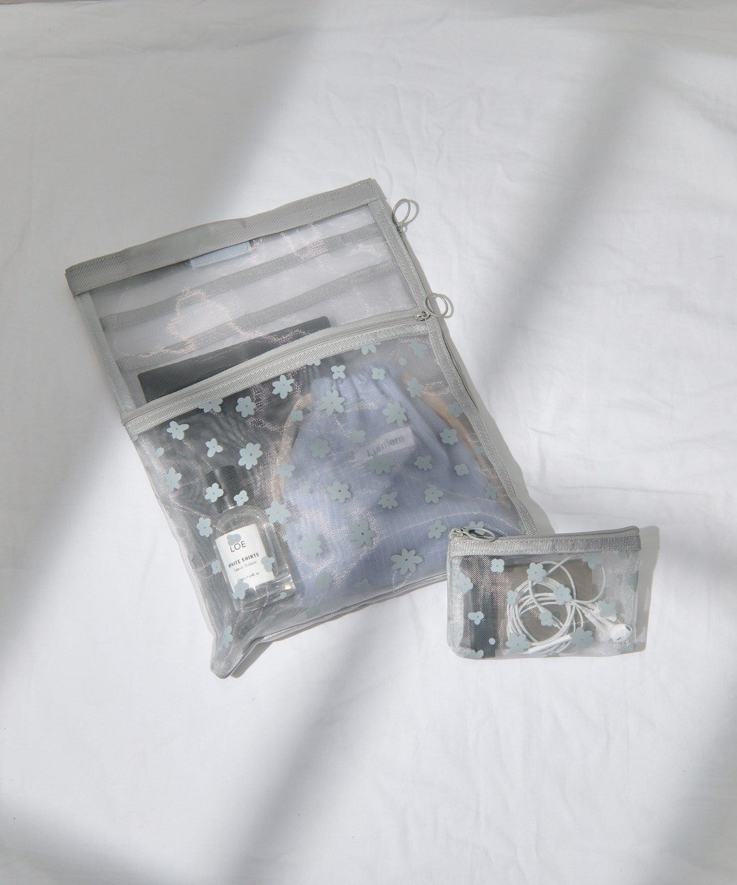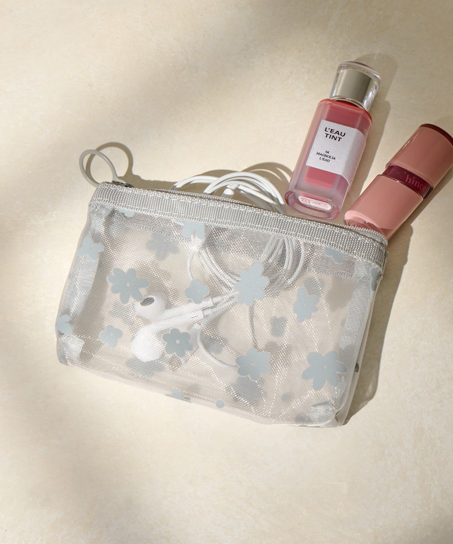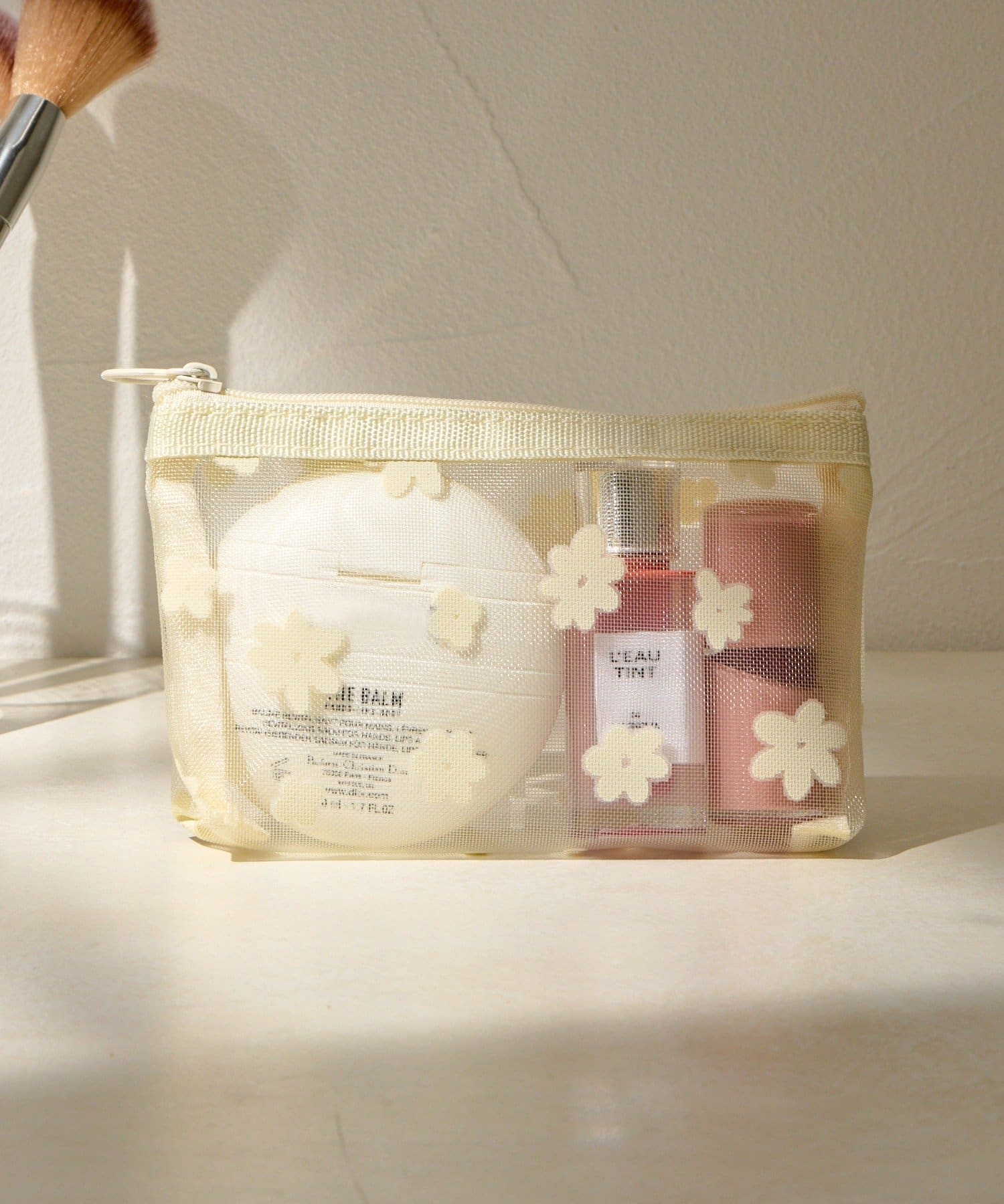 フラワーモチーフが散りばめられたメッシュポーチ。