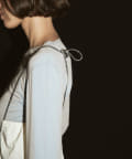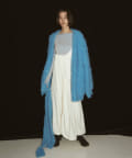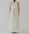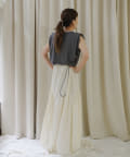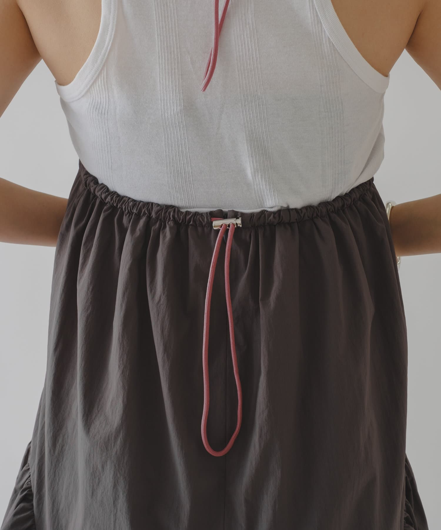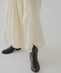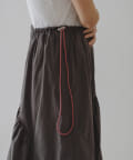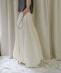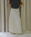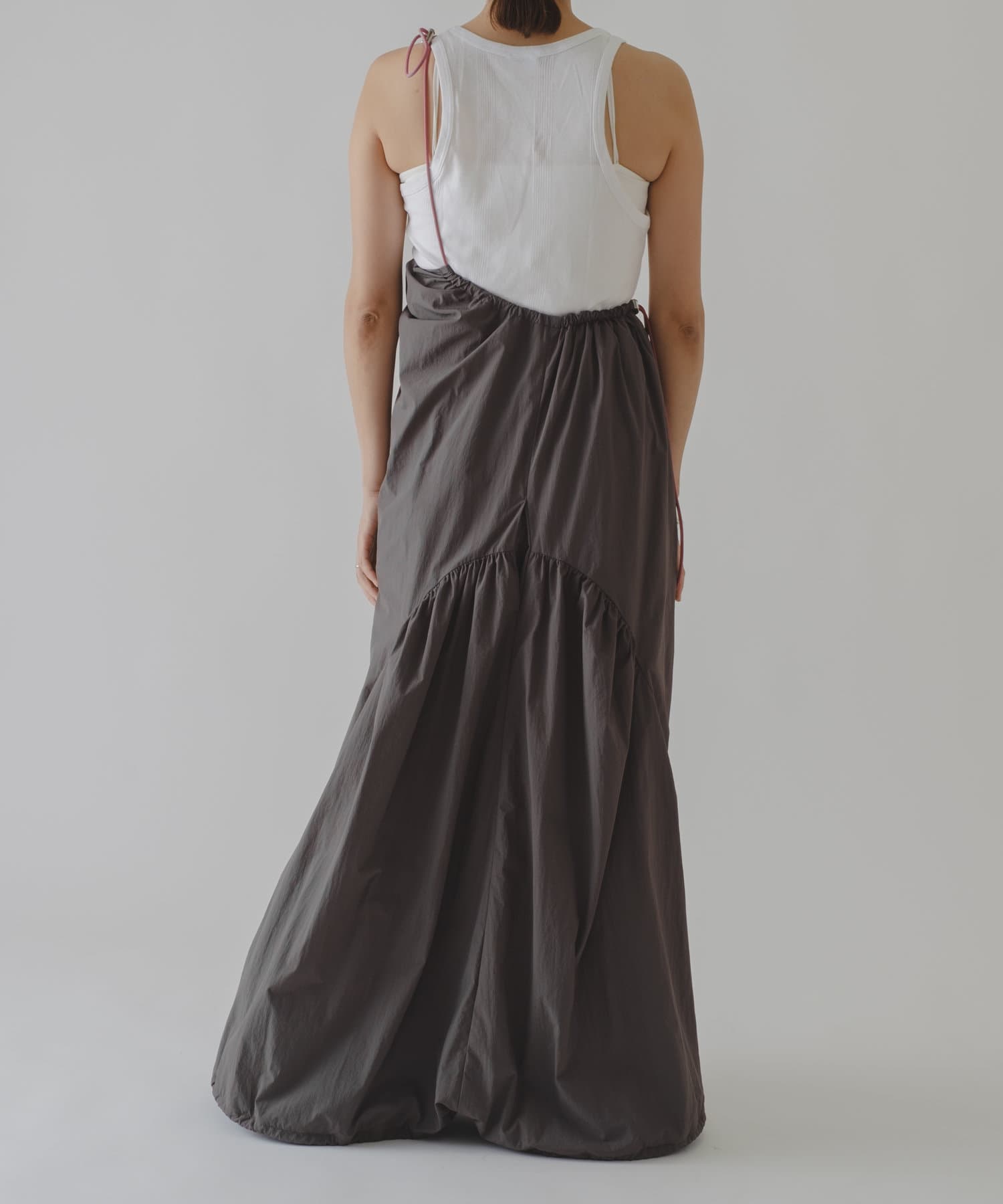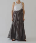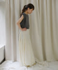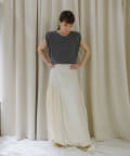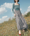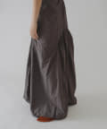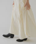 シルエットは、裾に向かってなめらかに広がるよう角度を付けたギャザーの切り替えを入れています。腰回りから膝上がすっきりとスタイルアップして見えるようなギャザー位置に設定しているため、メリハリのあるシルエットで着用いただけます。