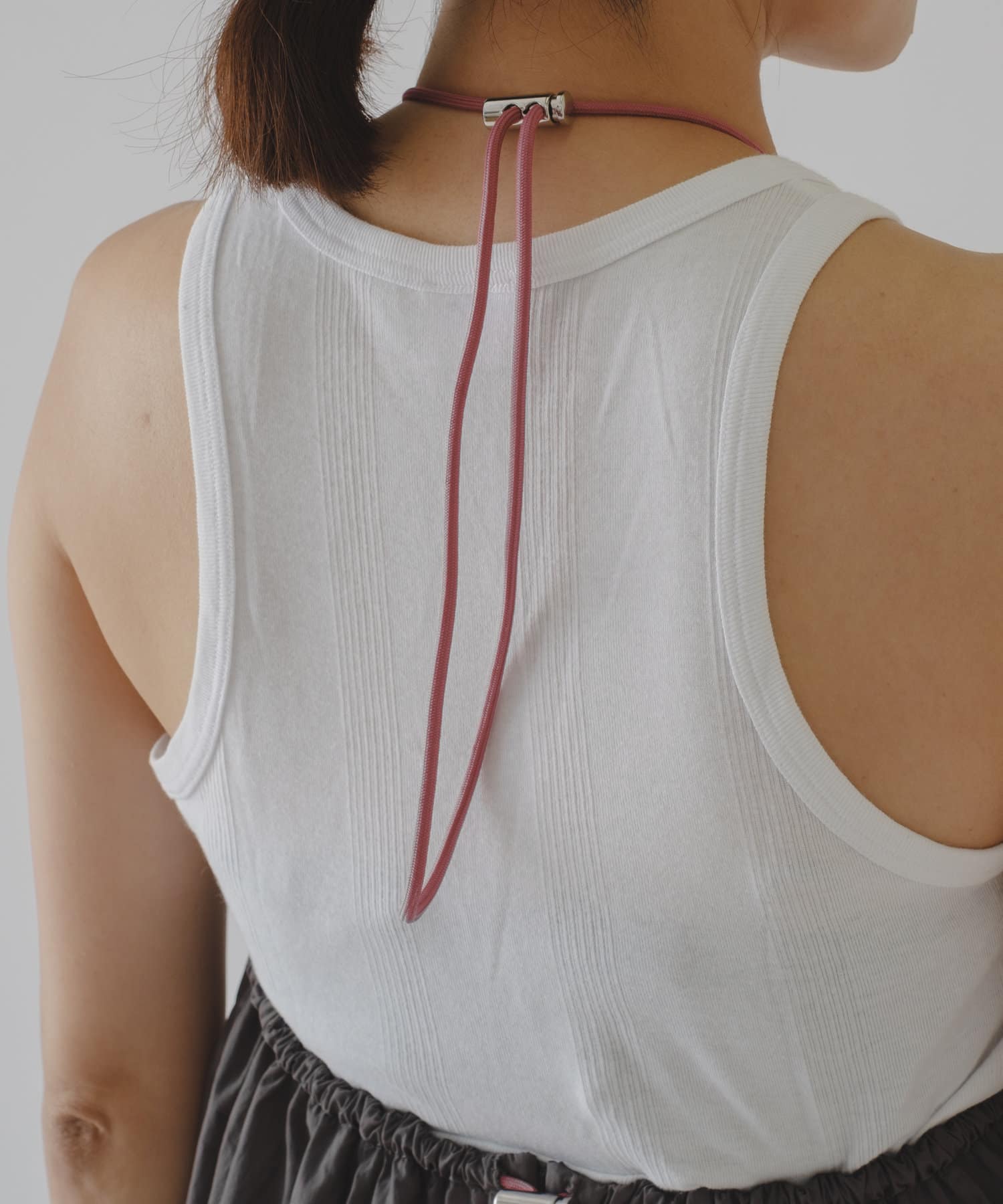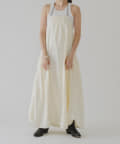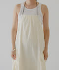 胸当てを前にした状態でワンピースを履くように体を通し、胸当てについたコード紐の輪の中に内側から頭を入れます。首後ろのストッパーで長さを調整し、心地よいサイズに設定します。ウエストのサイズも紐で自由に設定してご着用ください。