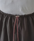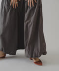 スノーパンツの仕様に習って裾にゴムスピンドルを付けており、絞るとギャザー分量が調整可能。裾周りをバルーンシルエットに変更できます。