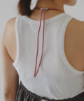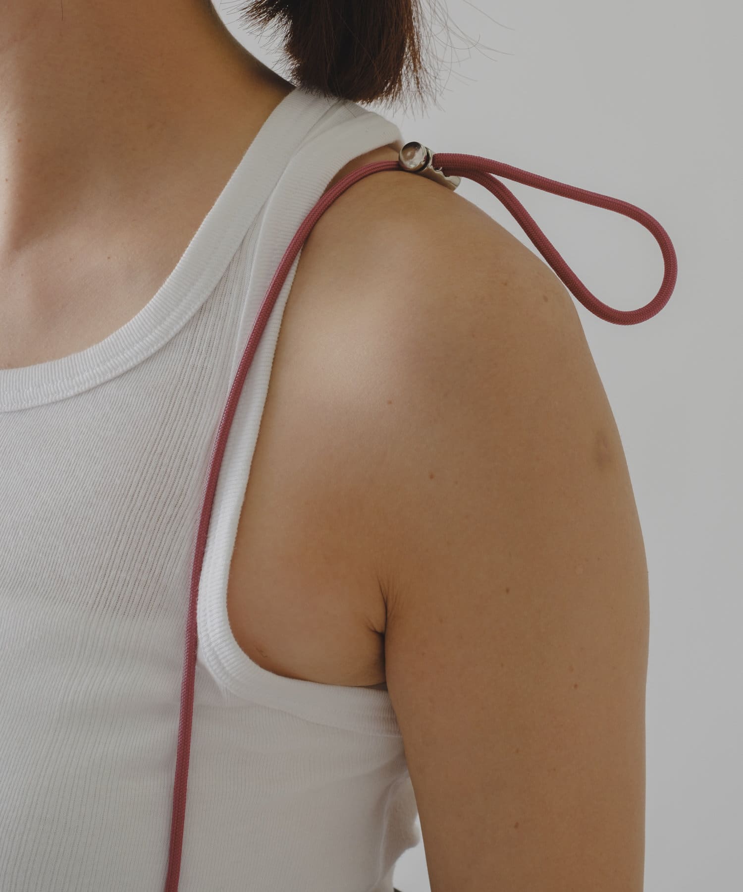 ポケットが前中心に来るようにワンピースを履き、胸当ての紐を片方の肩に引っかけます。(アンダーバストの下位置にウエストの高さを設定するがおすすめです。)もう片方の紐は腕を通さず着るとワンショルダーのベアスカートに、両肩にキャミソール型として使用も可能です。