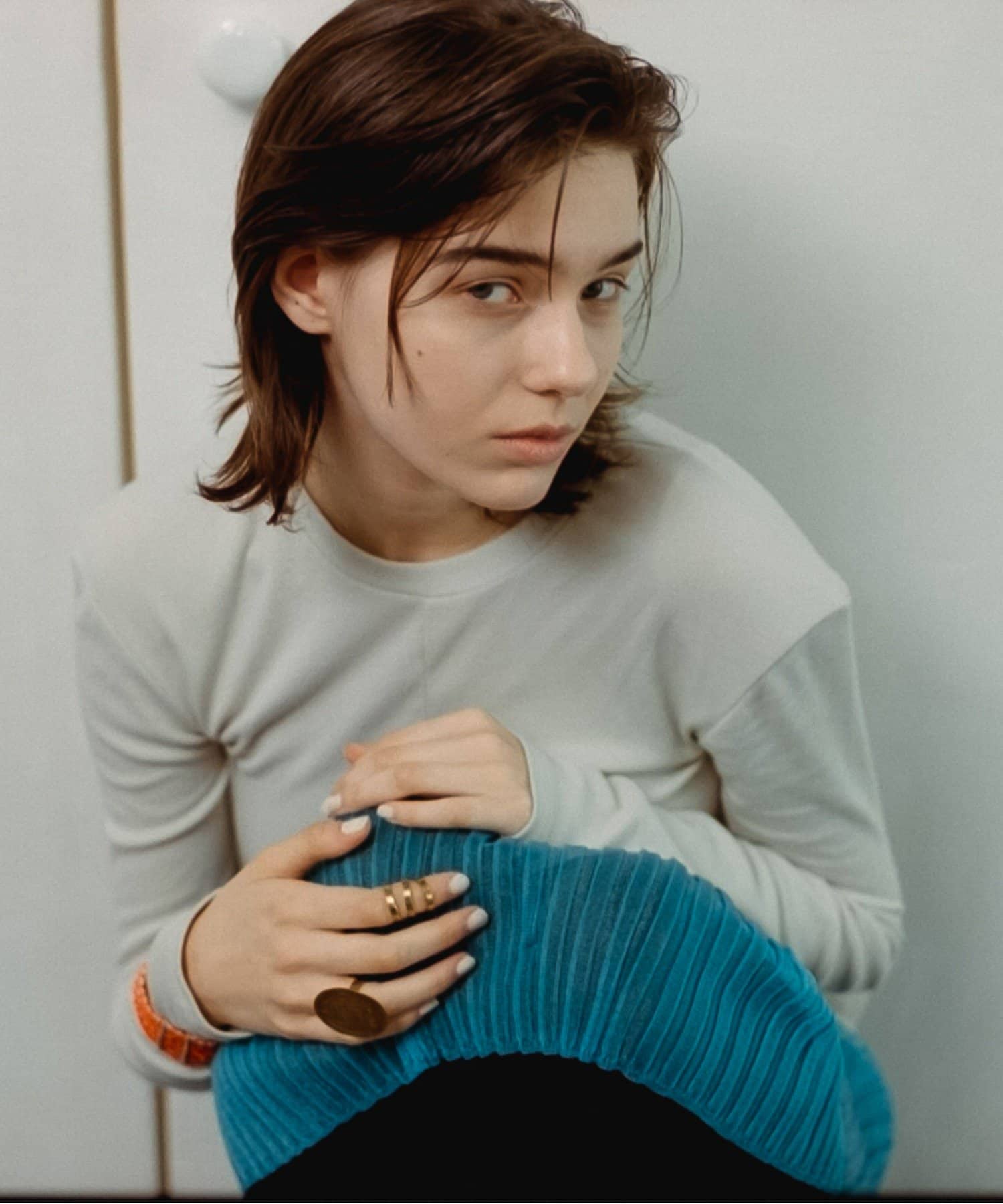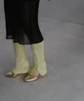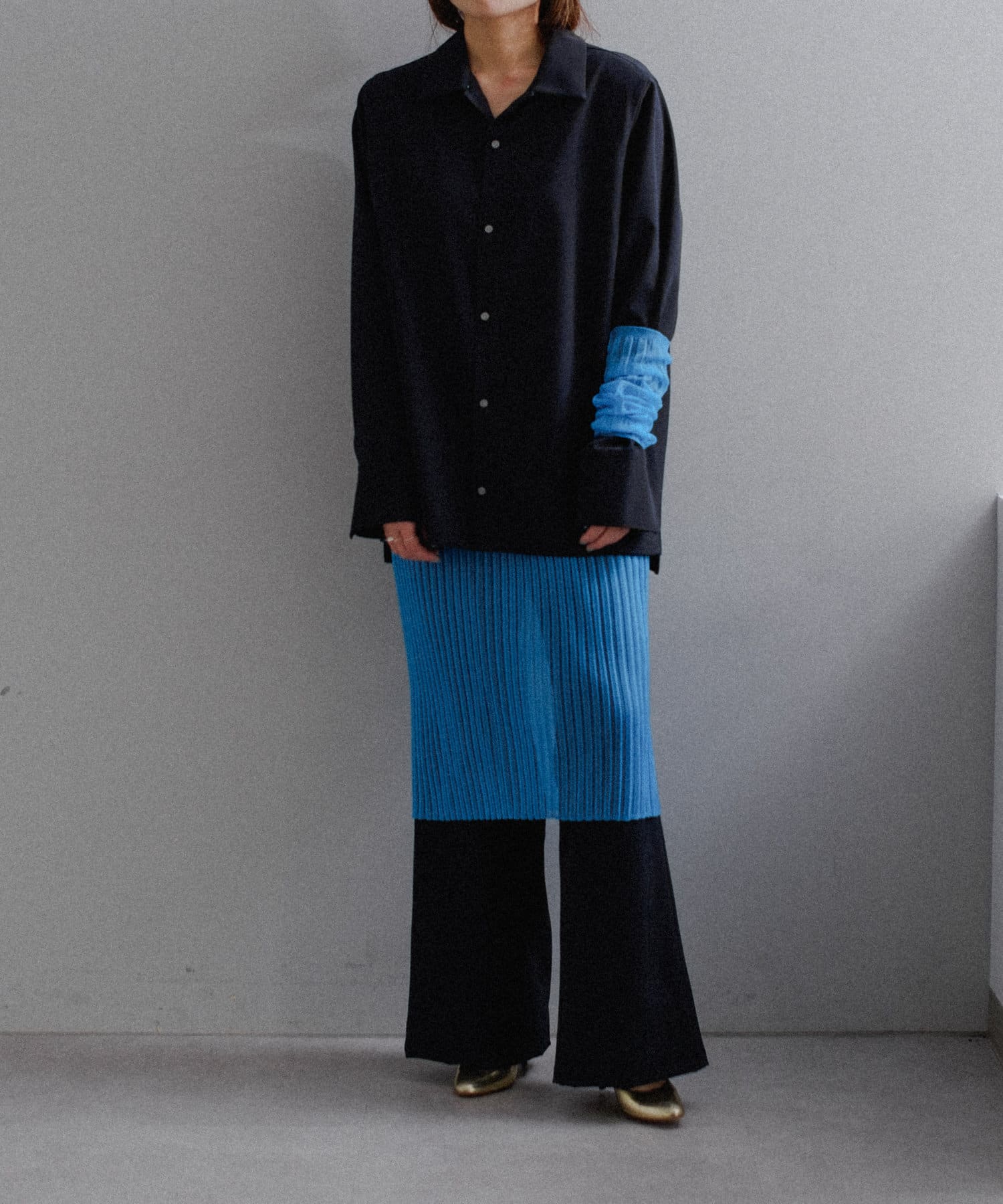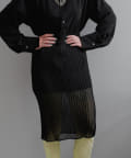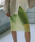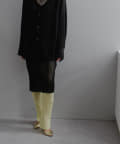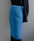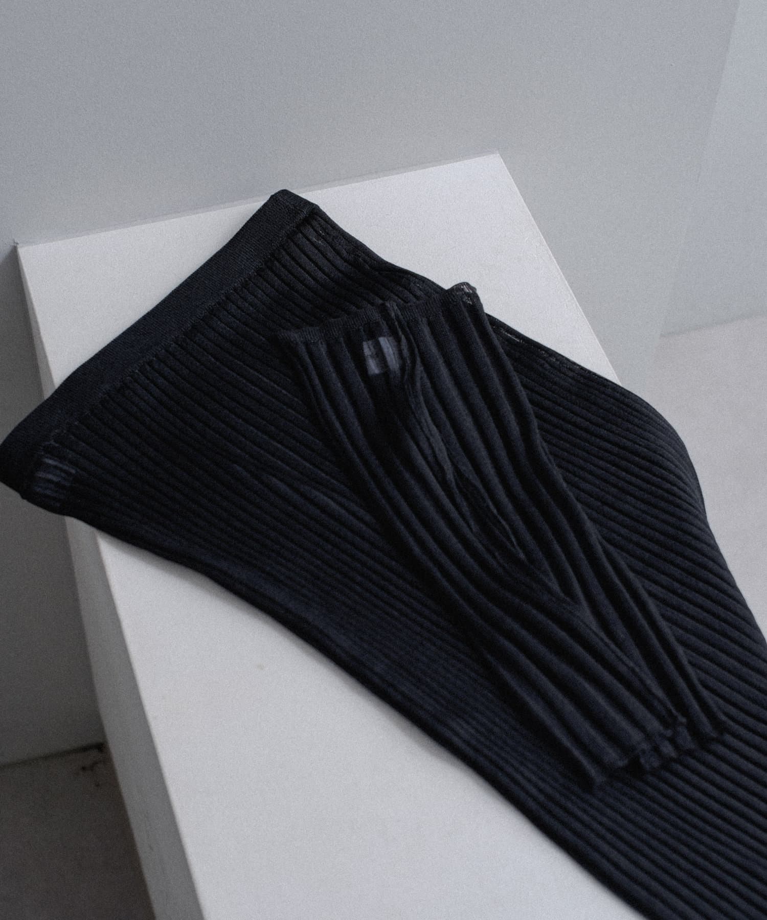まるでオーガンジーのように透けるニット。極細番手のナイロン×ポリエステルの特殊な糸をリブ編みにすることで透け感の凹凸ができ、その表面感を活かしてミドルスカートとグローブを作成しました。