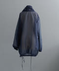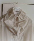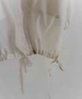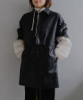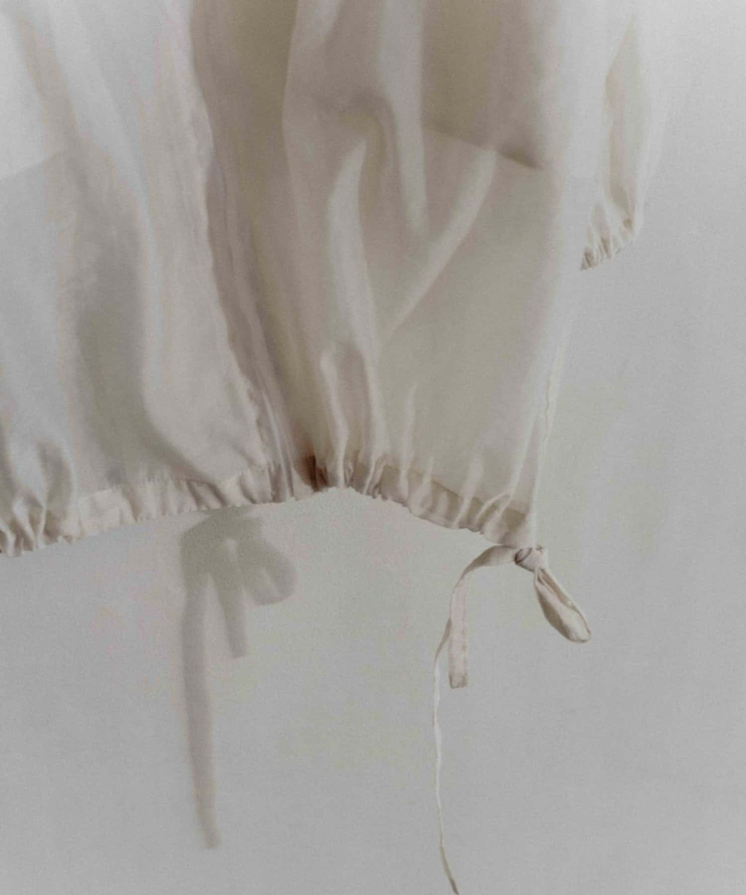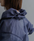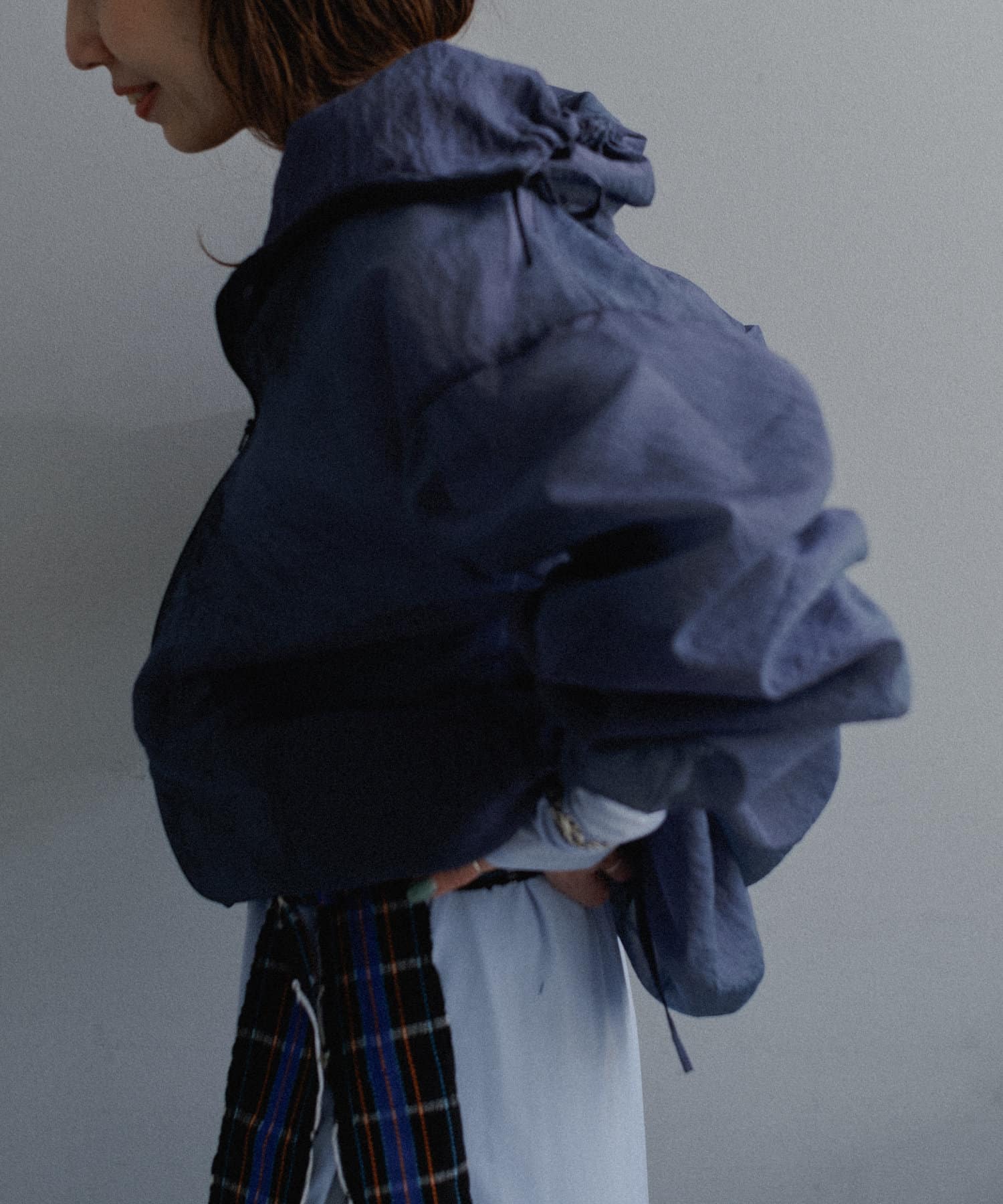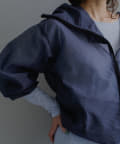ファスナーを首元までしっかりと閉める際は、襟ぐりに通した紐で襟口を絞ってギャザーを寄せると顔周りにボリューム感がでて、一層可愛く着ていただけます。胸元まで開けると大きな開襟シャツのように様変わり。袖口にはゴムが入っており、夏場は肘まで持ち上げて涼しく着用いただけます。