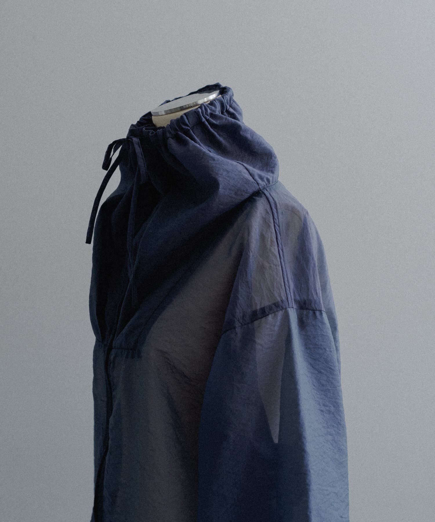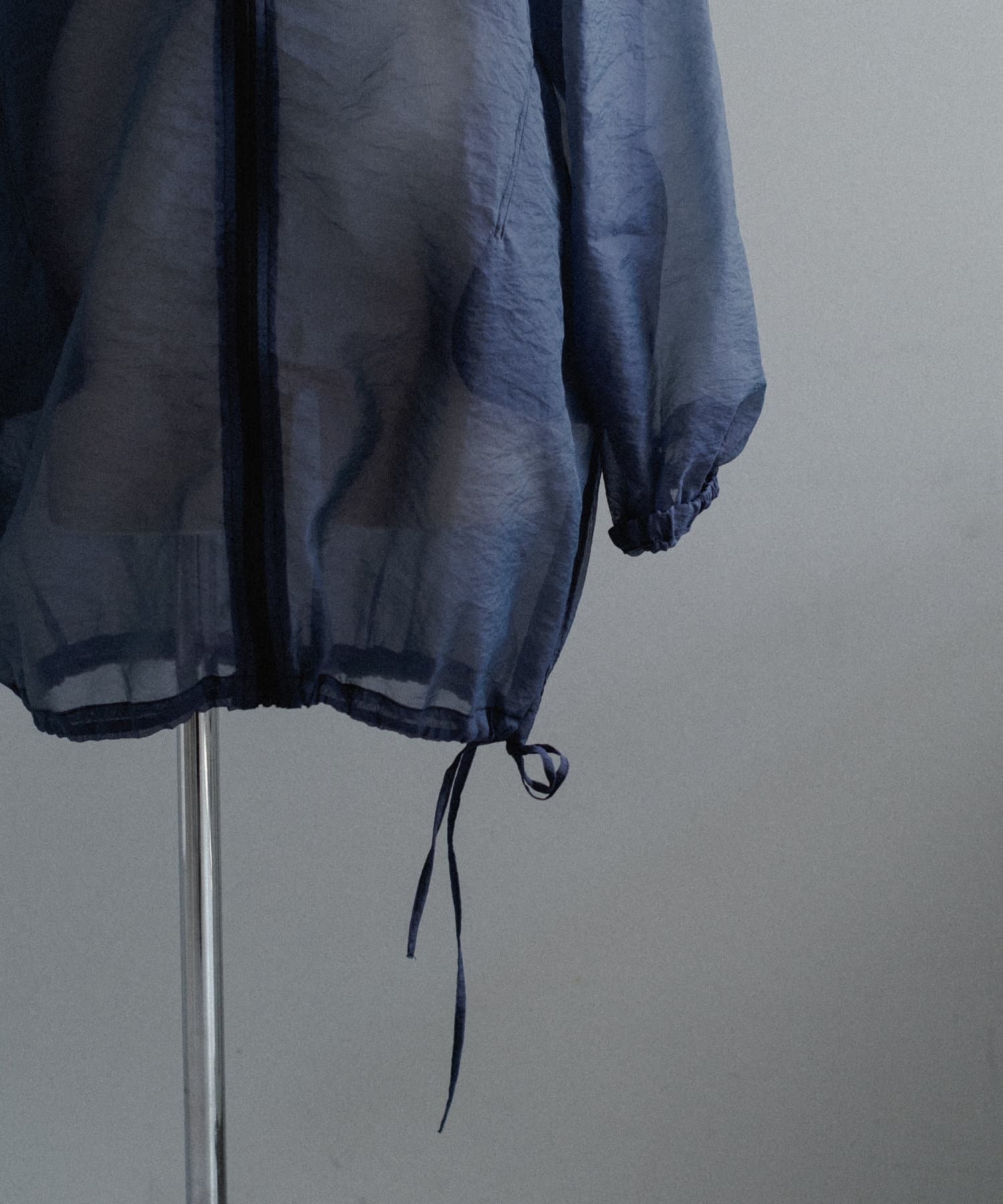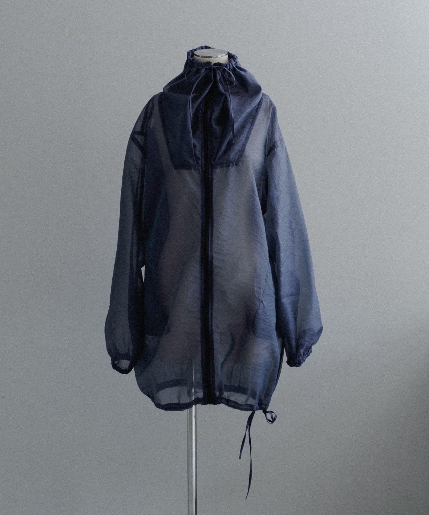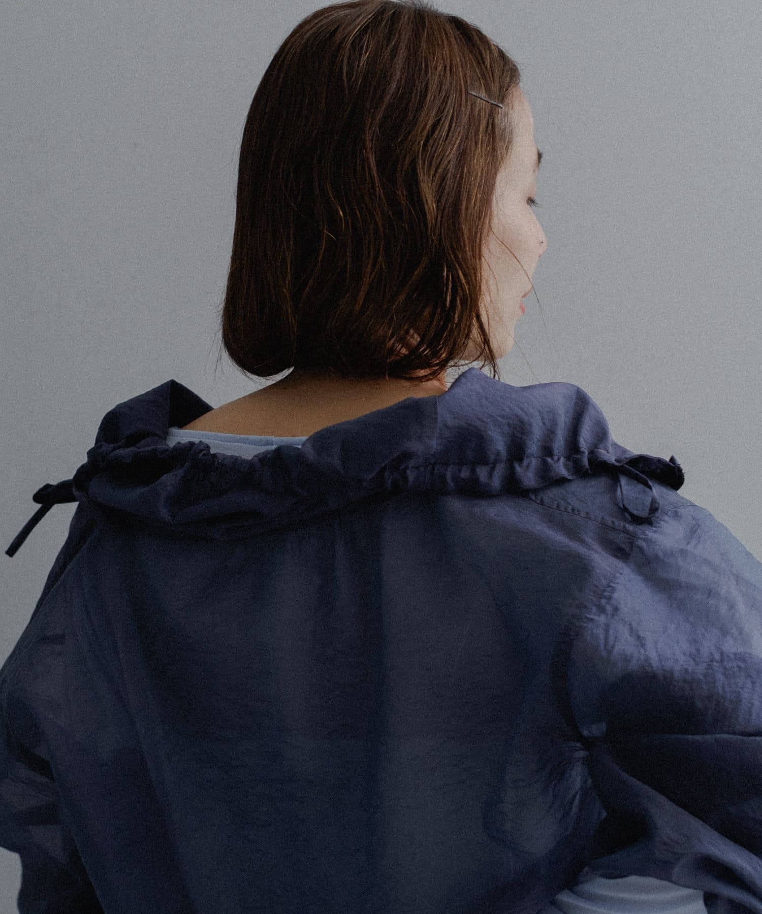 透け感とハリ感が気分を上げる、日本のオーガンジー生地を使用して作成したハイネックパーカー。春はマニッシュなジャケットの中にレイヤードしたり、夏はスリーブレスのアイテムに羽織れる、軽くて涼しげなサマーシャツパーカーとしても活躍します。