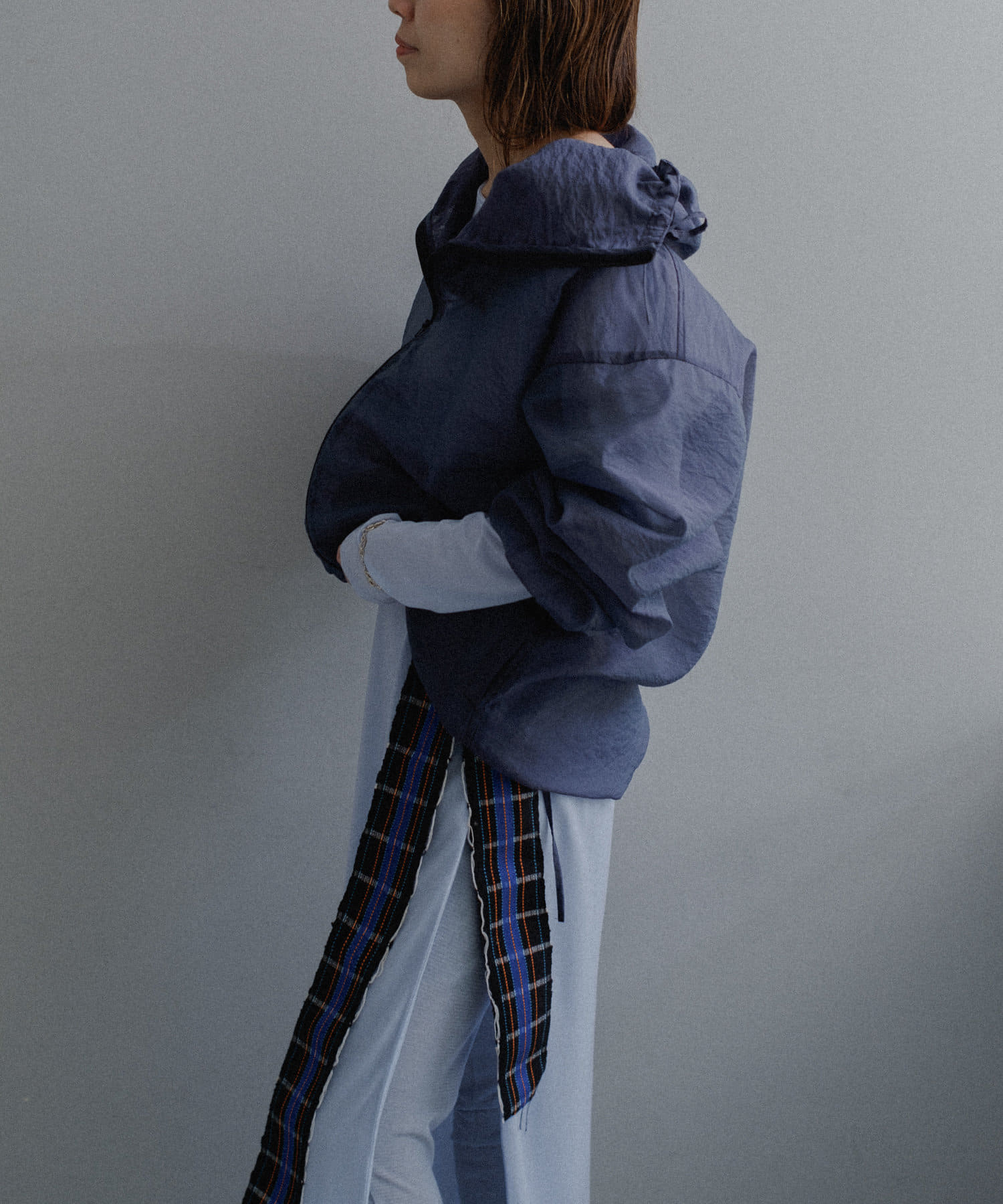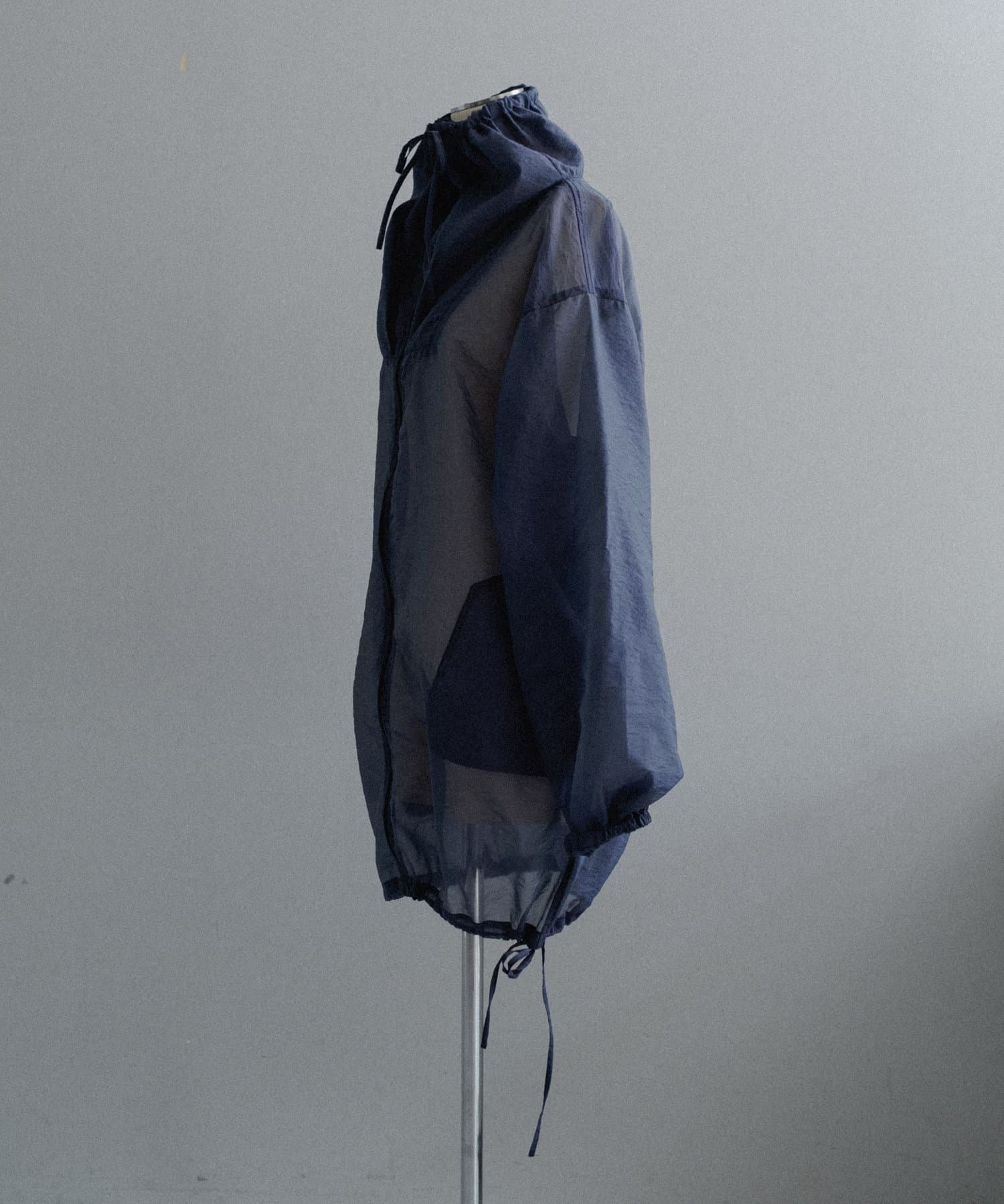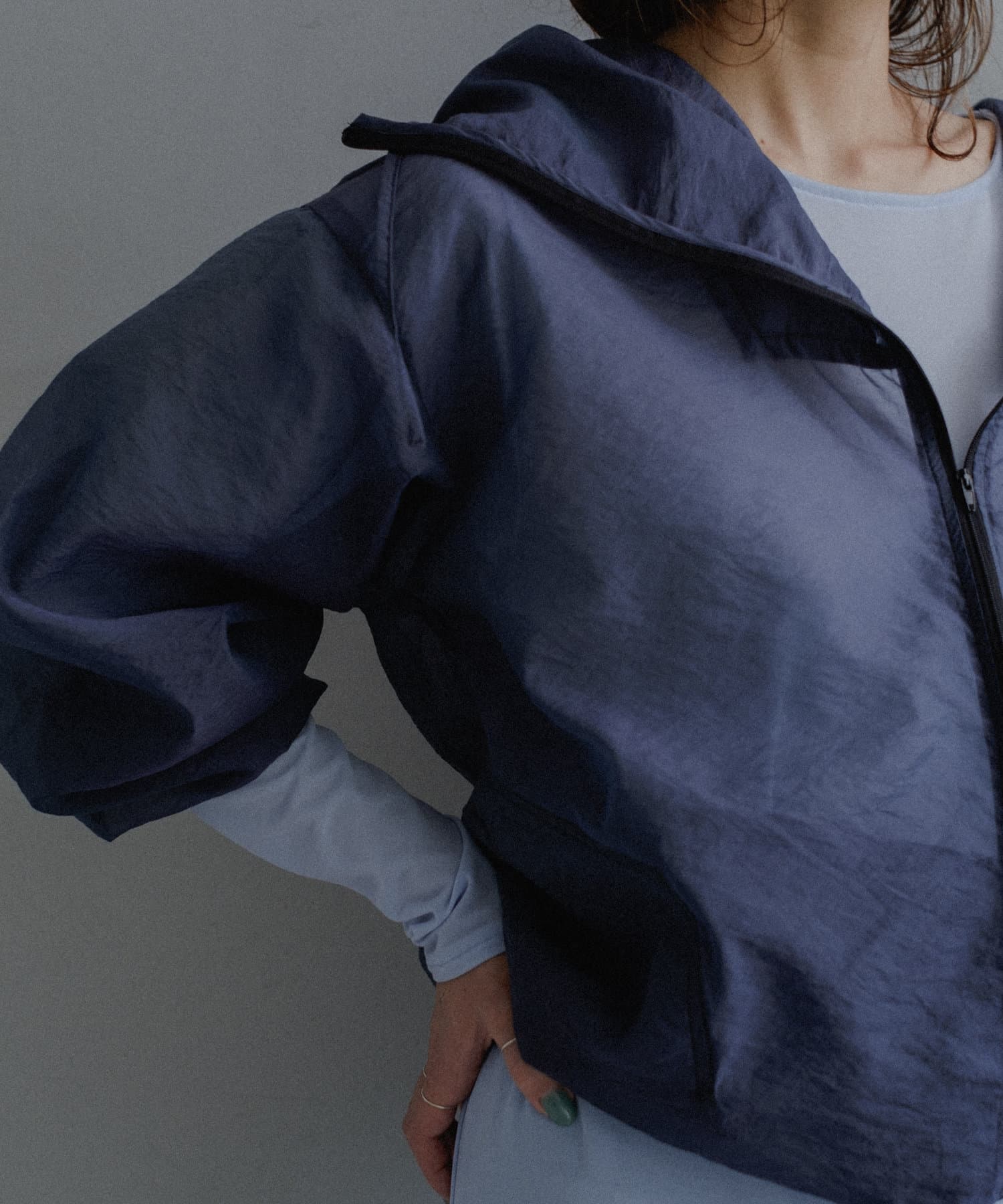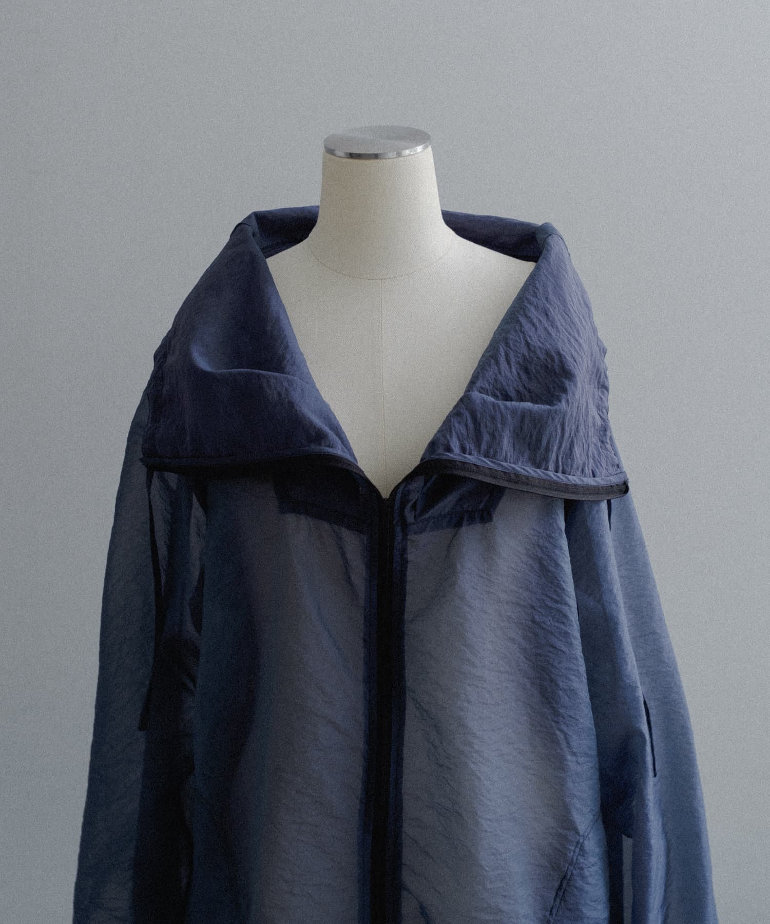 透け感とハリ感が気分を上げる、日本のオーガンジー生地を使用して作成したハイネックパーカー。春はマニッシュなジャケットの中にレイヤードしたり、夏はスリーブレスのアイテムに羽織れる、軽くて涼しげなサマーシャツパーカーとしても活躍します。