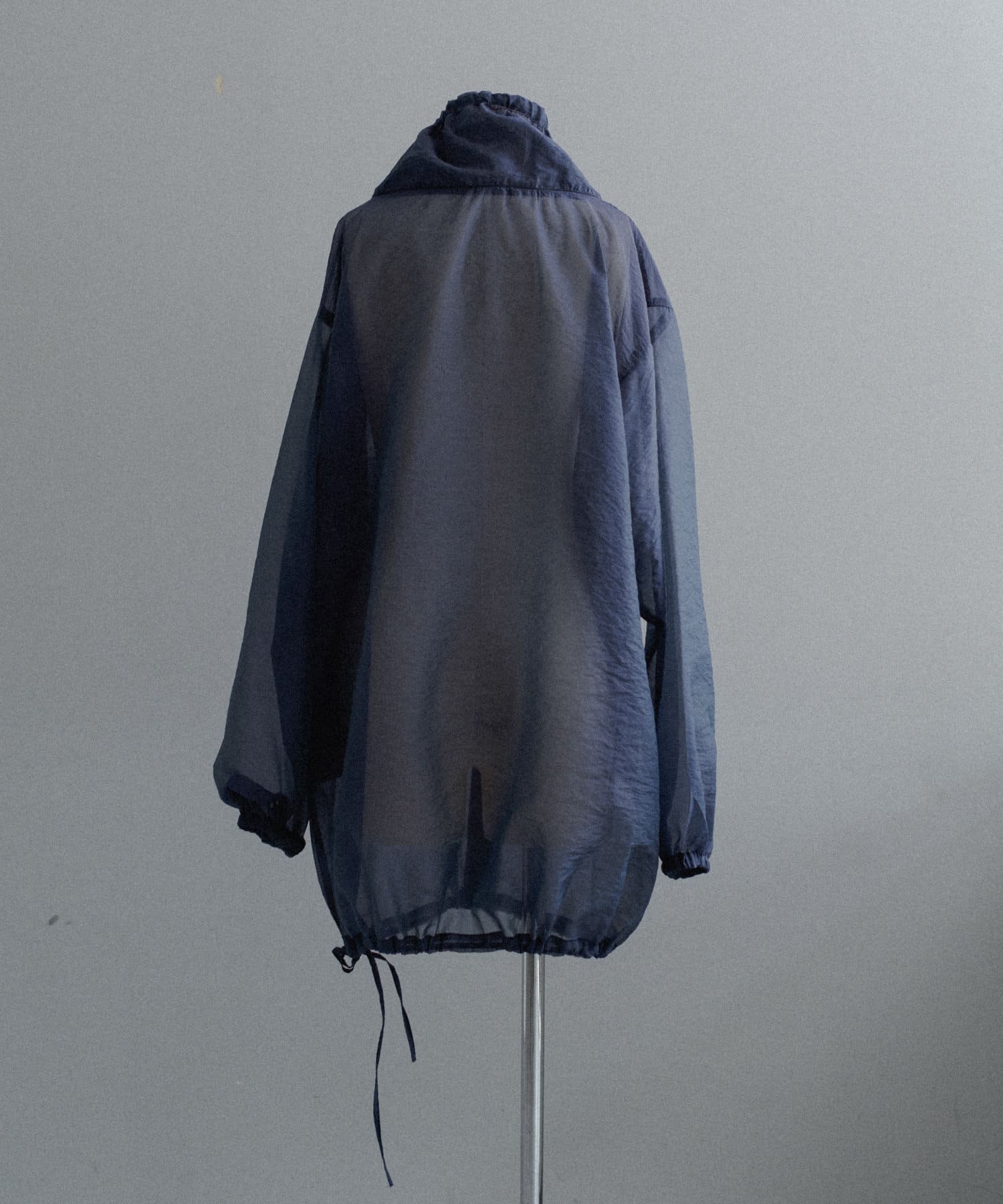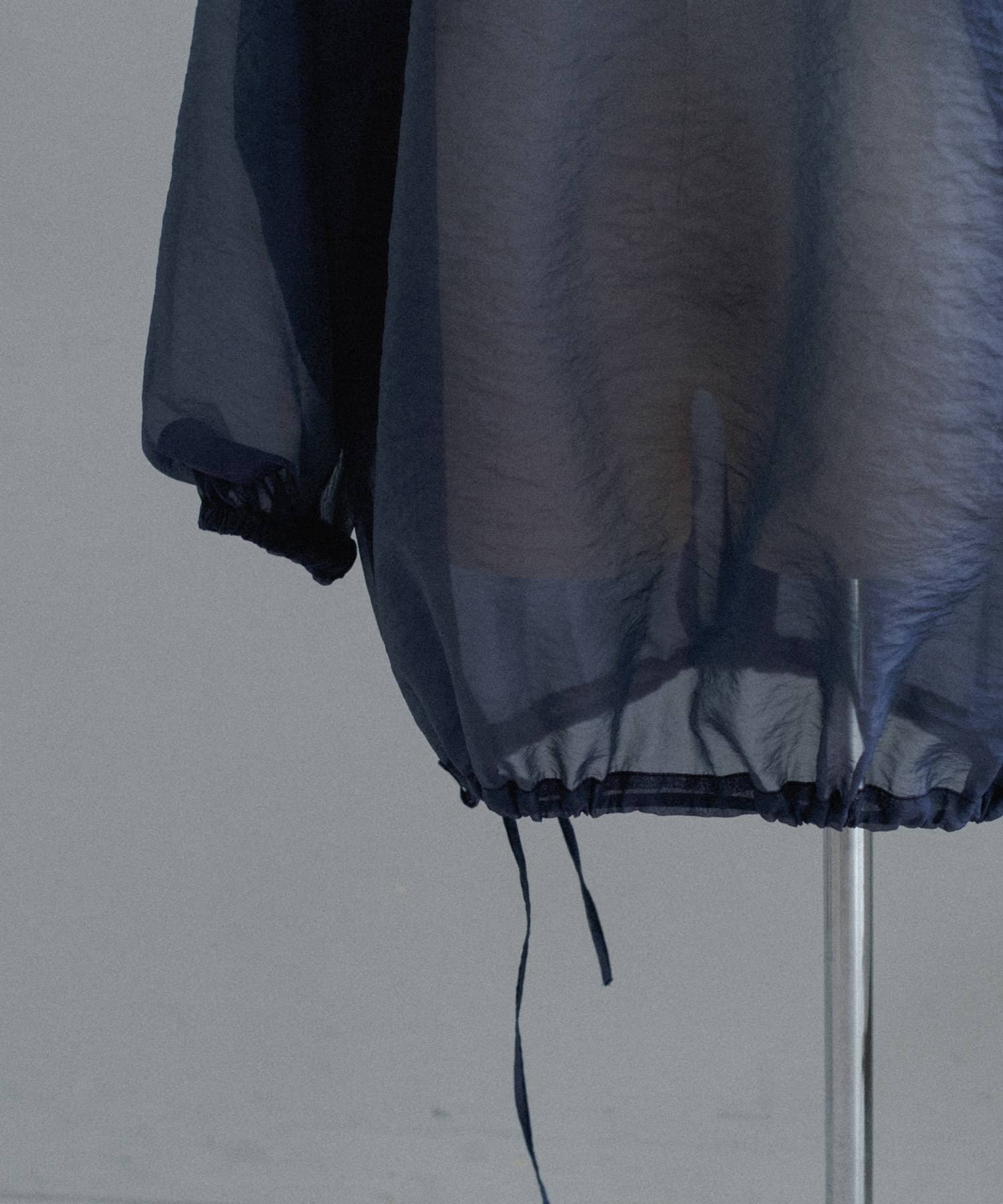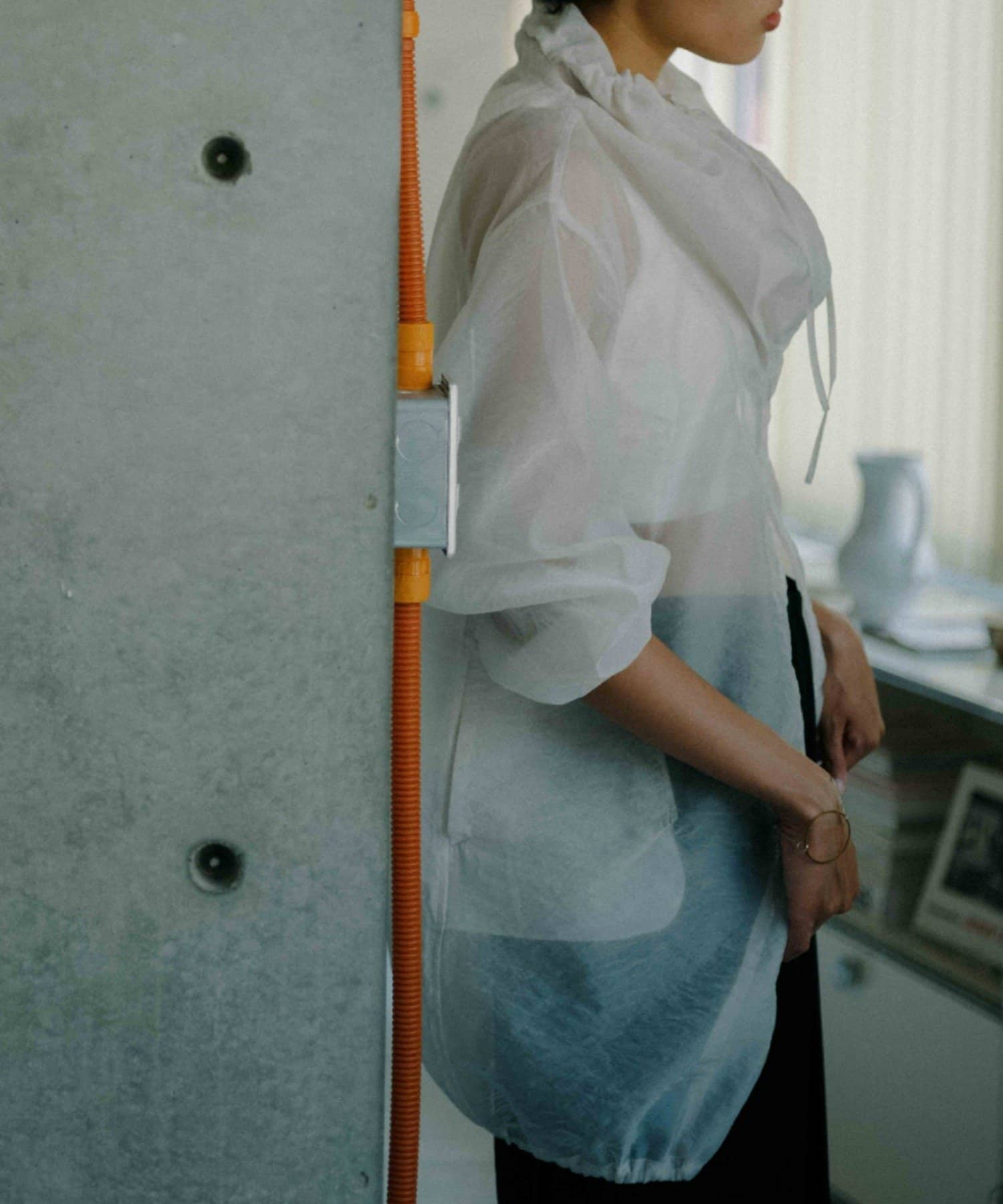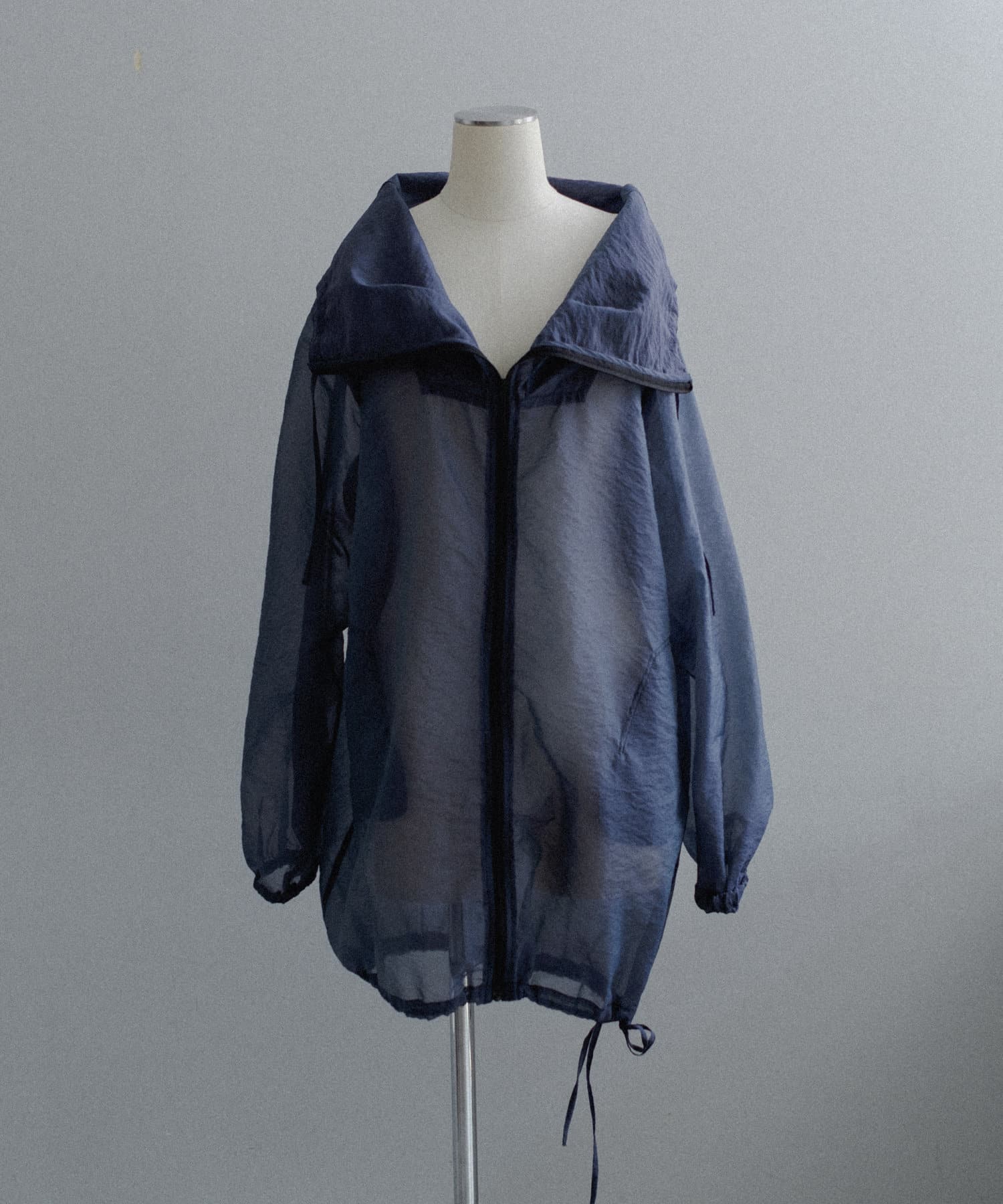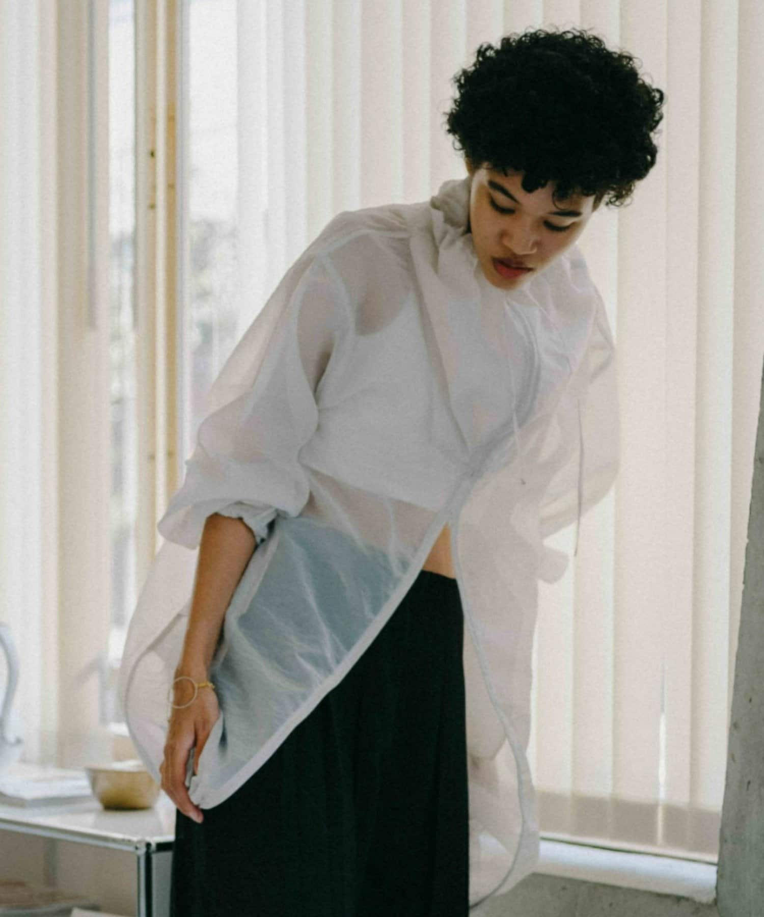 透け感とハリ感が気分を上げる、日本のオーガンジー生地を使用して作成したハイネックパーカー。春はマニッシュなジャケットの中にレイヤードしたり、夏はスリーブレスのアイテムに羽織れる、軽くて涼しげなサマーシャツパーカーとしても活躍します。