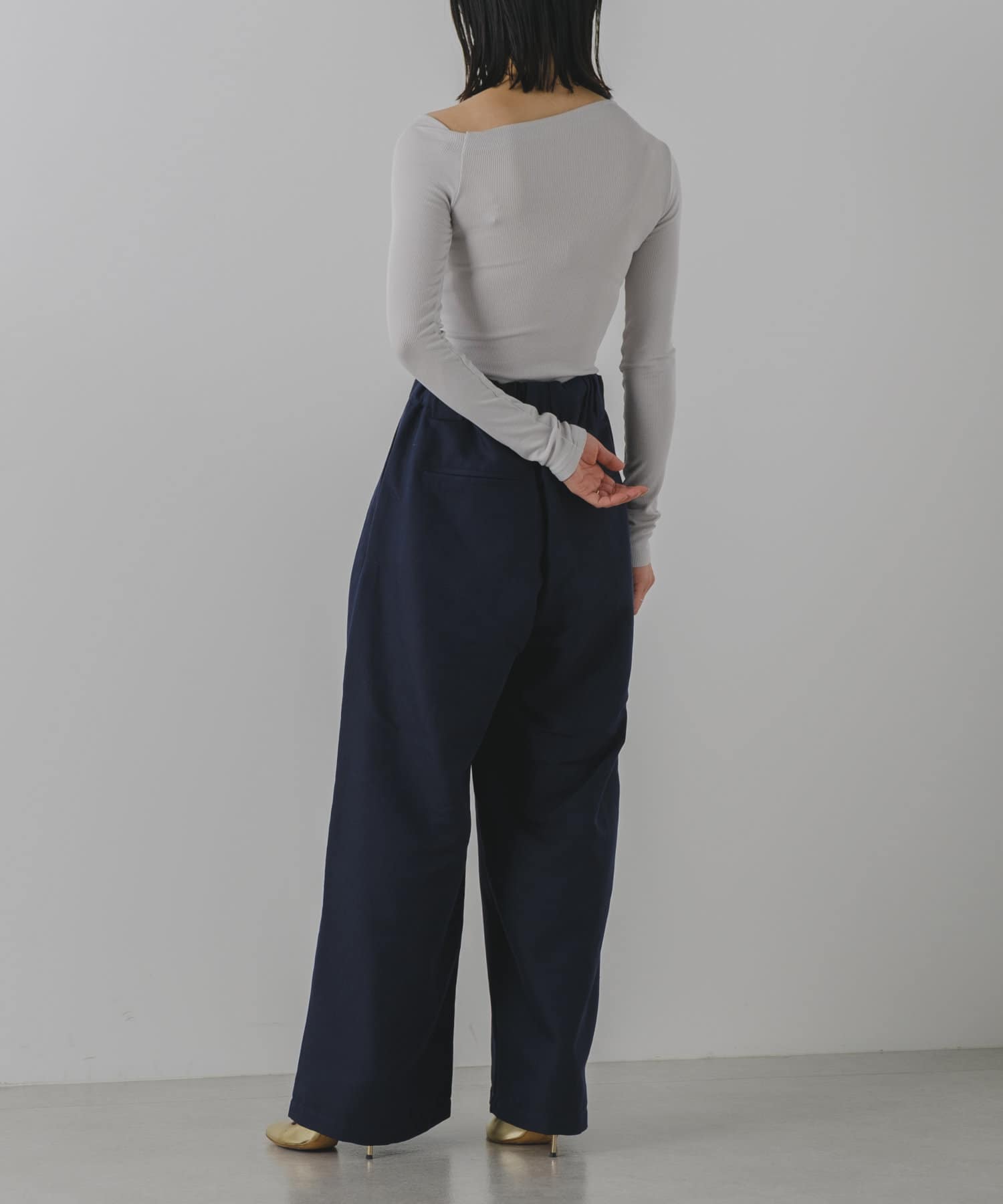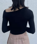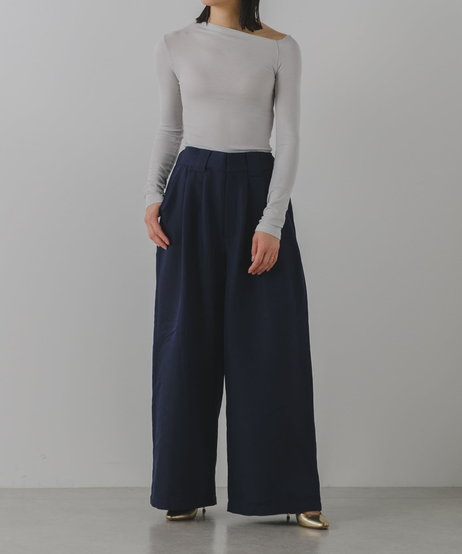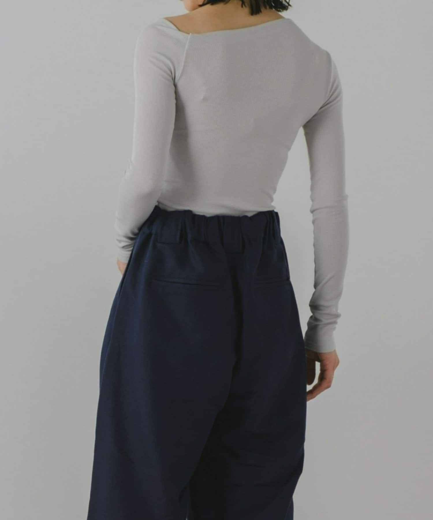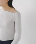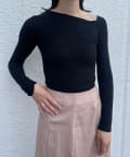 ネックのシルエットは片側の鎖骨がしっかりと見えるワンショルダーデザイン。生地にしっかりとキックバックがあるため開きが大きい割にずれ落ちにくく、ノンストレスで使用いただける1枚です。