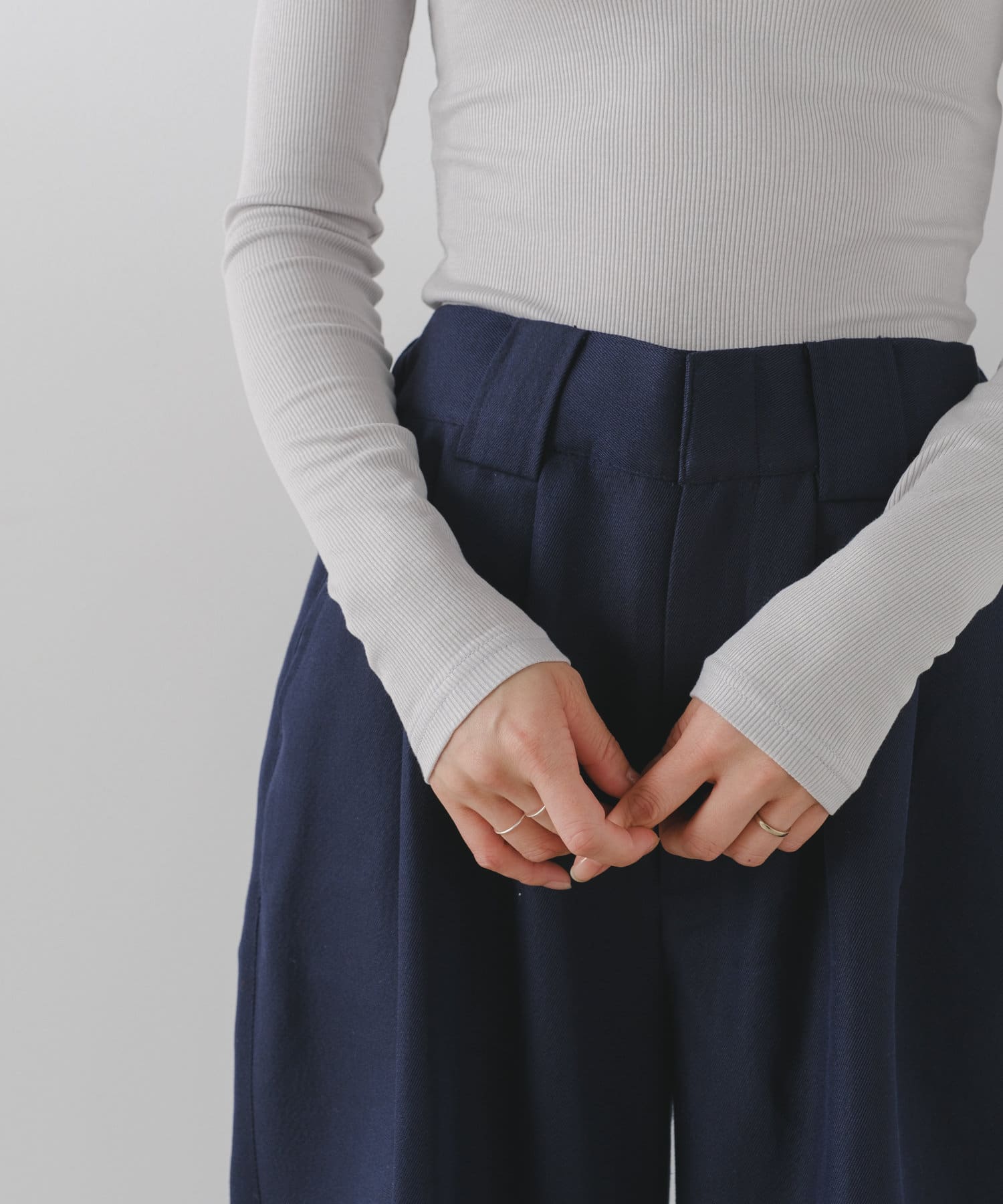 素材はレーヨンベースのリブカットソーで、柔らかくとろみ感のある生地を使用しています。着用した時の肌触りが非常に気持ち良いのが特徴です。