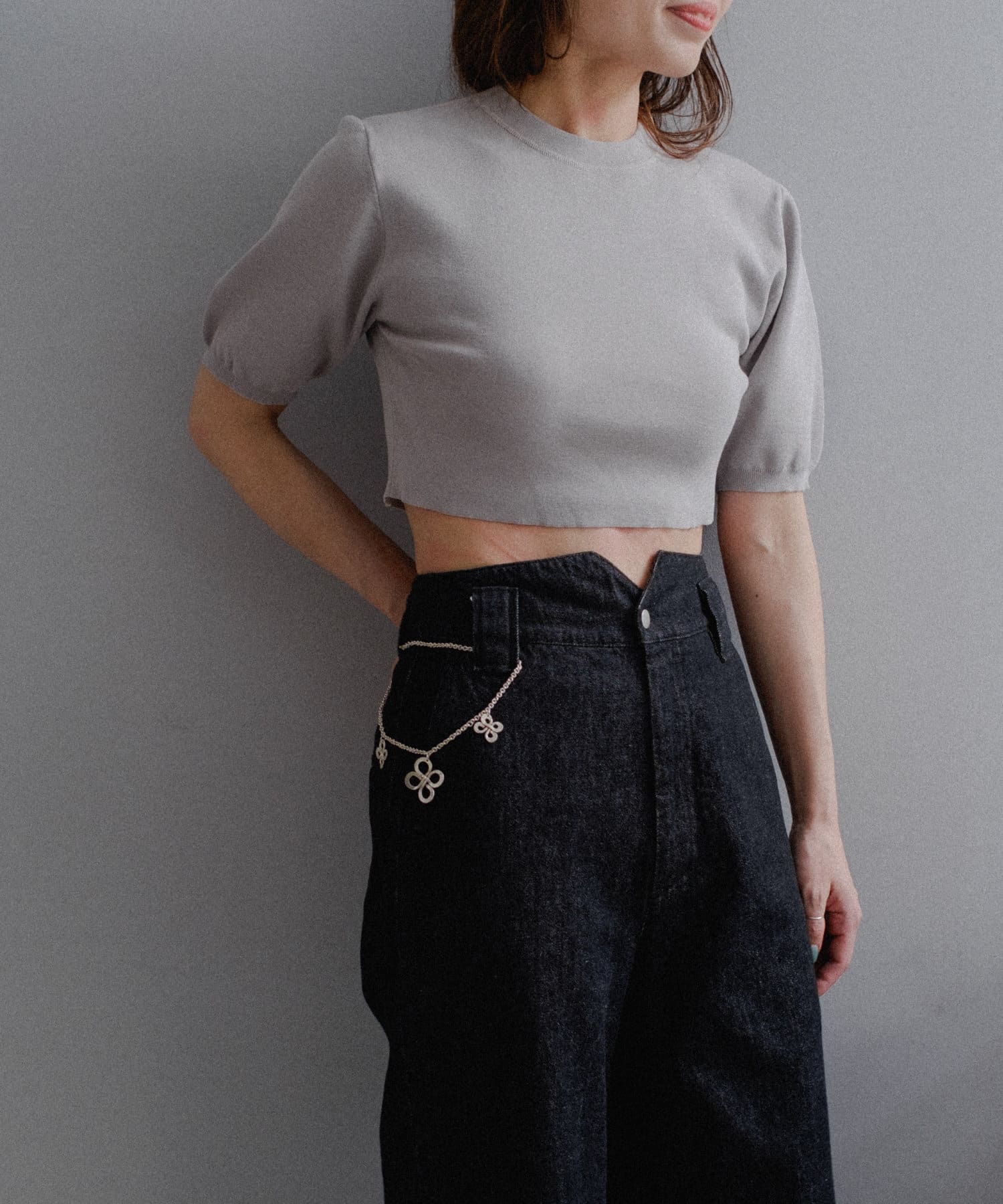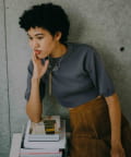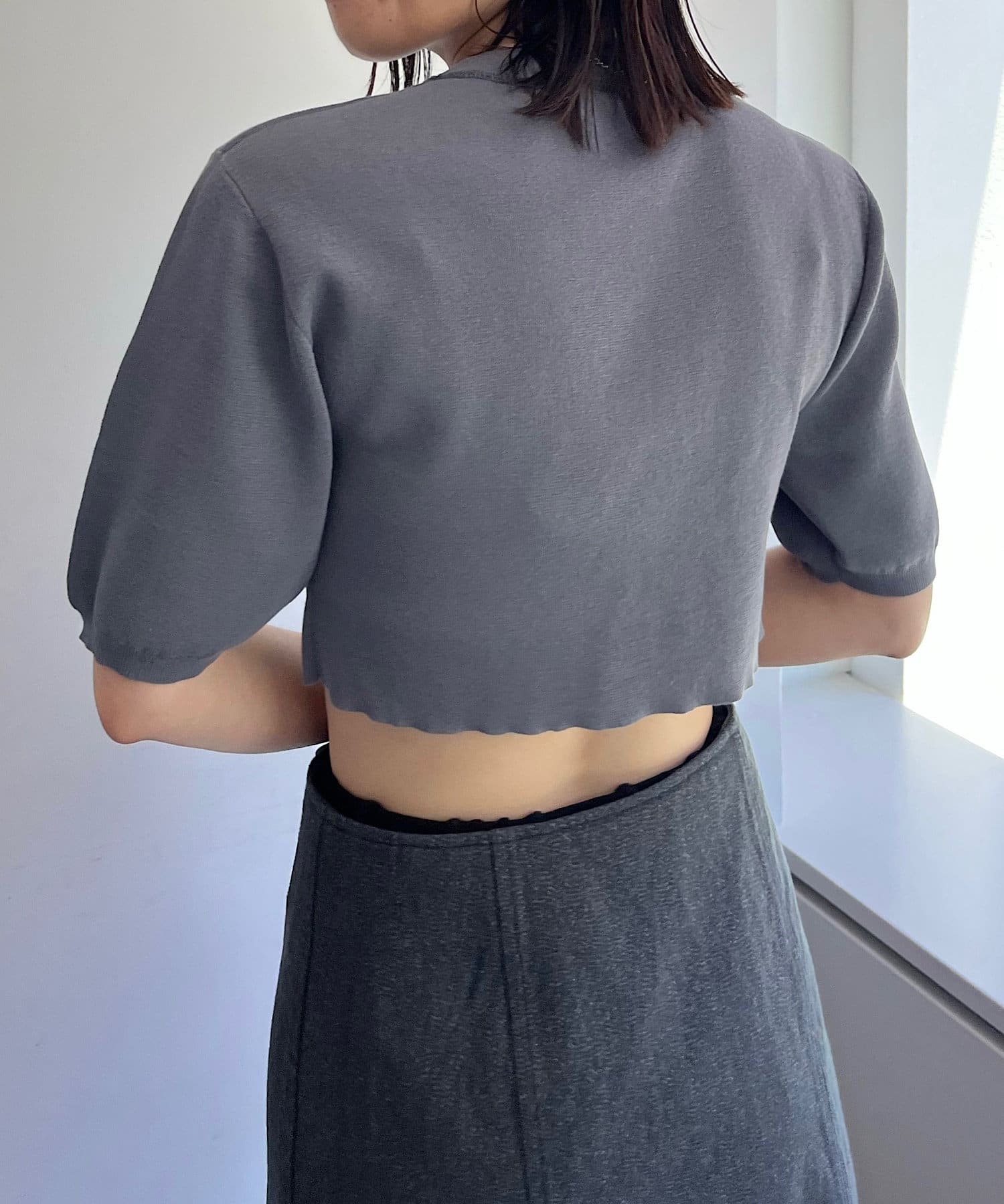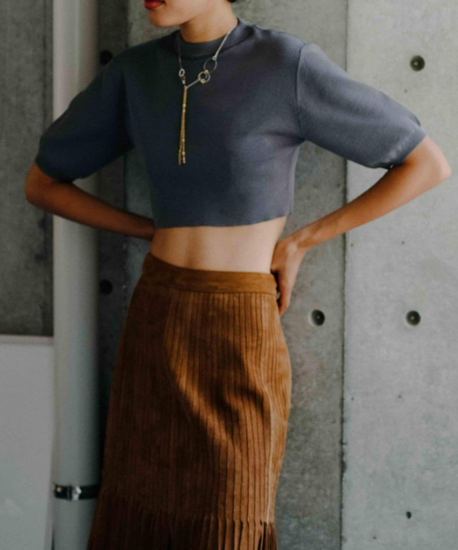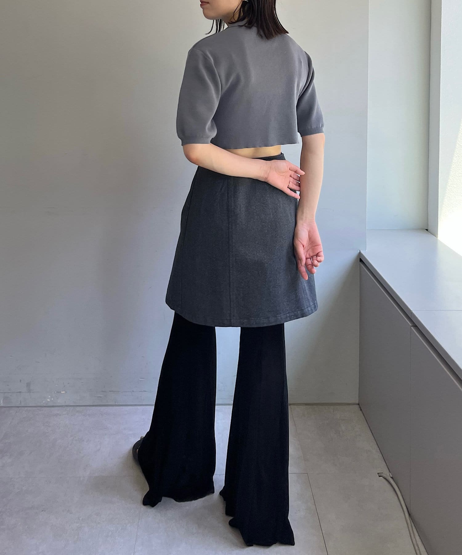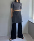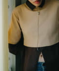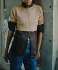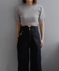 着丈はかなり短めな37cm設定。ハイウエストデニムや股上がしっかりと深めのボトムスとあわせて、ウエスト上部をちらりと見せて使うのがカッコいい。個人的には、シアーインナーやシャツを中に重ねて着て、ビスチェのような役割でレイヤードスタイルを楽しむのもお勧めです。