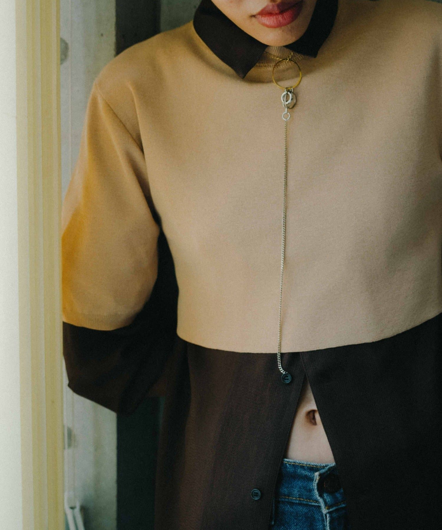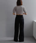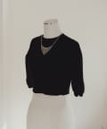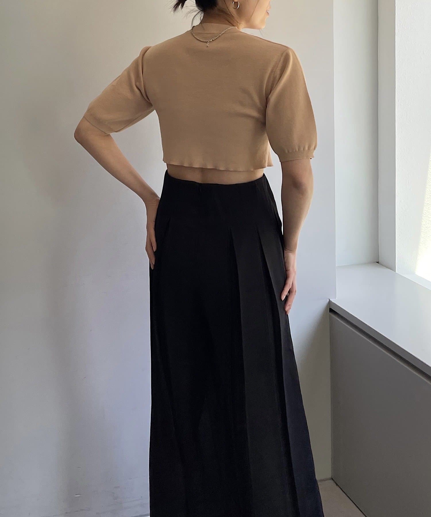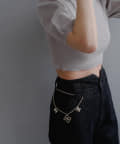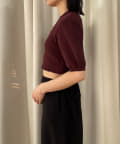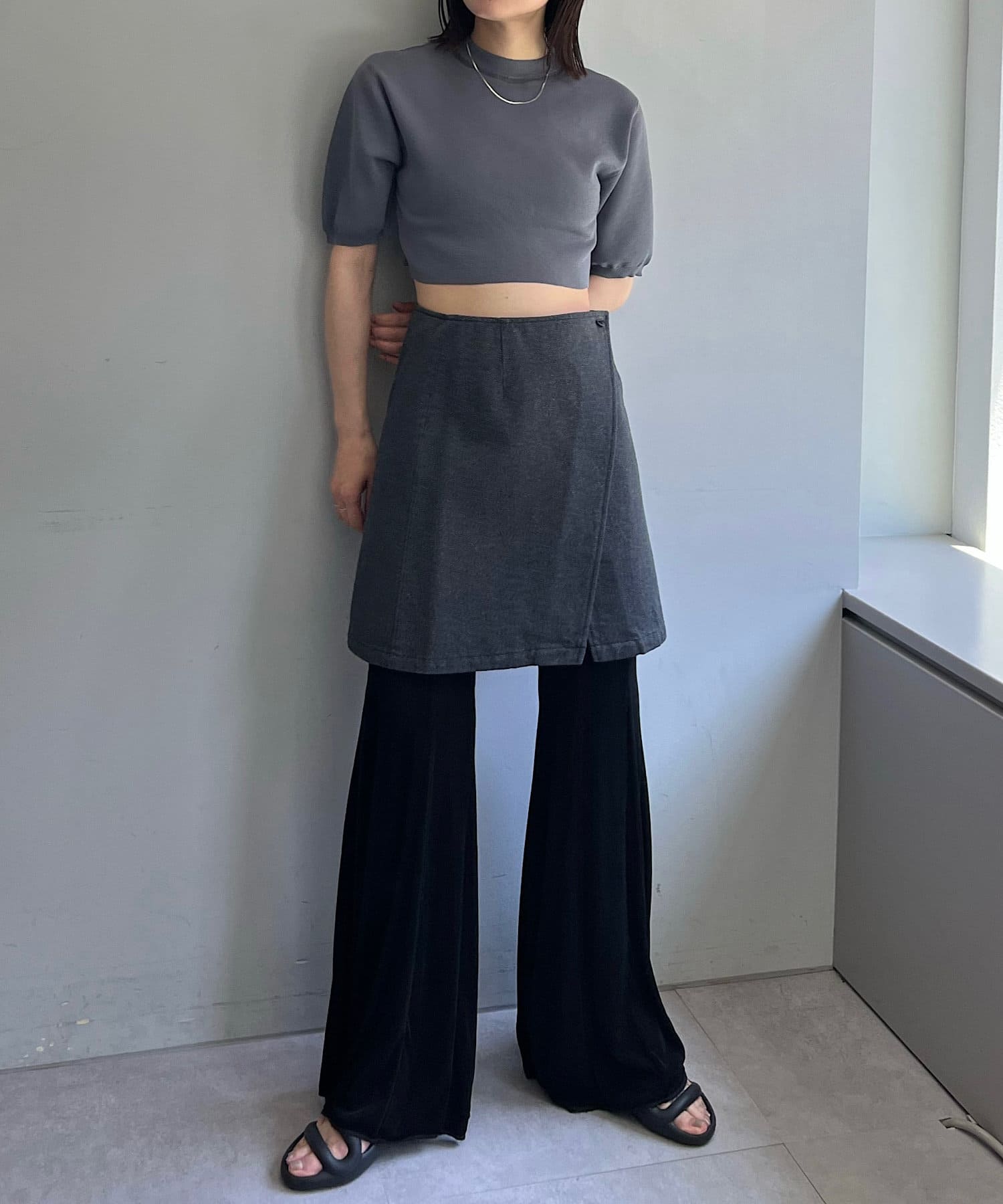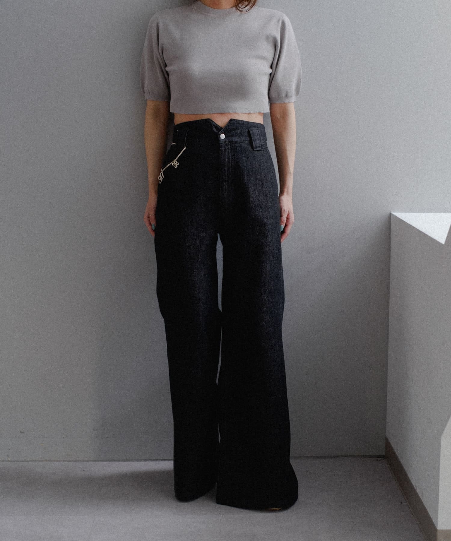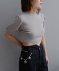 着丈はかなり短めな37cm設定。ハイウエストデニムや股上がしっかりと深めのボトムスとあわせて、ウエスト上部をちらりと見せて使うのがカッコいい。個人的には、シアーインナーやシャツを中に重ねて着て、ビスチェのような役割でレイヤードスタイルを楽しむのもお勧めです。